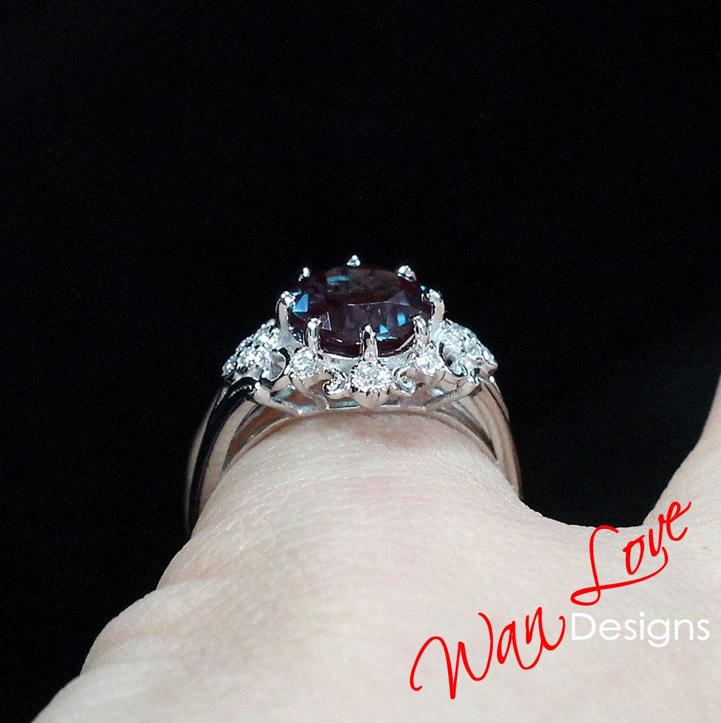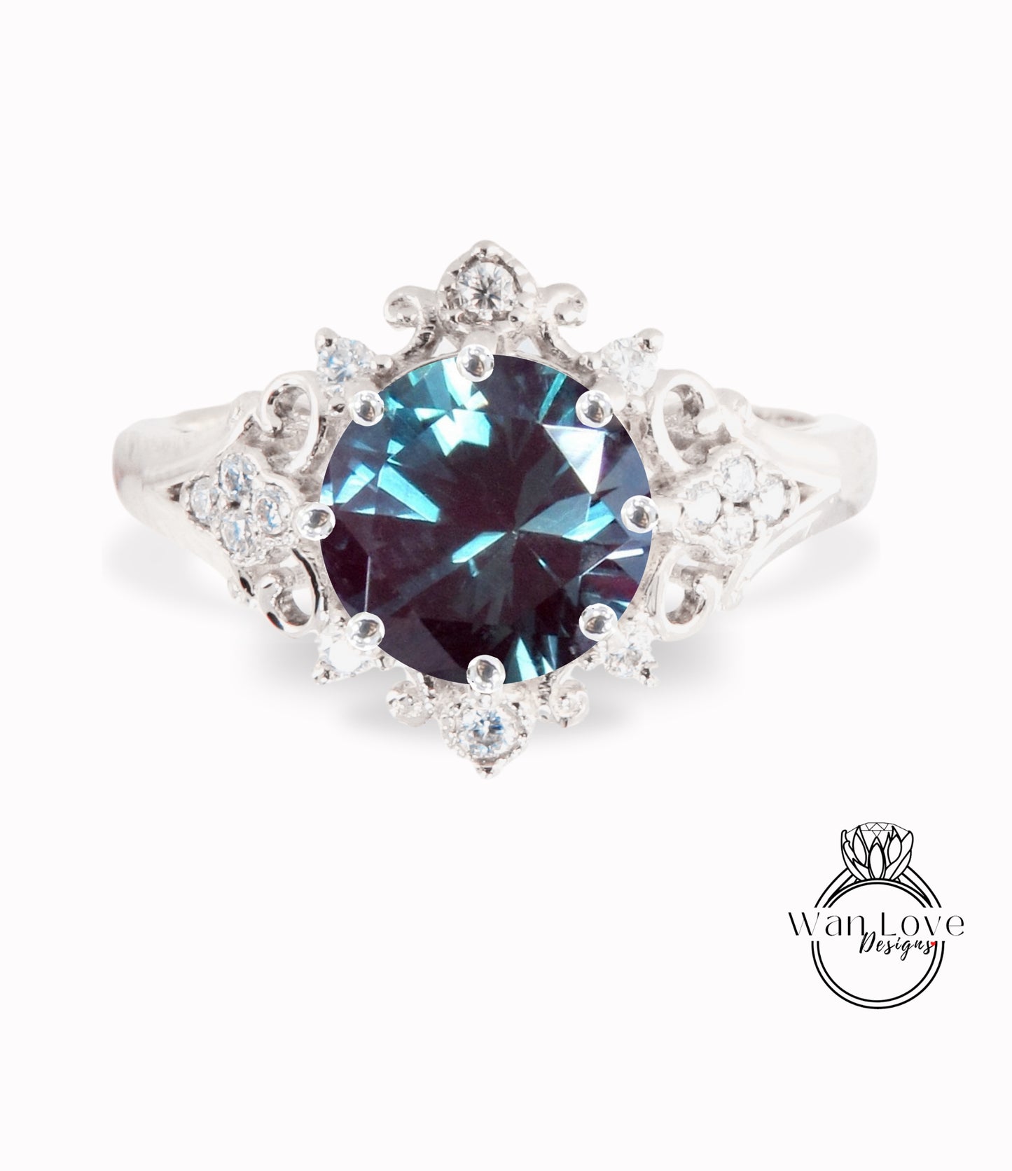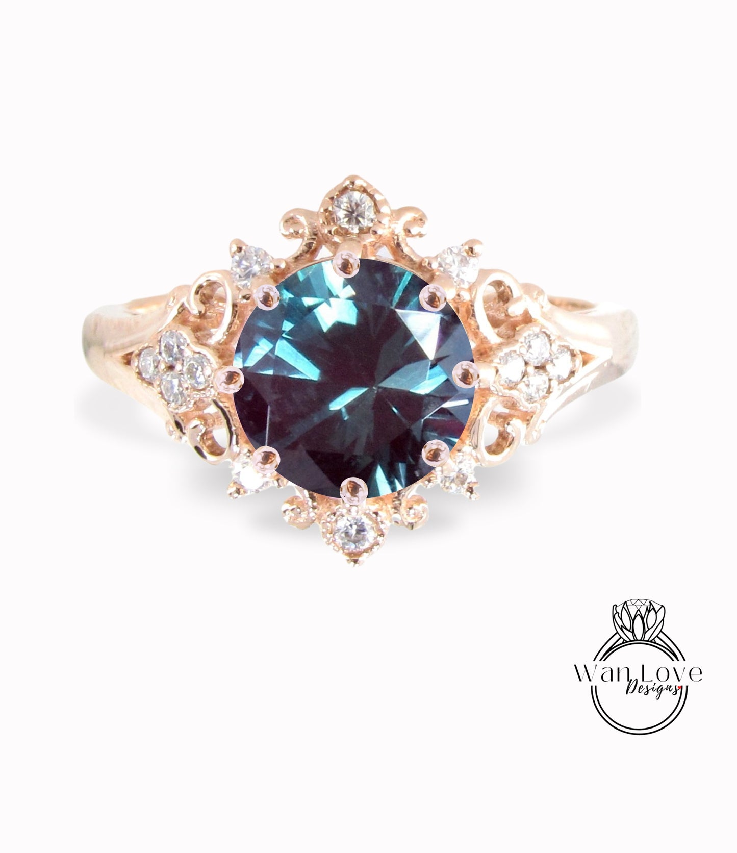Alexandrite & Diamonds Ornate Floral Quatrefoil Engagement Ring, Round Antique Custom Vintage Bridal Wedding ring, Anniversary Gift