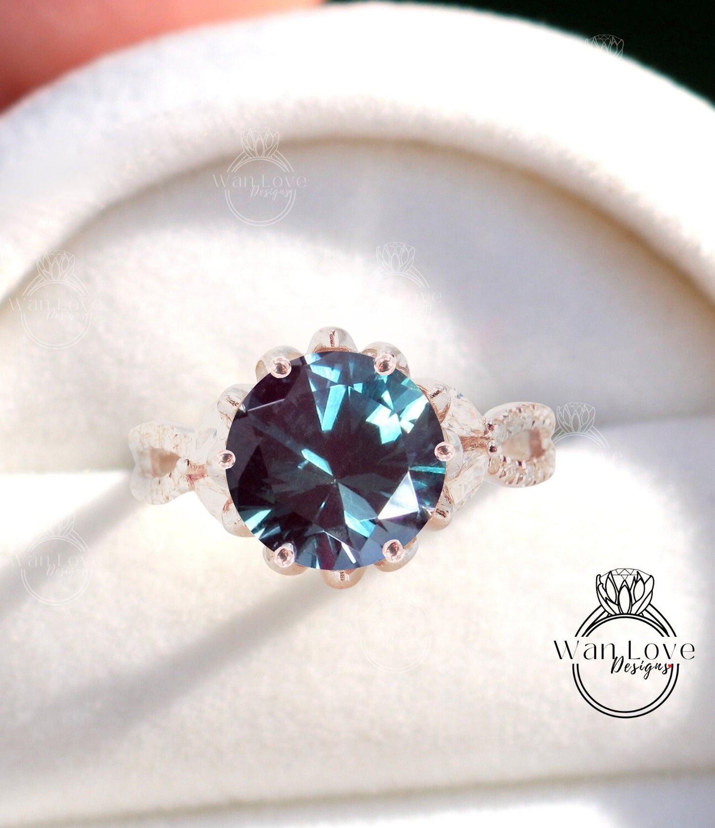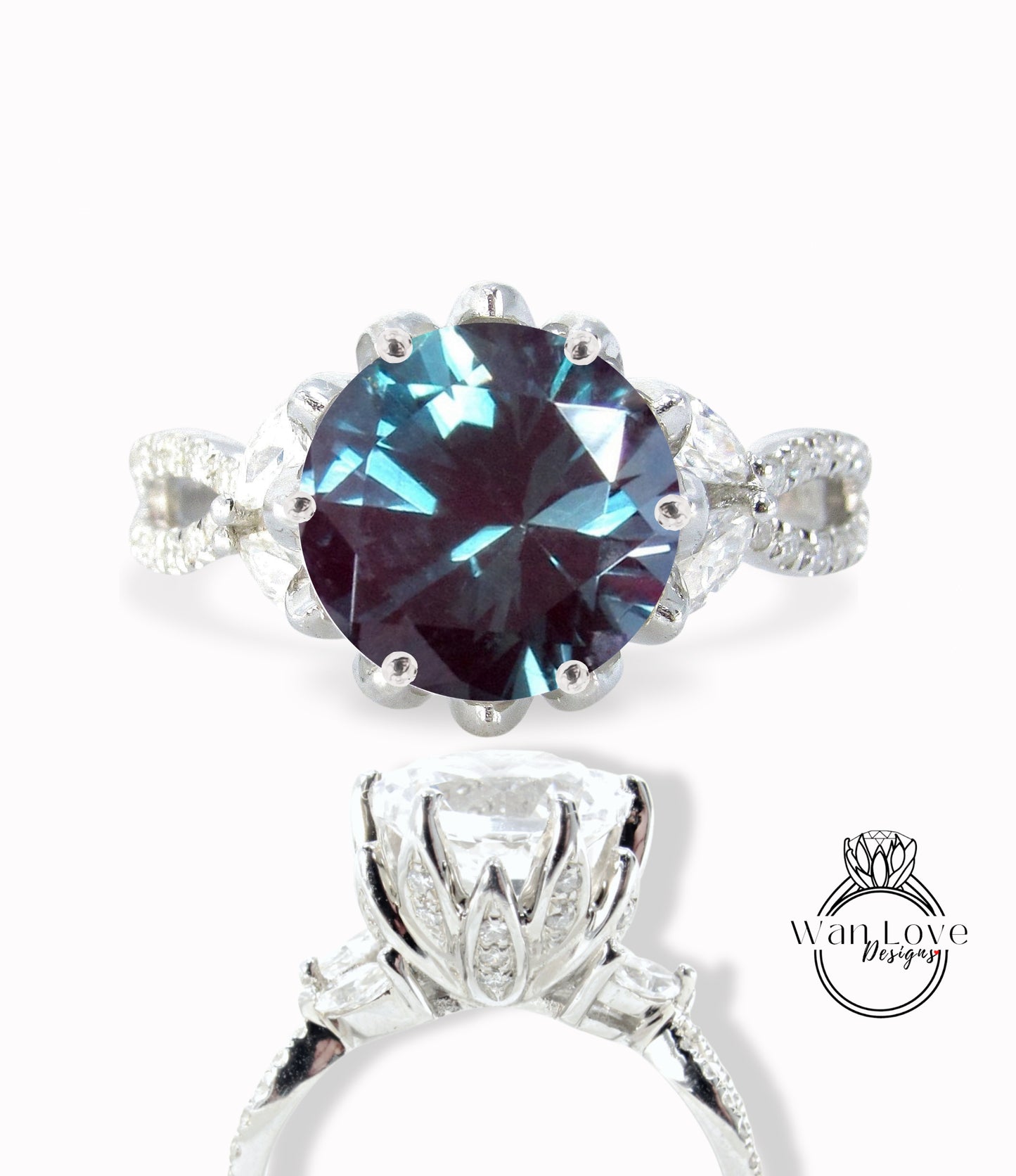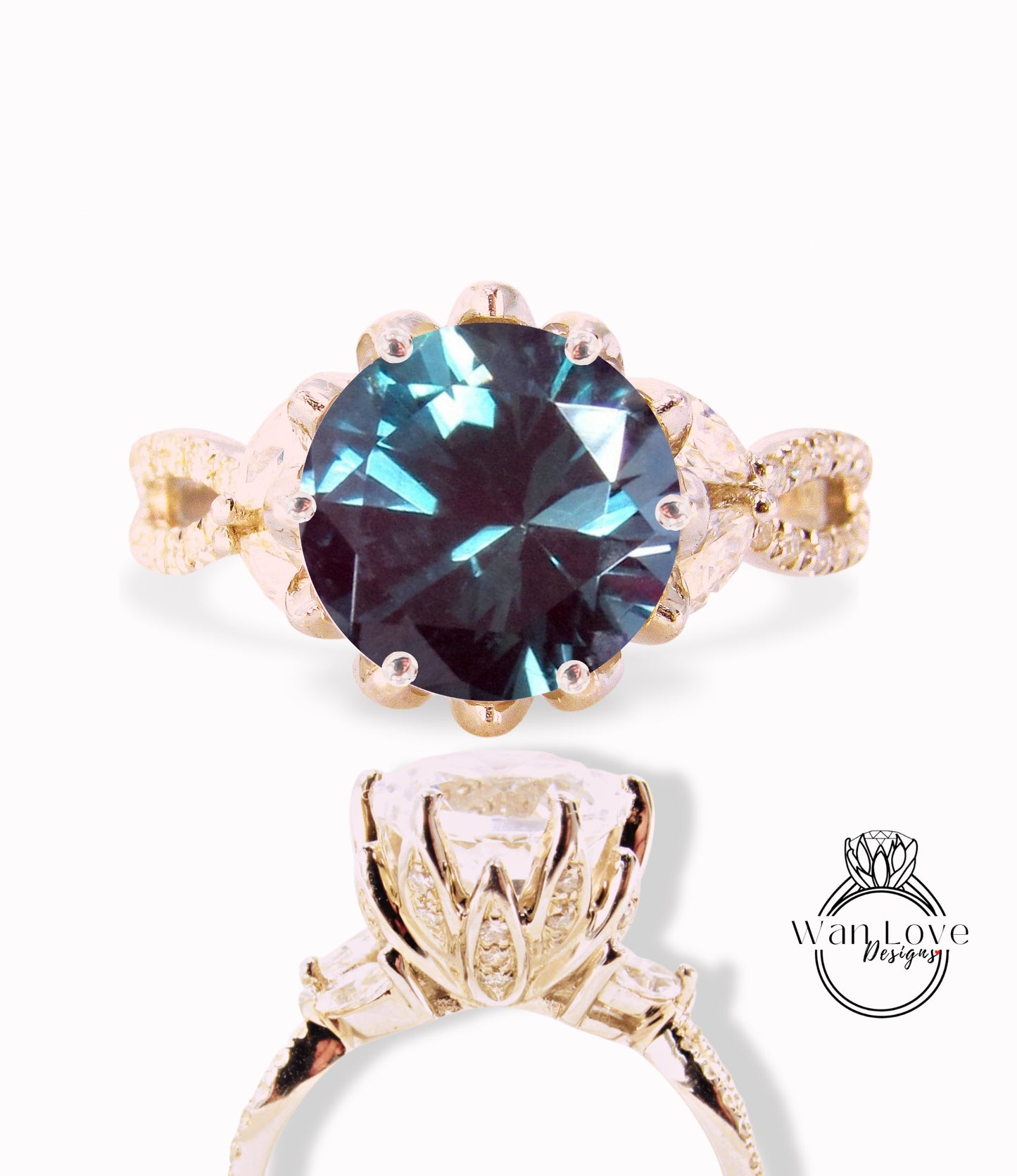 Vintage Alexandrite Diamond Lotus Flower Ring Marquise Leaf Split Shank Engagement Ring antique flower round ring wedding promise ring