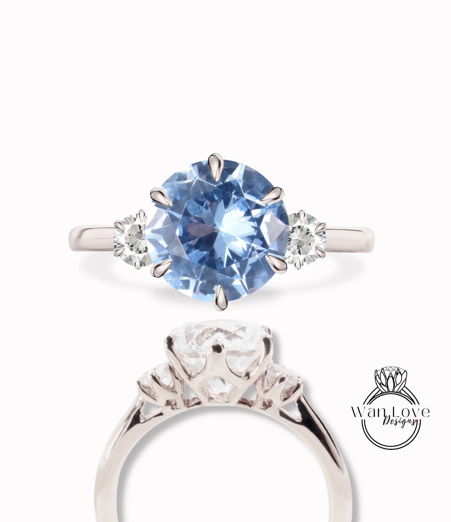 Aquamarine Blue Spinel & Diamond 3 gem Stone Engagement Ring Round three gemstone ring 14k 18k White Yellow Rose Gold Platinum-Custom-Wedding Anniversary Gift