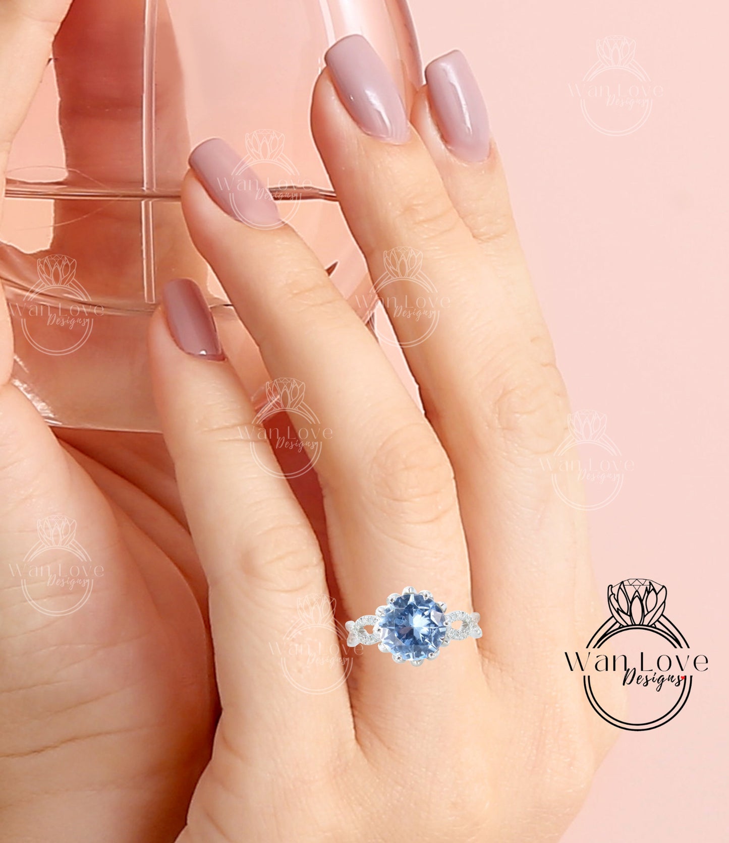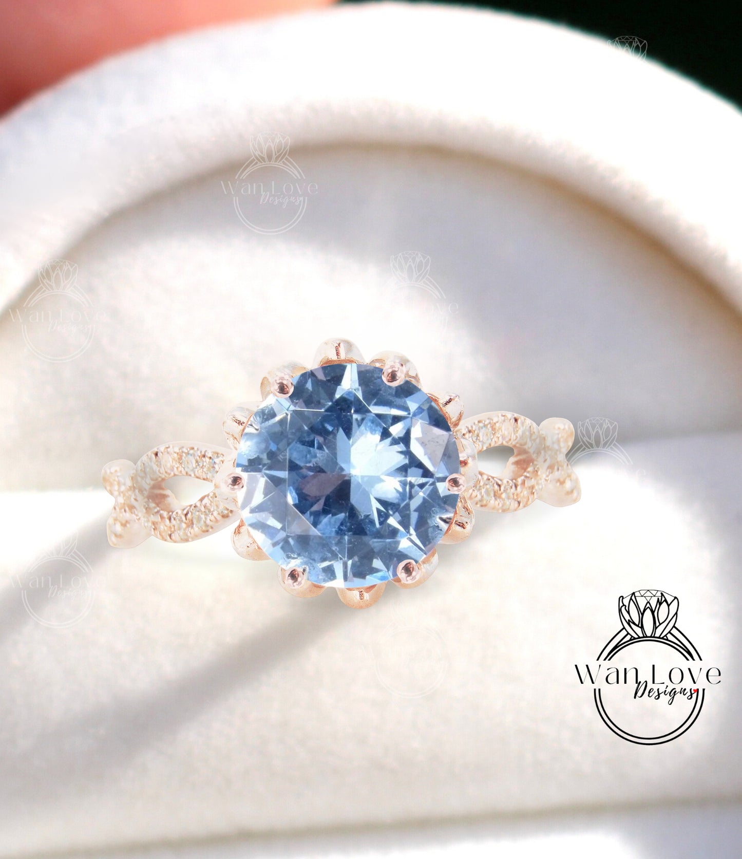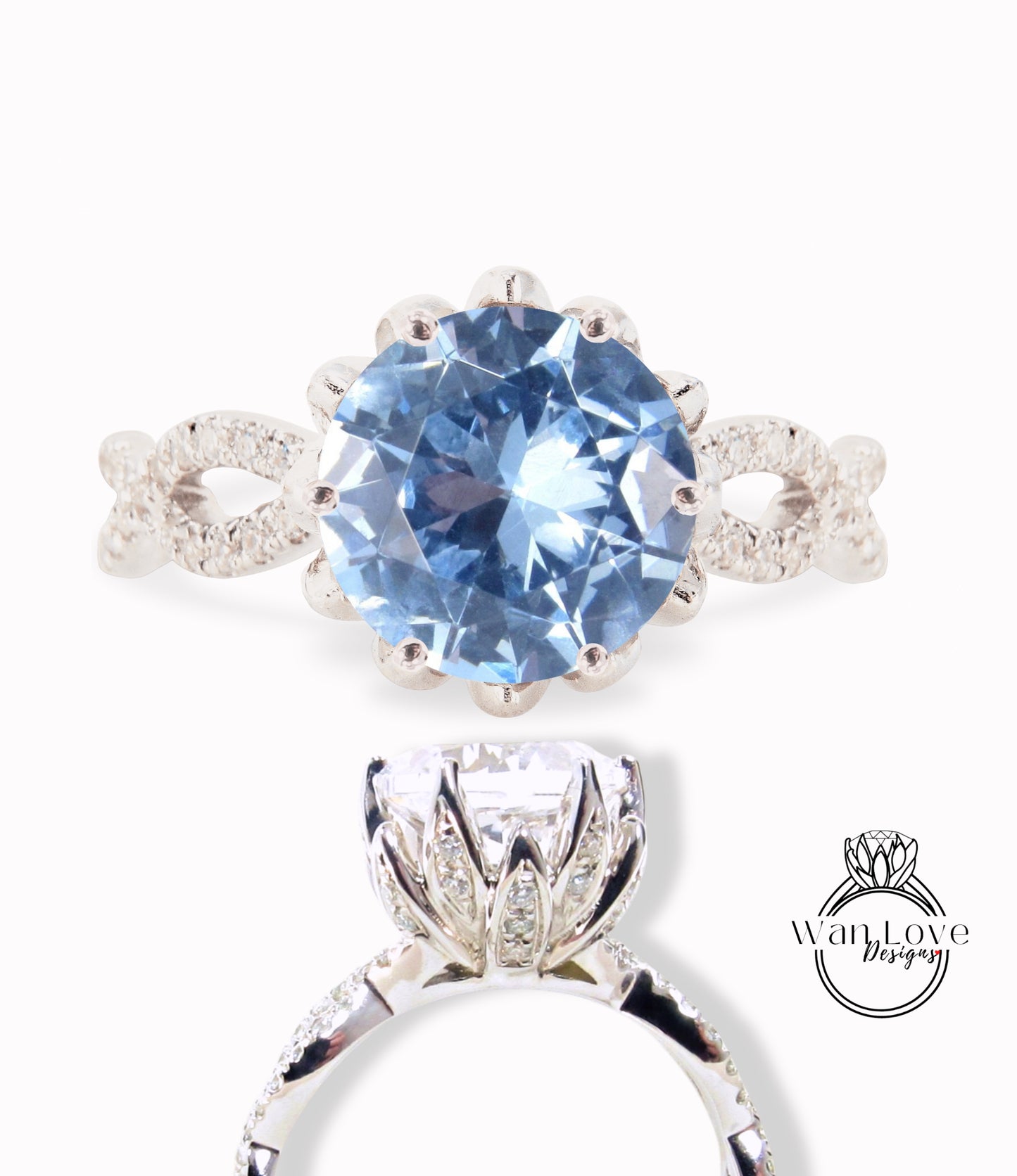 Aquamarine Blue Spinel & Diamond Lotus Flower Infinity Twisted Round Engagement Ring, 14kt 18kt Gold-Platinum-Custom-Wedding ring-Anniversary Gift