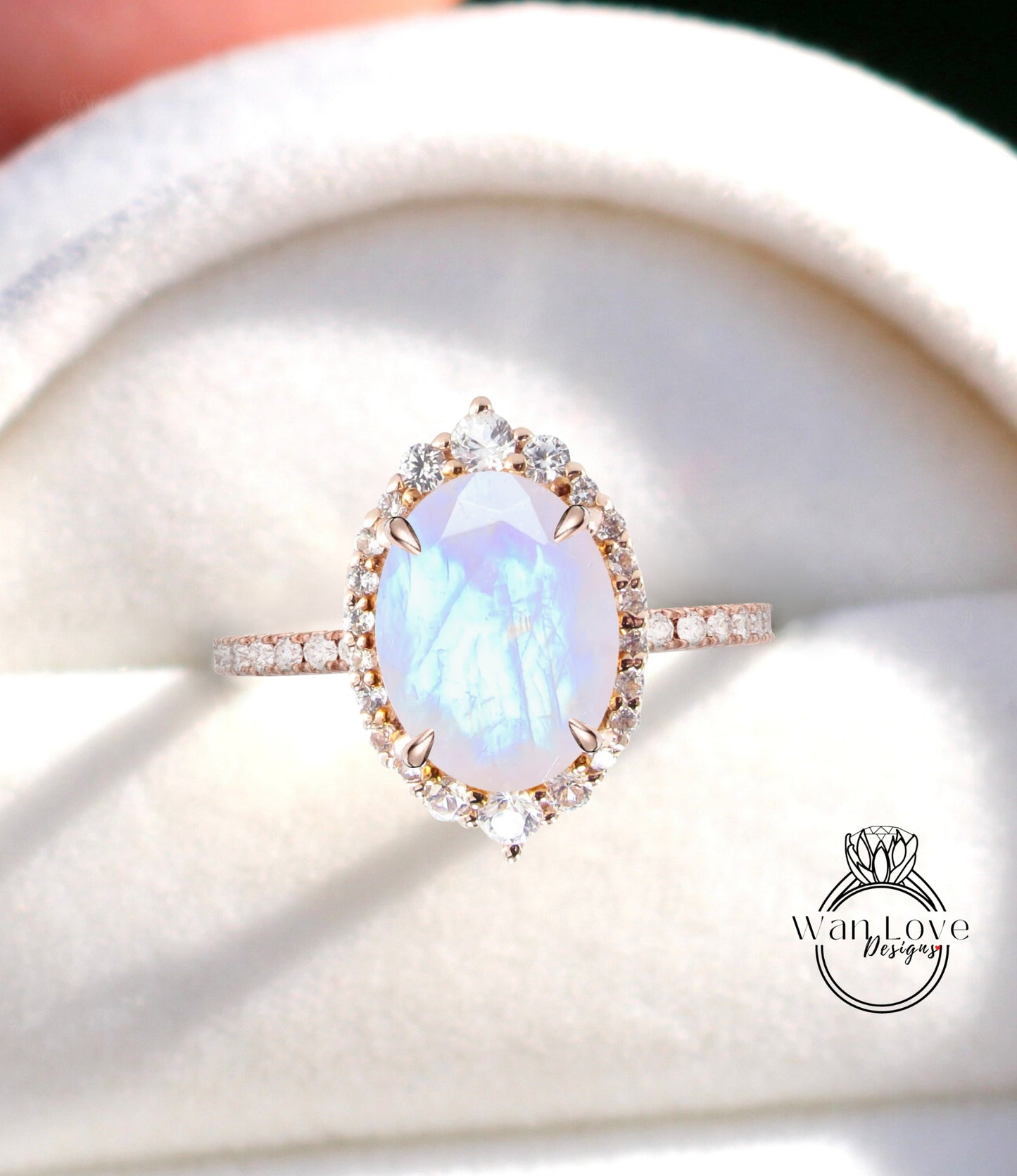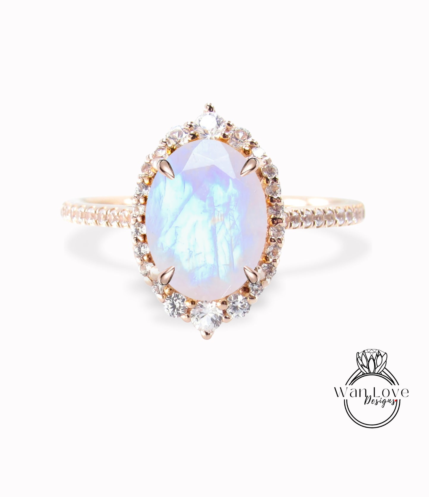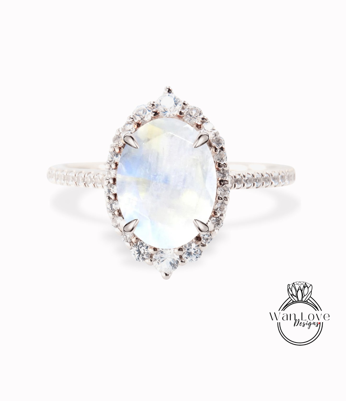 Moonstone & Diamonds Oval Graduated Halo Engagement Ring, Custom, Wedding, 14kt 18kt Gold, Platinum, WanLoveDesigns