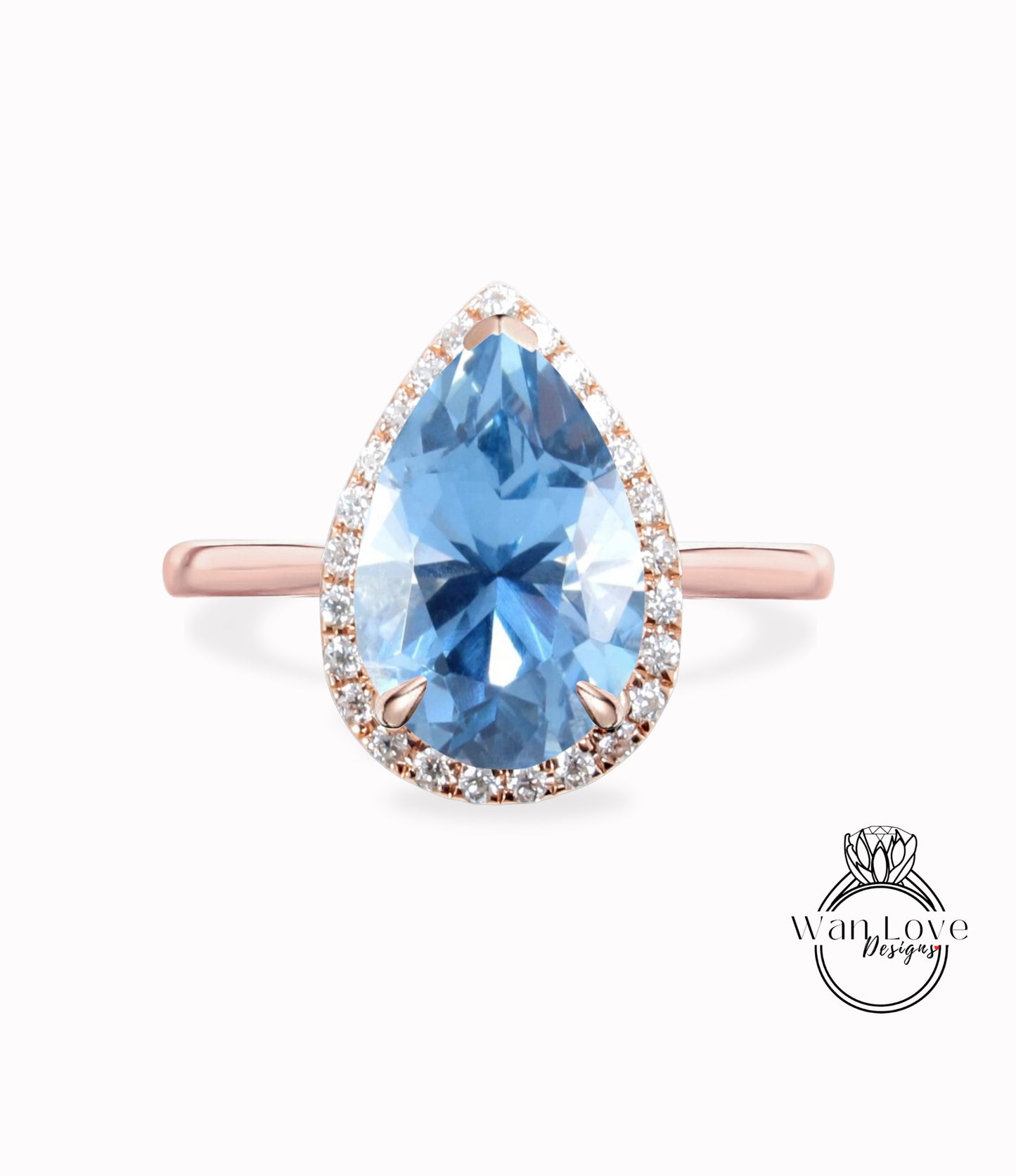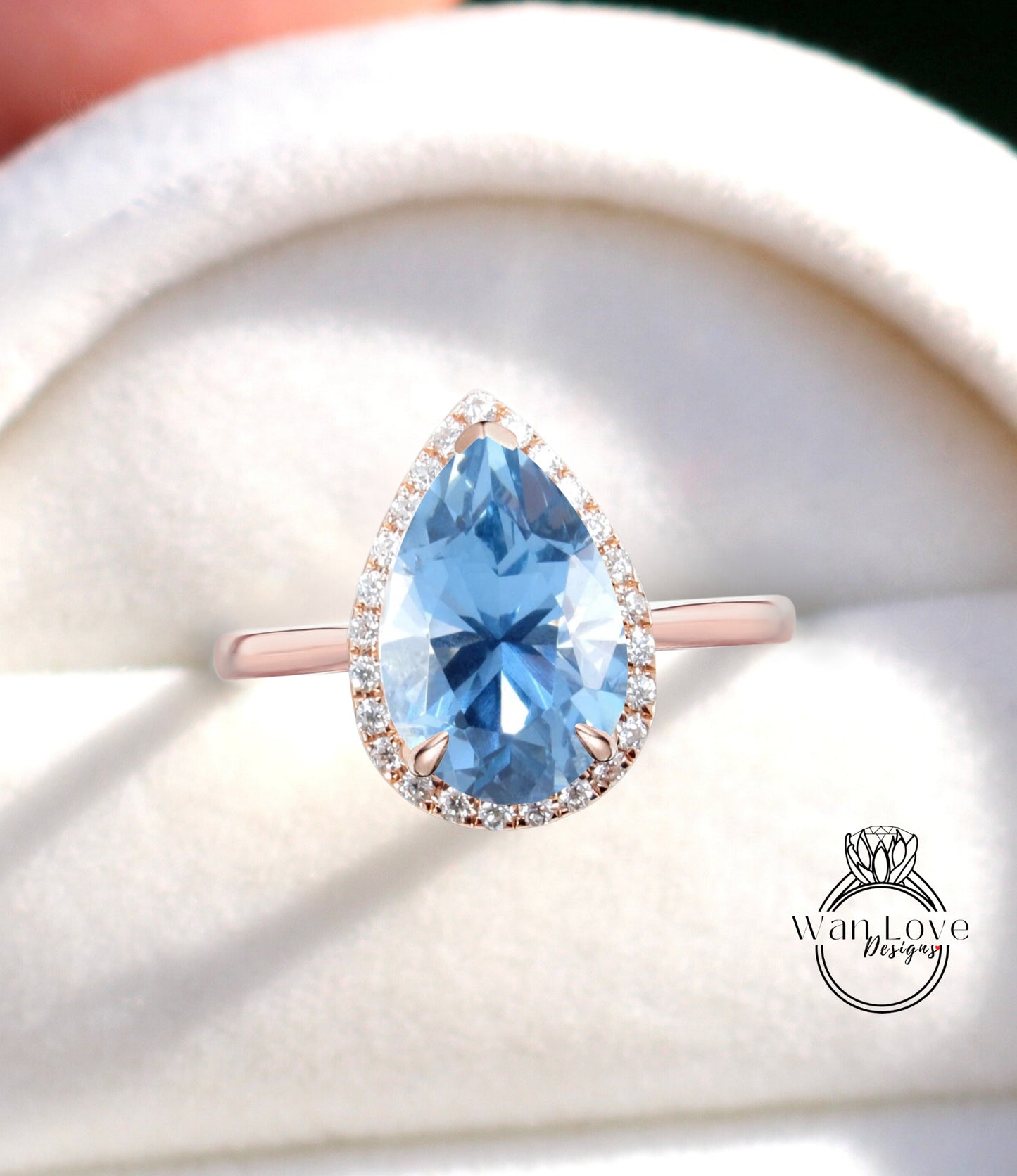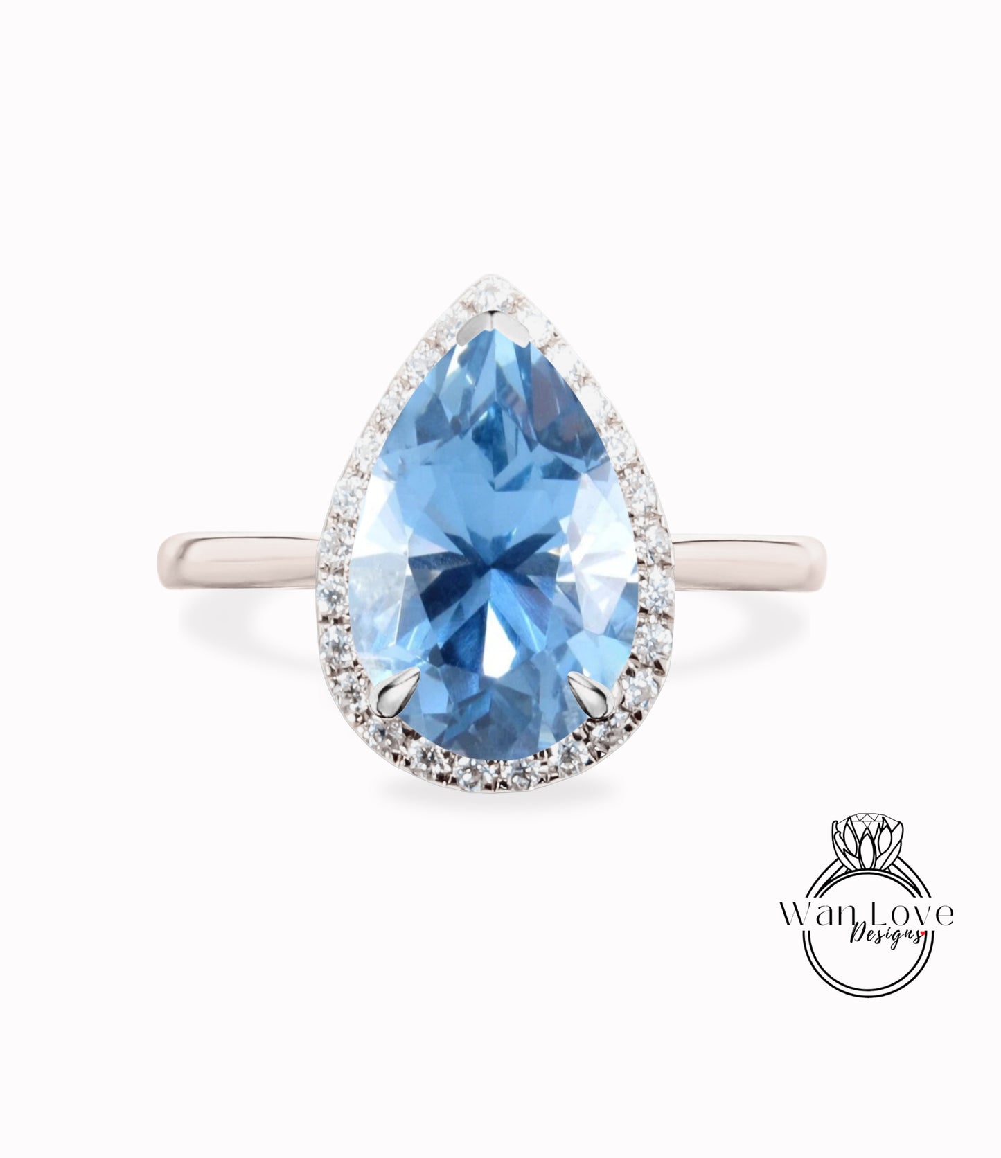 Aquamarine Blue Spinel & Diamond Pear Halo Engagement Ring,Plain Shank, Custom-14k 18k White Yellow Rose Gold-Platinum, Platinum