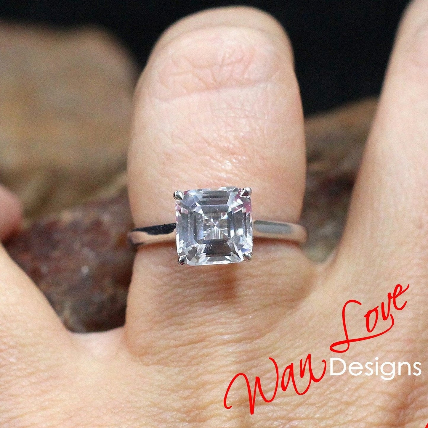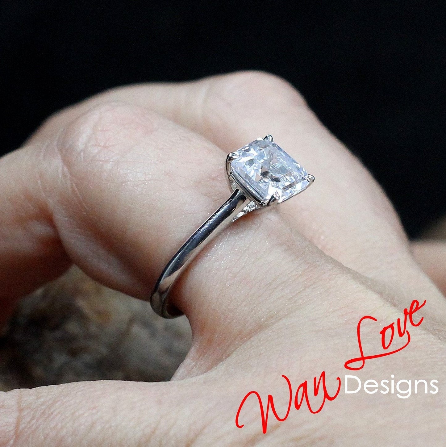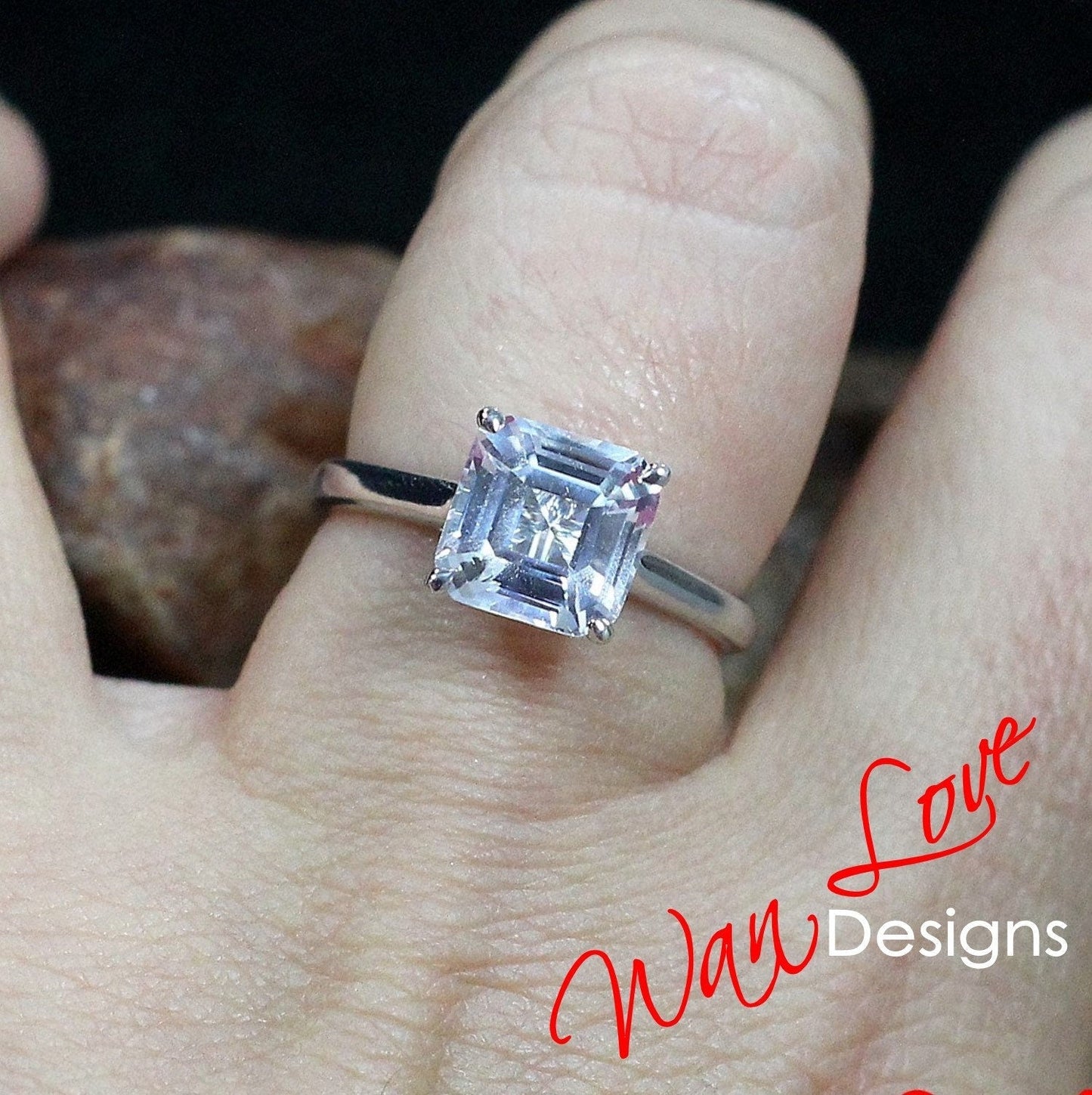 Asscher White Sapphire Engagement Ring, 4 Prong, Solitaire, 2.5 3 ct, 8mm, 925 Silver w Rhodium, Wedding, Anniversary, Ready to Ship