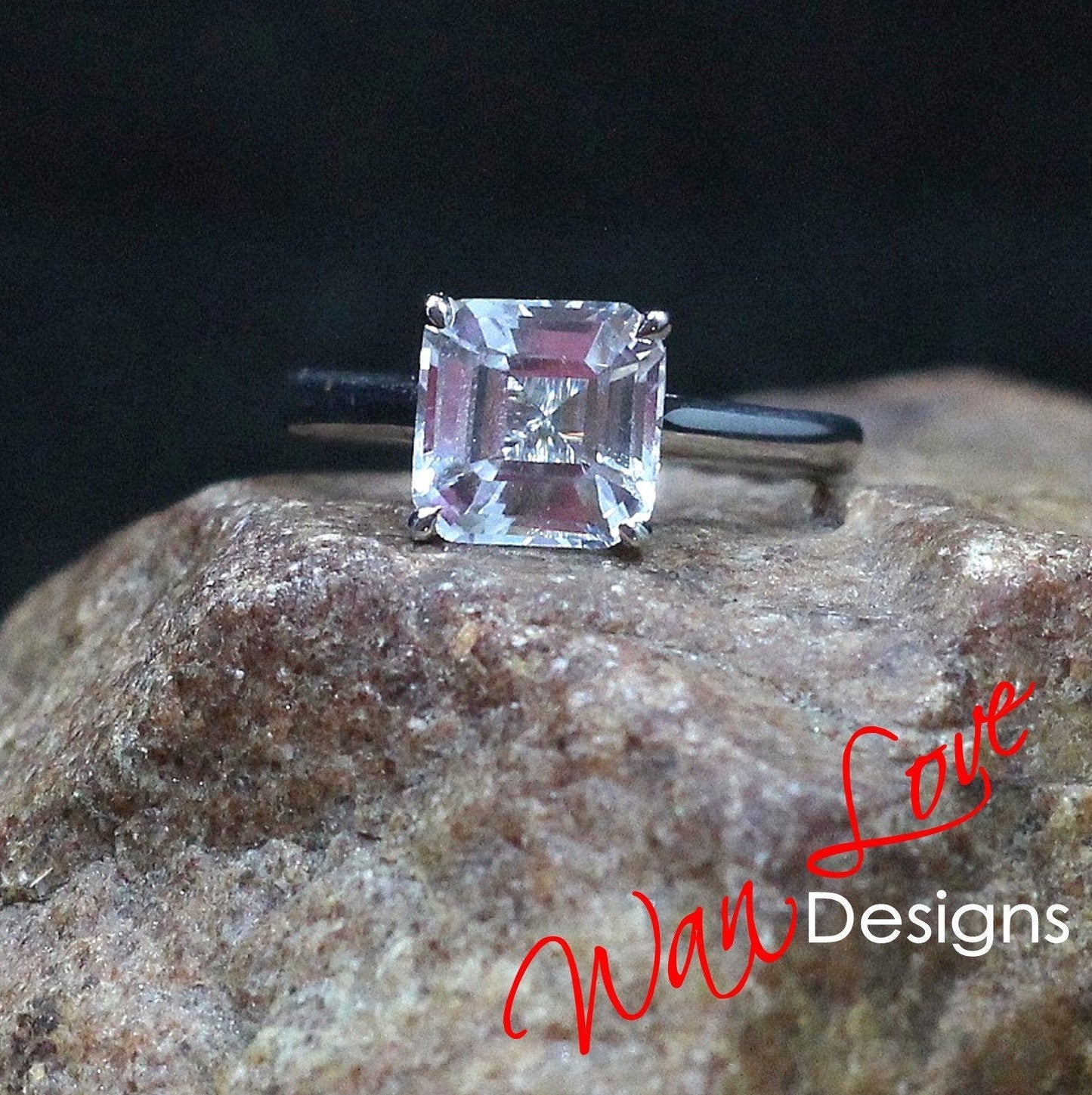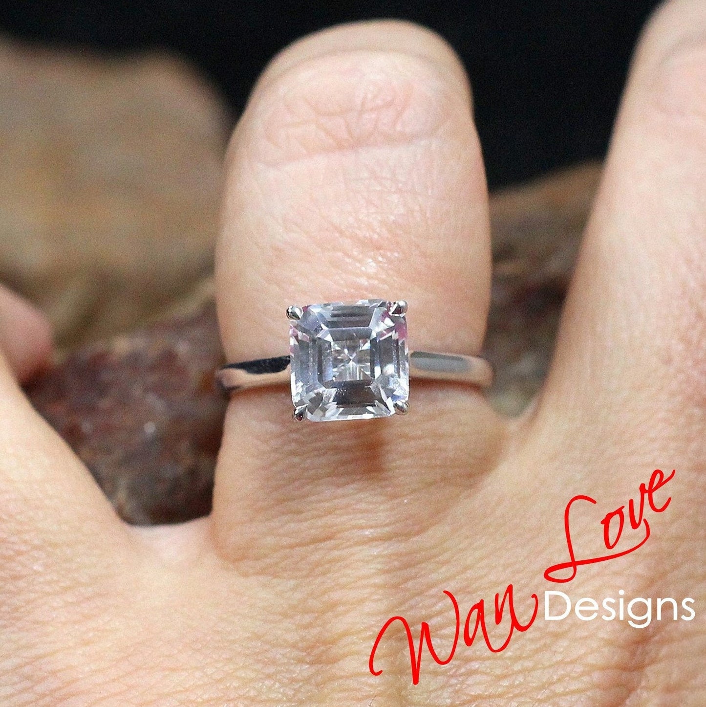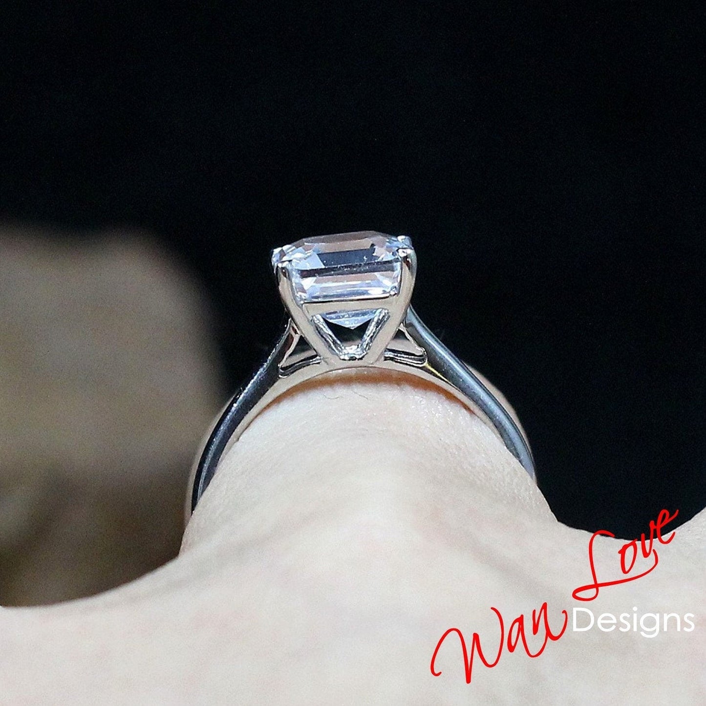 Asscher White Sapphire Engagement Ring, 4 Prong, Solitaire, 2.5 3 ct, 8mm, 925 Silver w Rhodium, Wedding, Anniversary, Ready to Ship