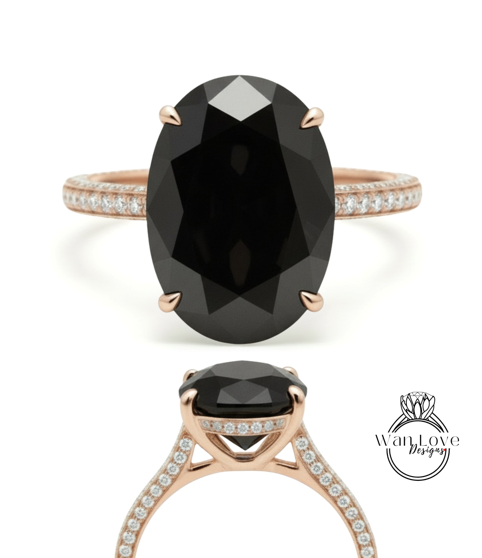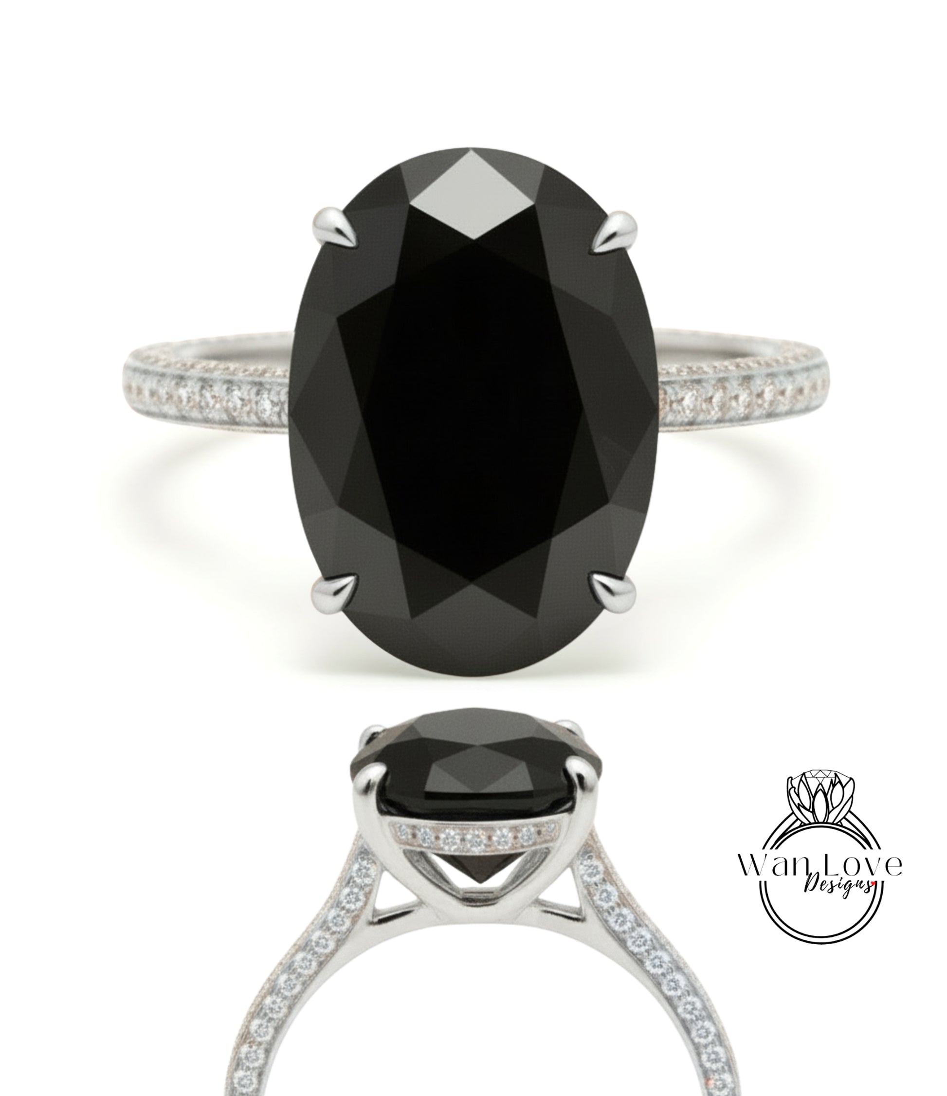 Black Moissanite & Diamond Oval side halo 3 sided Almost eternity shank band Engagement Ring 14k/18k Rose White Gold, Celebrity Elongated Oval Bridal wedding Ring, Anniversary Gift