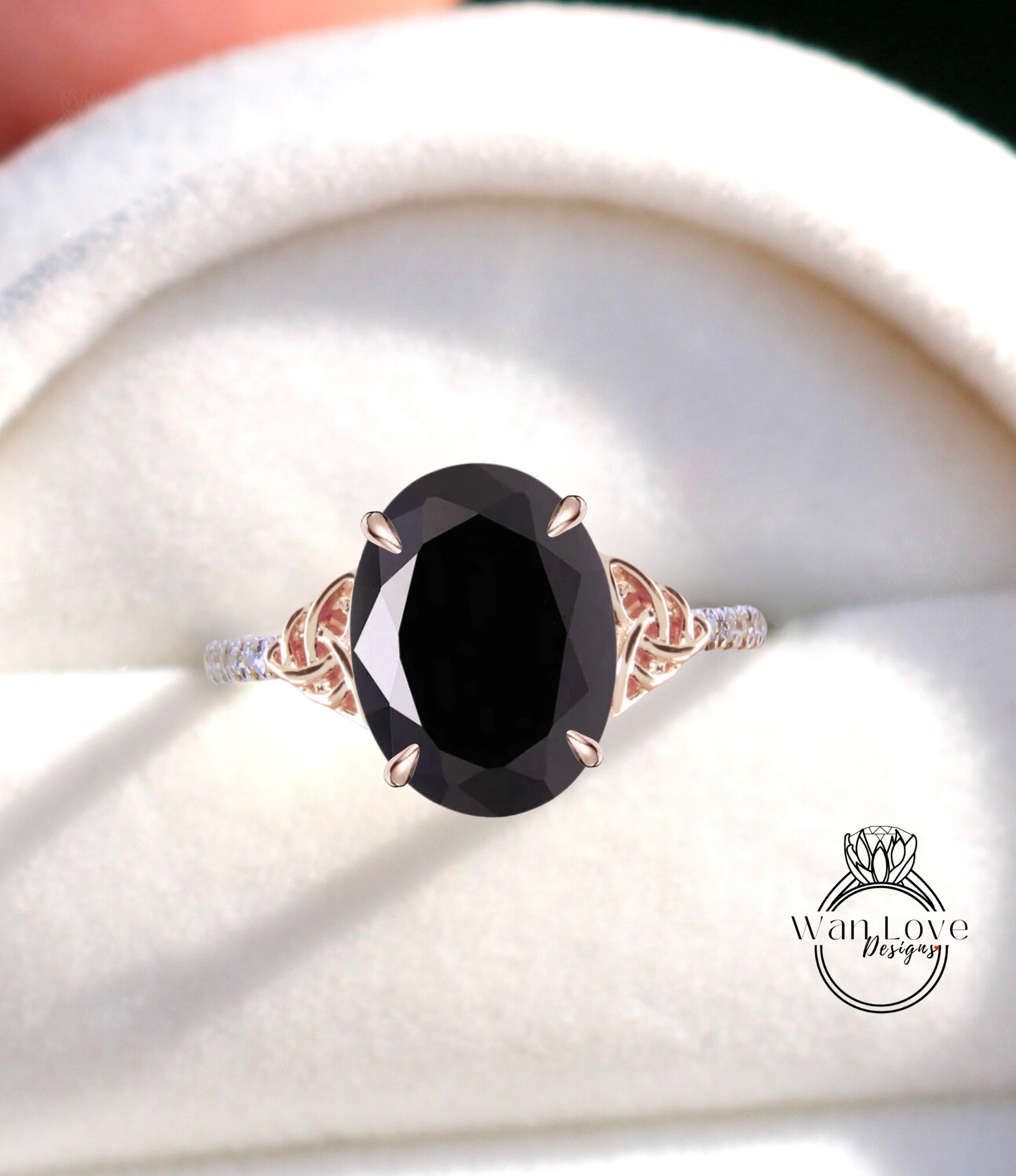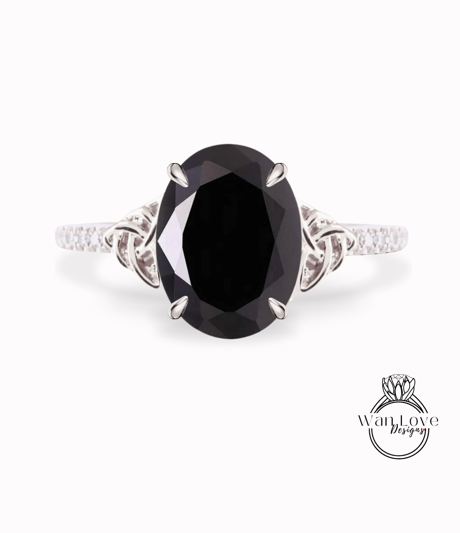 Black Spinel & Diamond Celtic Knot Oval Engagement Ring, Custom, Wedding, Double,14k 18k White Yellow Rose Gold,Platinum, Anniversary Gift