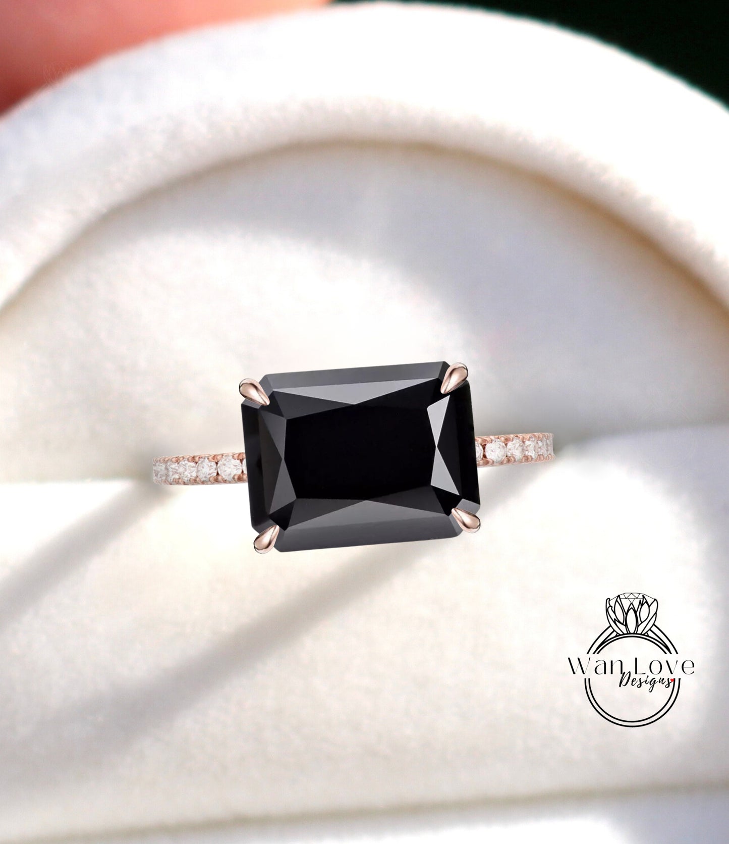Black Spinel & Diamond East West Side Halo half eternity Emerald cut Engagement Ring Cathedral 14k 18k White Yellow Rose Gold Platinum Custom Wedding Anniversary Gift