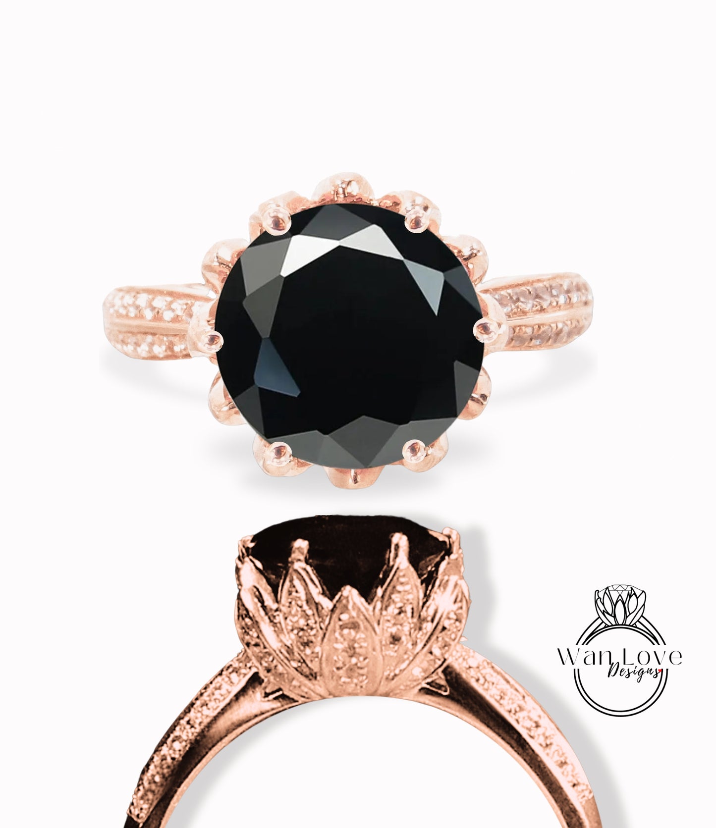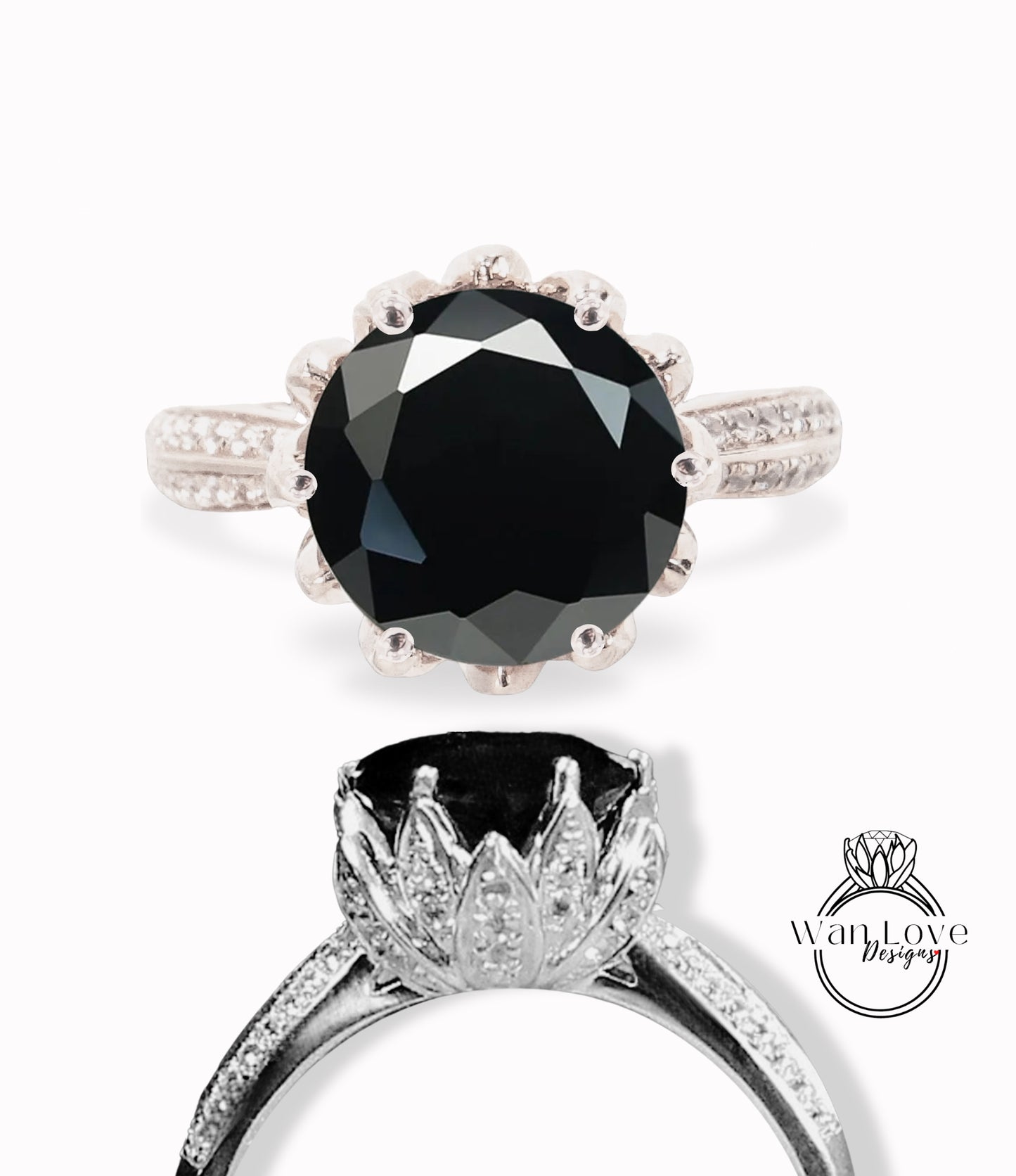 Black Spinel & Diamond Lotus Flower Engagement Ring, Floral, Round, Custom made size, Wedding, Promise,Anniversary Gift,Commitment