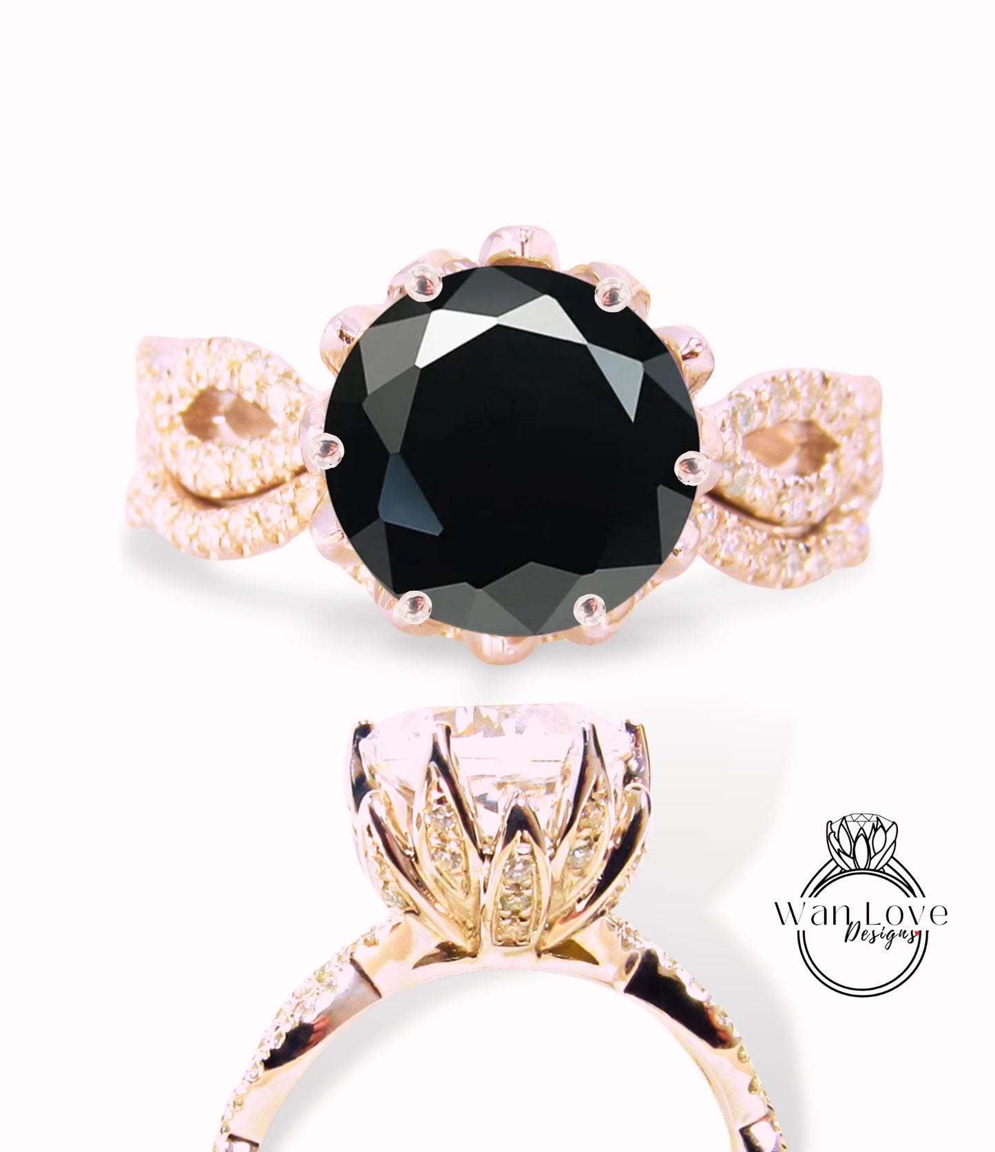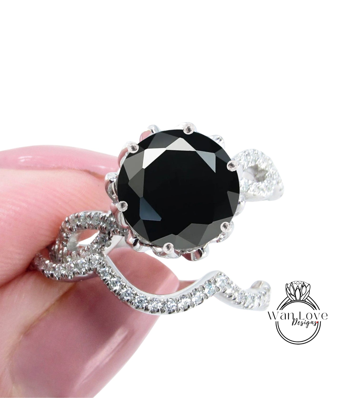 Black Spinel & Diamond Lotus Flower Infinity Twist Shank Engagement Ring Set, Curved Nesting Wedding Band, 14kt 18kt gold-Platinum-Custom