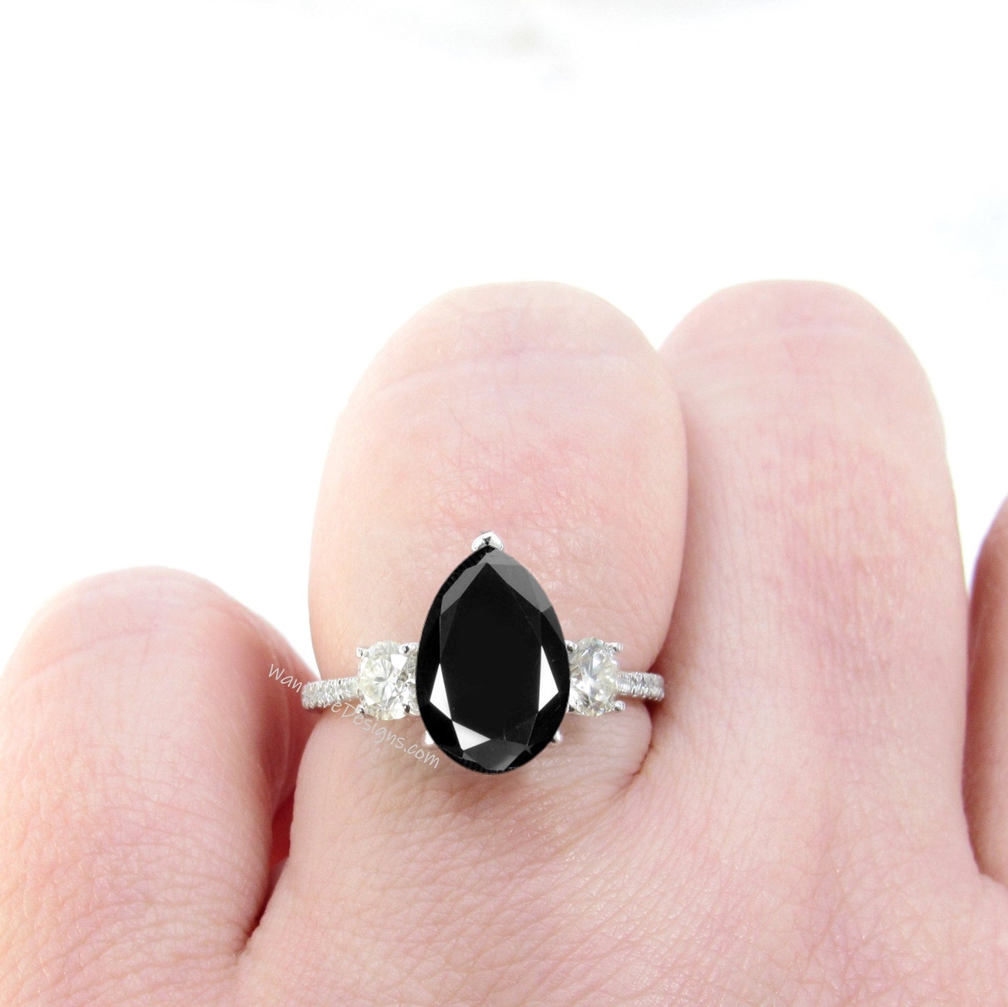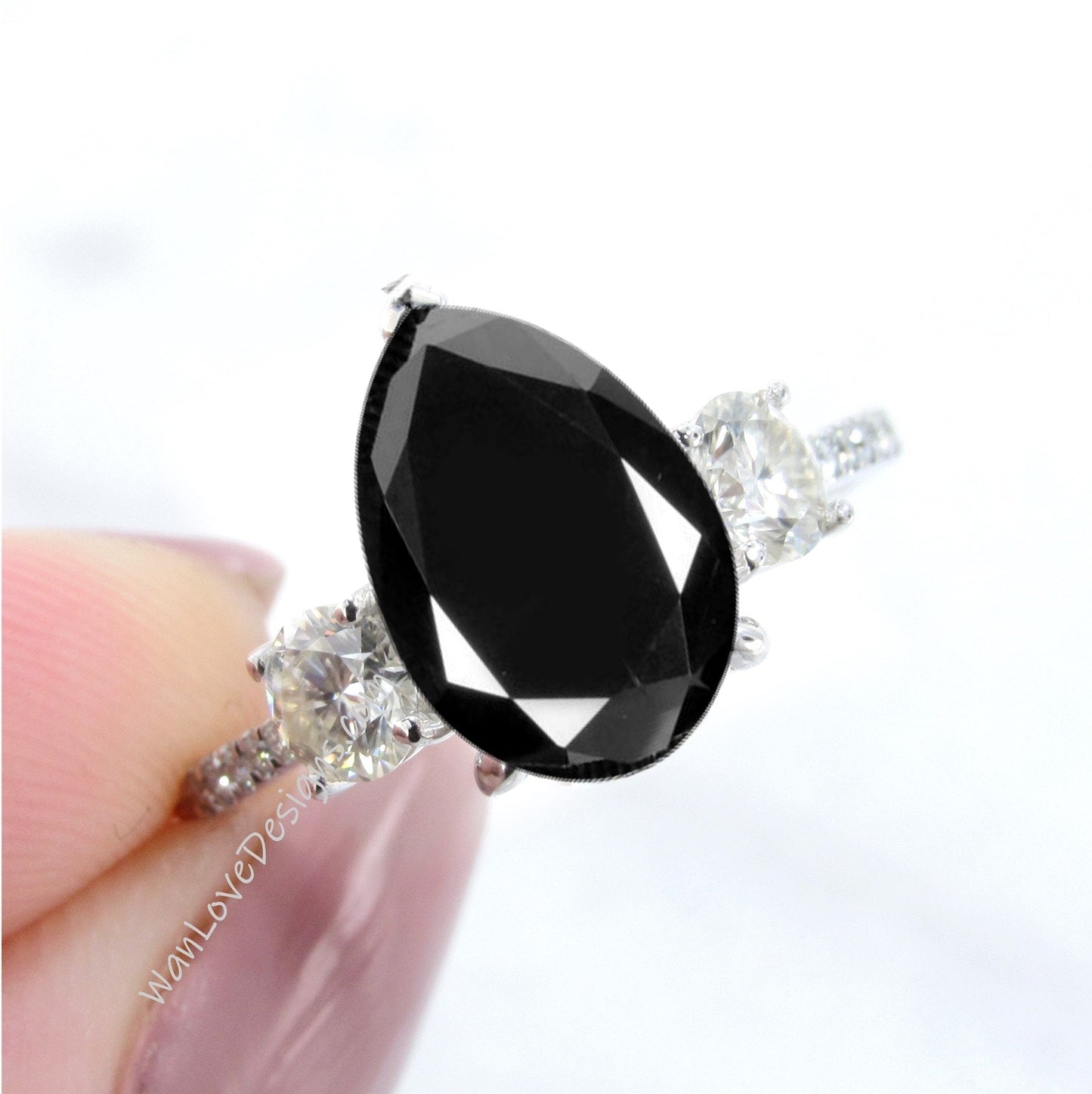 Black Spinel Diamond Moissanite Pear Round 3 Stone Minimalist Dainty Engagement Ring 2ct Wedding Anniversary Gift