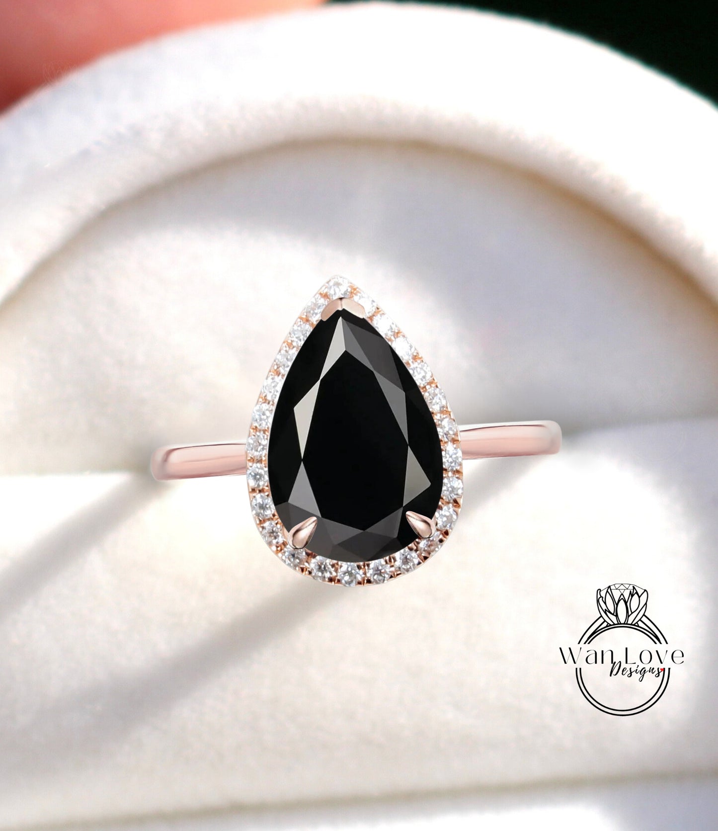 Black Spinel & Diamond Pear Halo Engagement Ring,Plain Shank, Custom-14k 18k White Yellow Rose Gold-Platinum, WanLoveDesigns