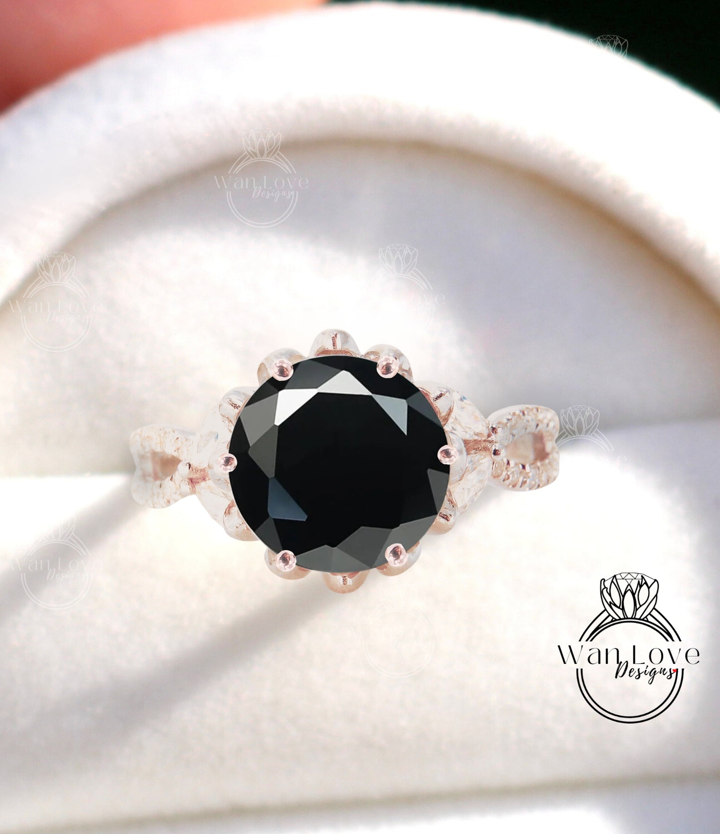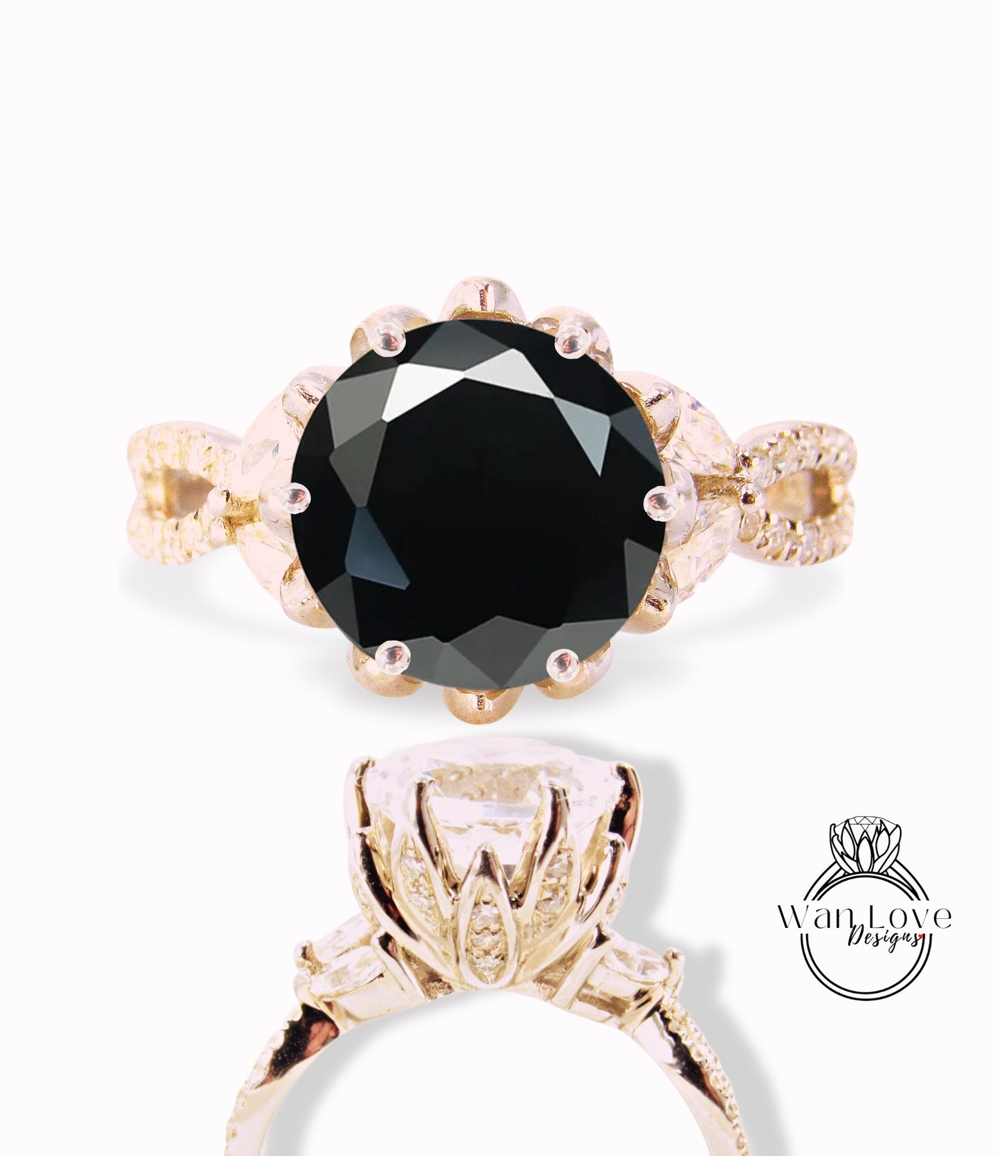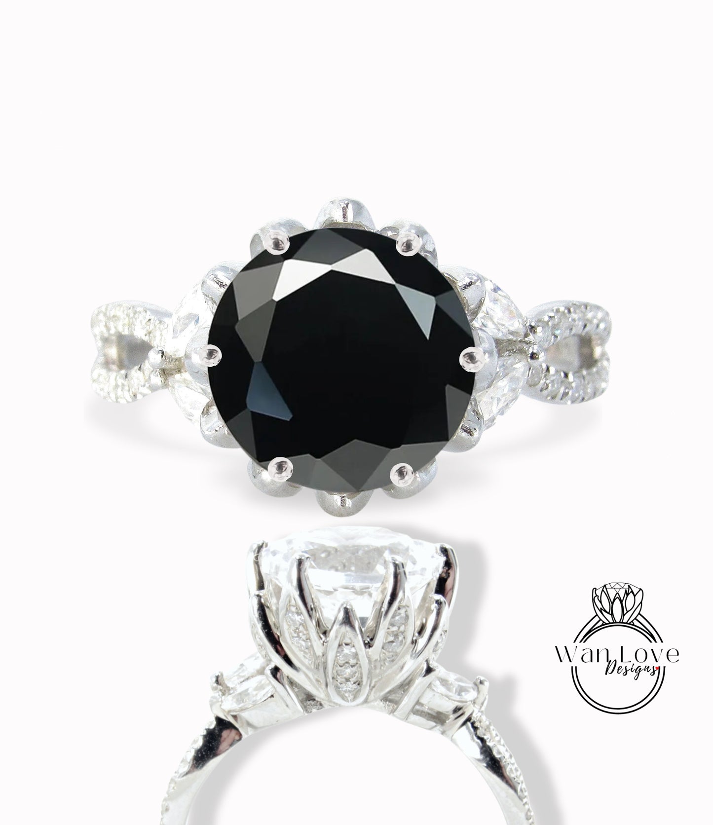 Black Spinel & Diamond Lotus Flower Engagement Ring Marquise Split Shank Leaf 14k 18k White Yellow Rose Gold-Platinum-Custom-Wedding