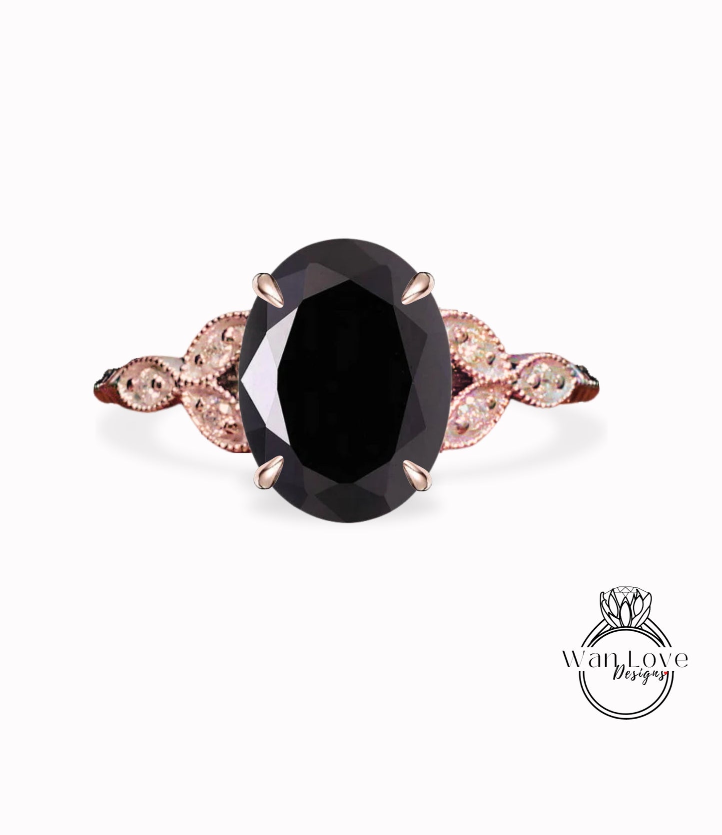 Black Spinel & White Diamond Oval Leaf Antique Cluster Engagement Ring Milgrain or Smooth 14kt 18kt Gold Platinum Custom Wedding Anniversary