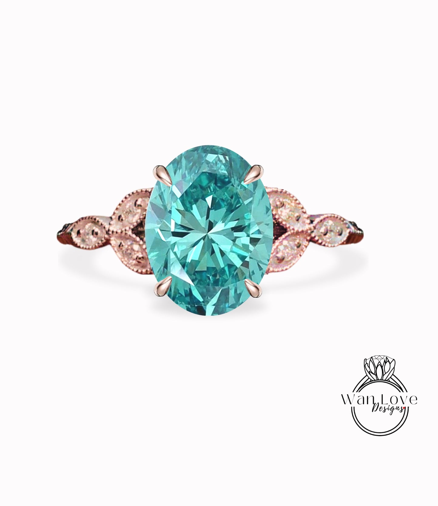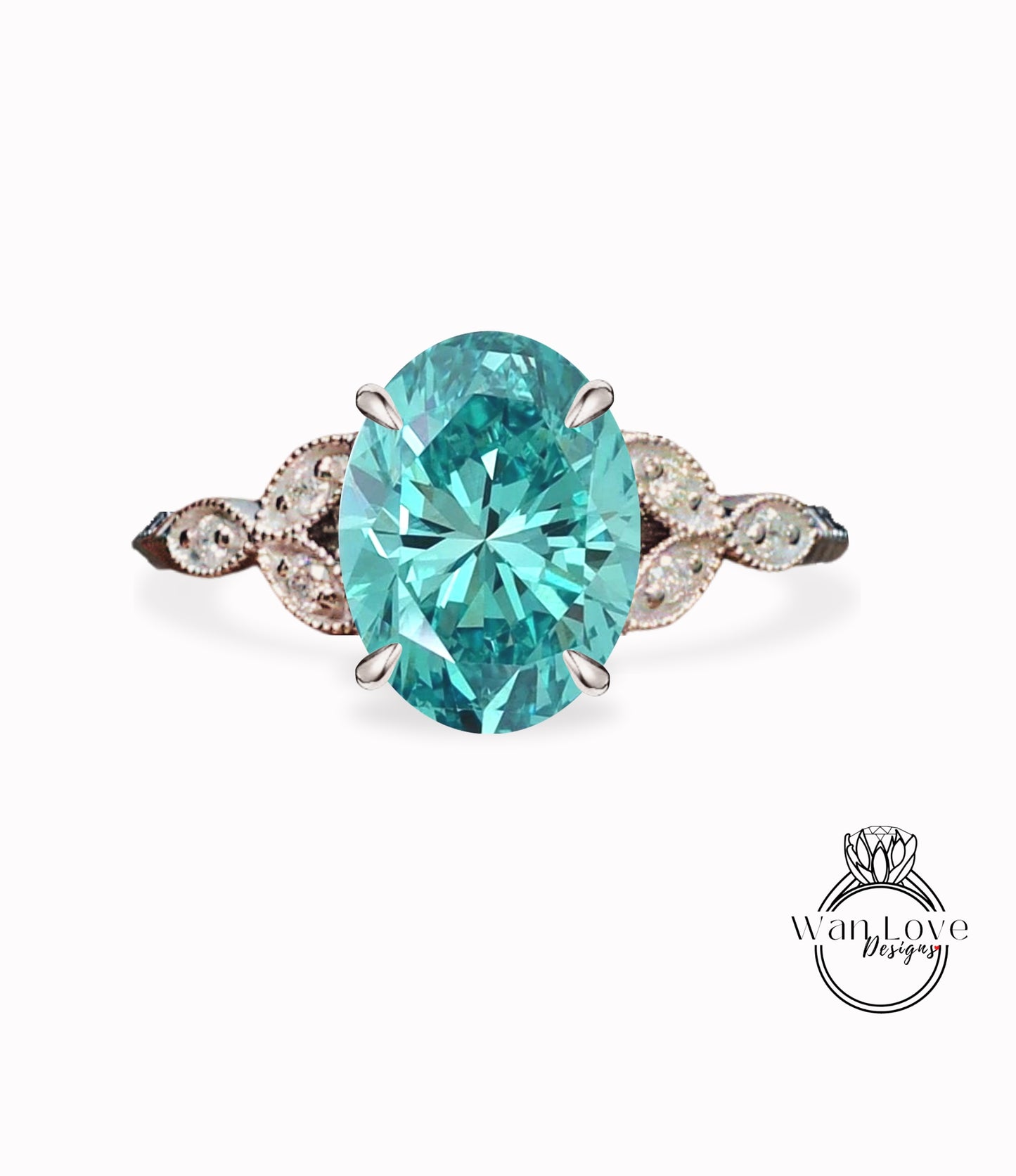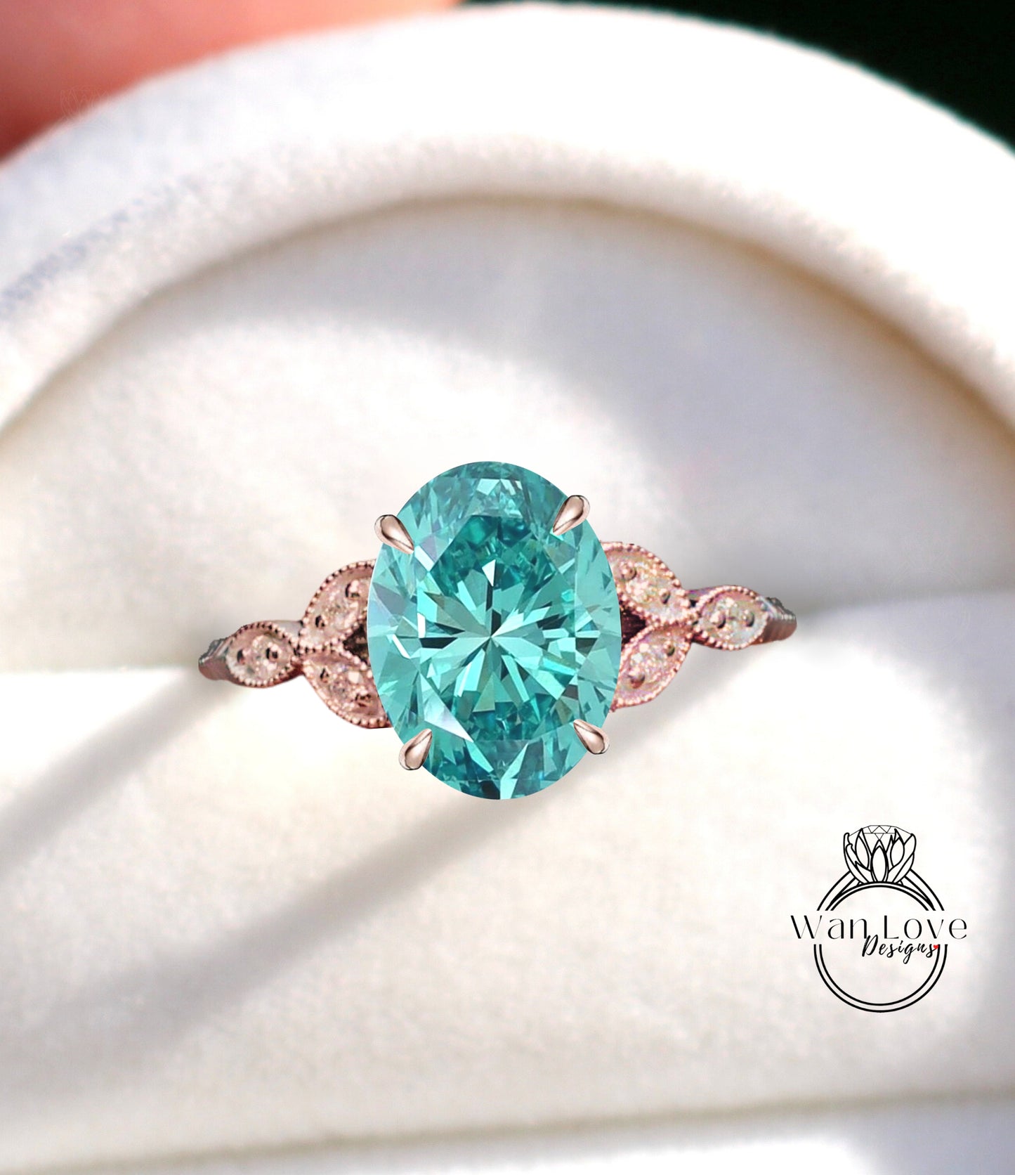 Blue Moissanite & Diamond Oval Leaf Antique Cluster Engagement Ring Engraved Milgrain or Smooth 14kt 18kt Gold Platinum Custom Wedding.