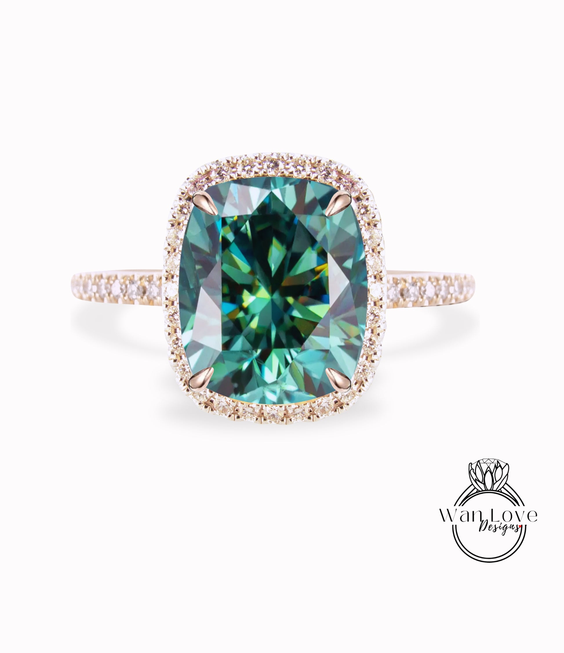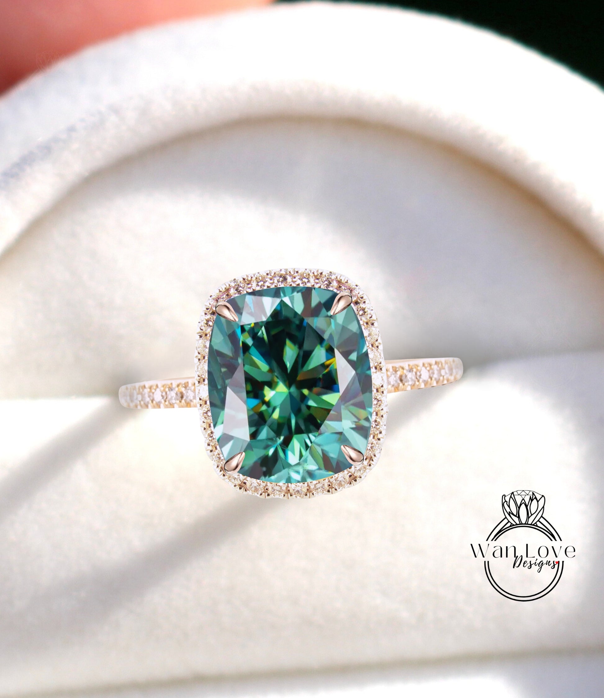 Blue Moissanite Elongated Cushion & Diamond halo engagement ring gold vintage engagement ring women Half eternity wedding Bridal Anniversary Gift