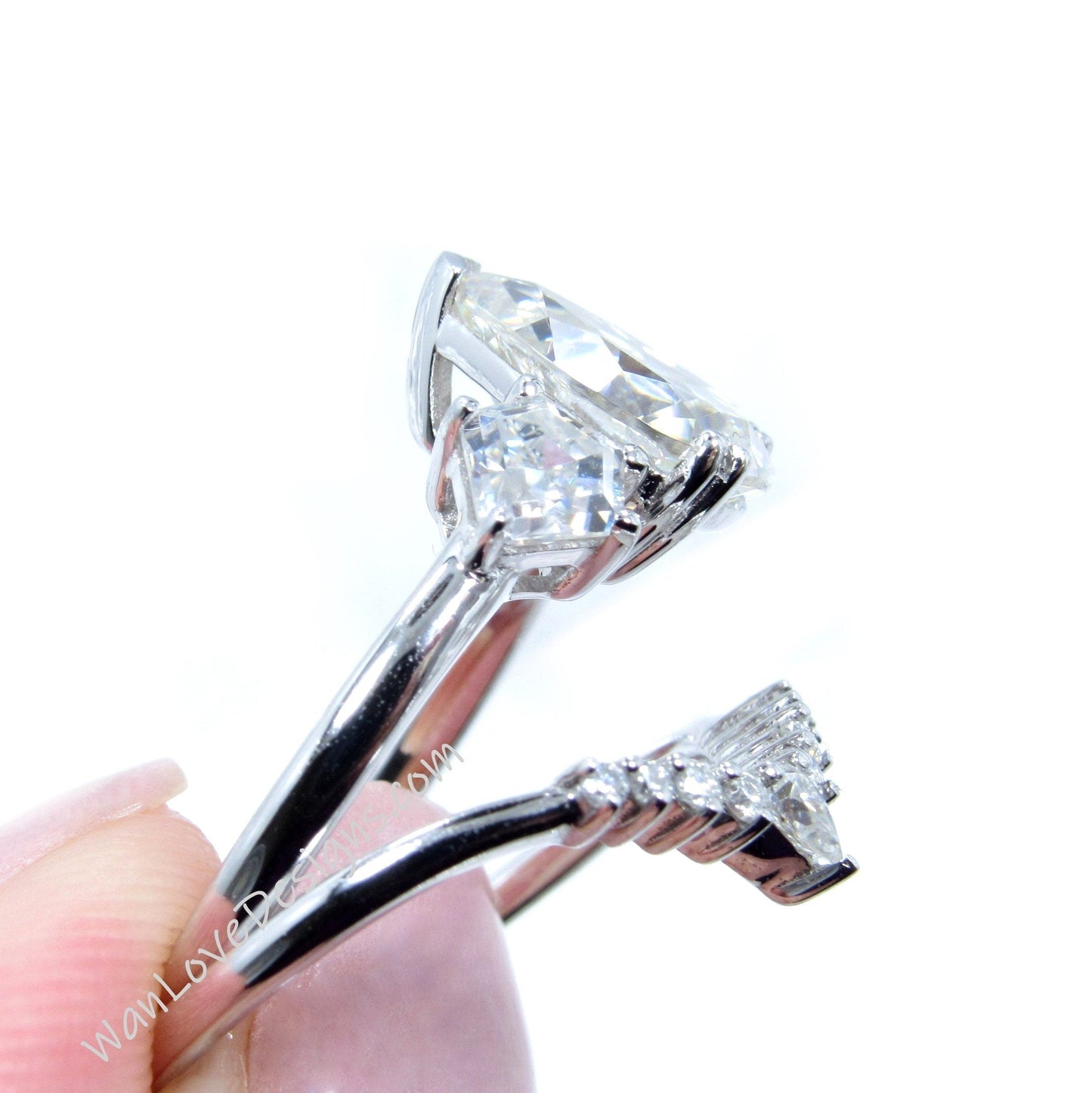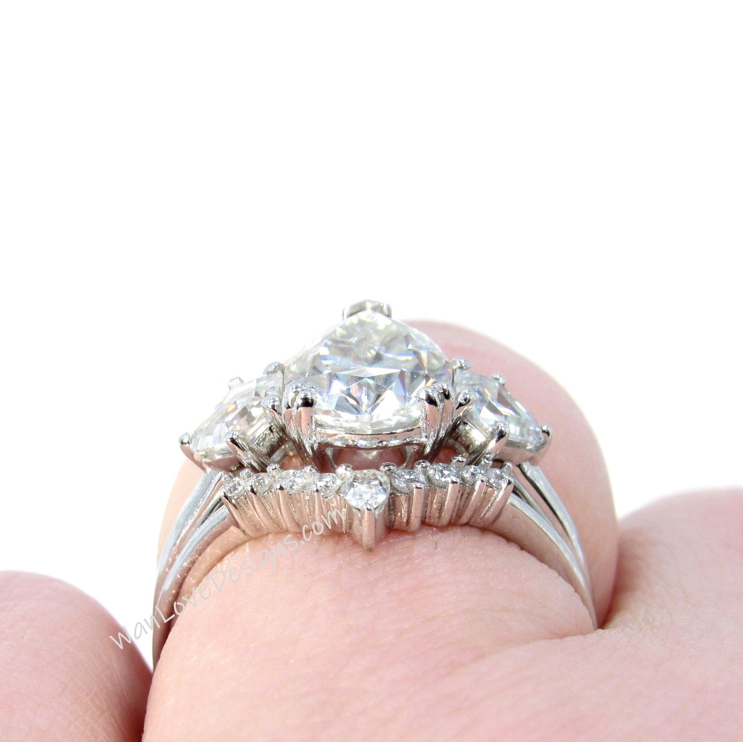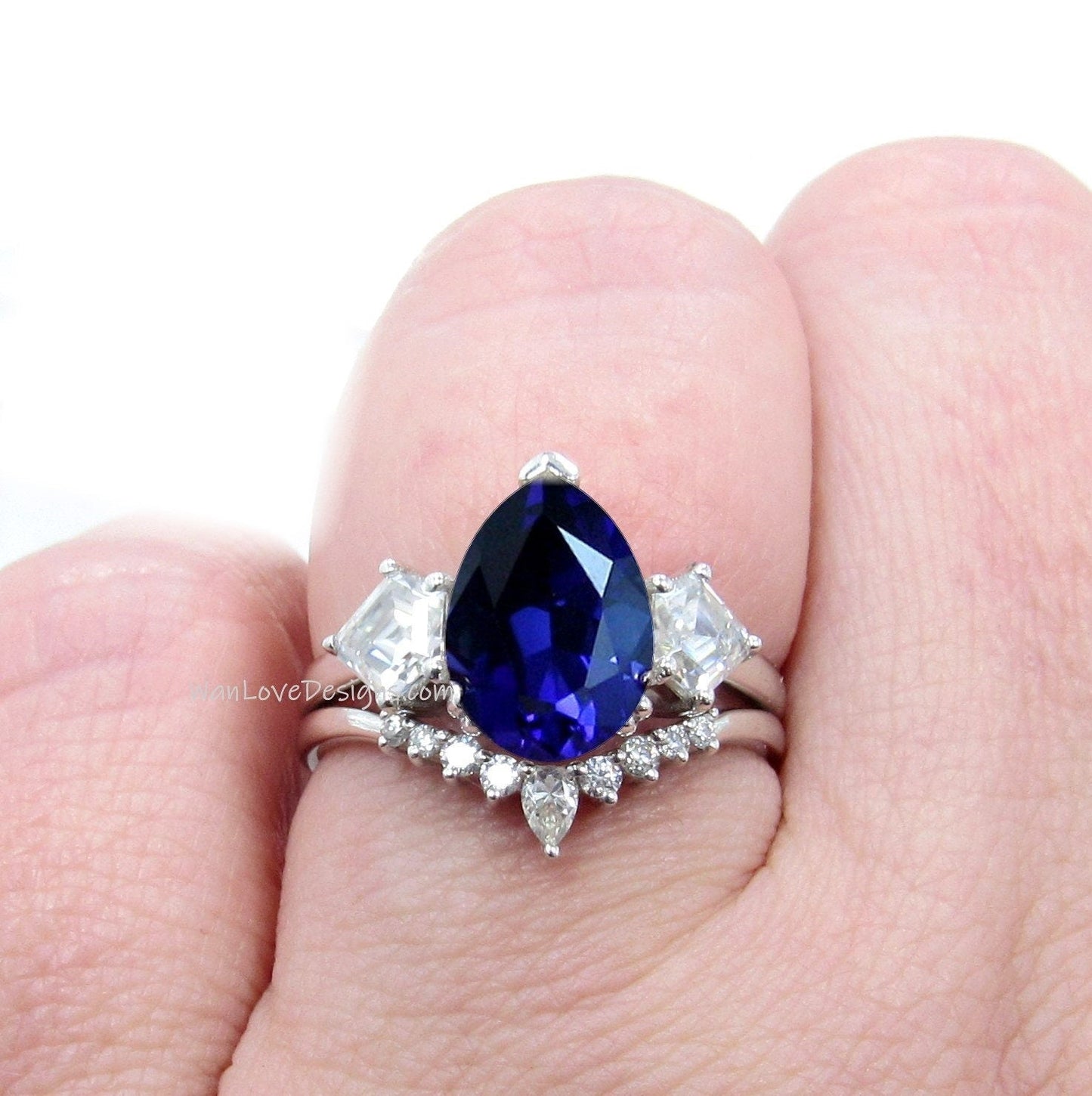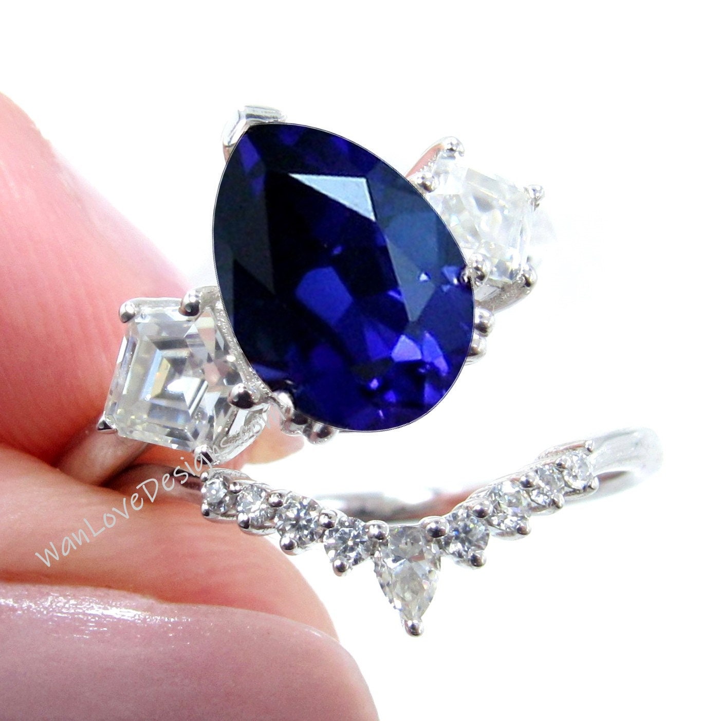 Blue Sapphire cluster pear kite engagement ring, cluster ring, moissanite ring, moissanite kite ring, unique engagement ring, Bridal Set