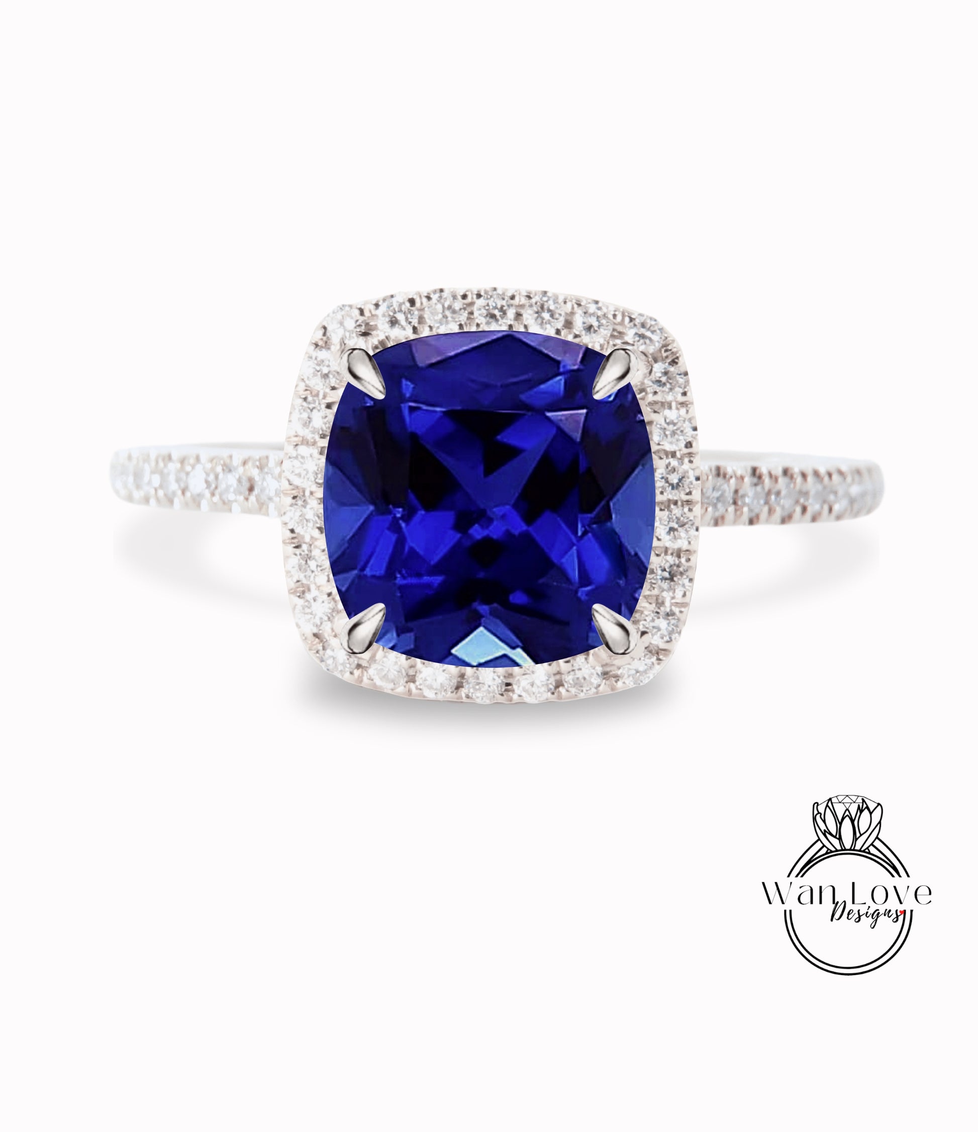 Blue Sapphire & Diamond Cushion Halo Engagement Ring, Half Eternity Rose White Gold ring Custom, Bridal Wedding ring, Anniversary Gift