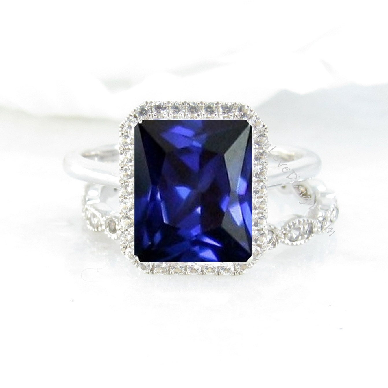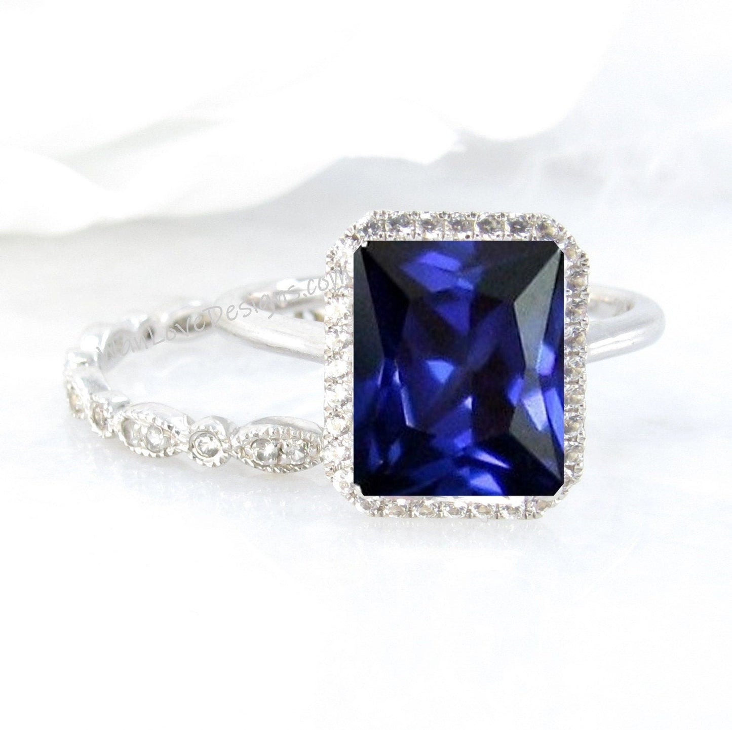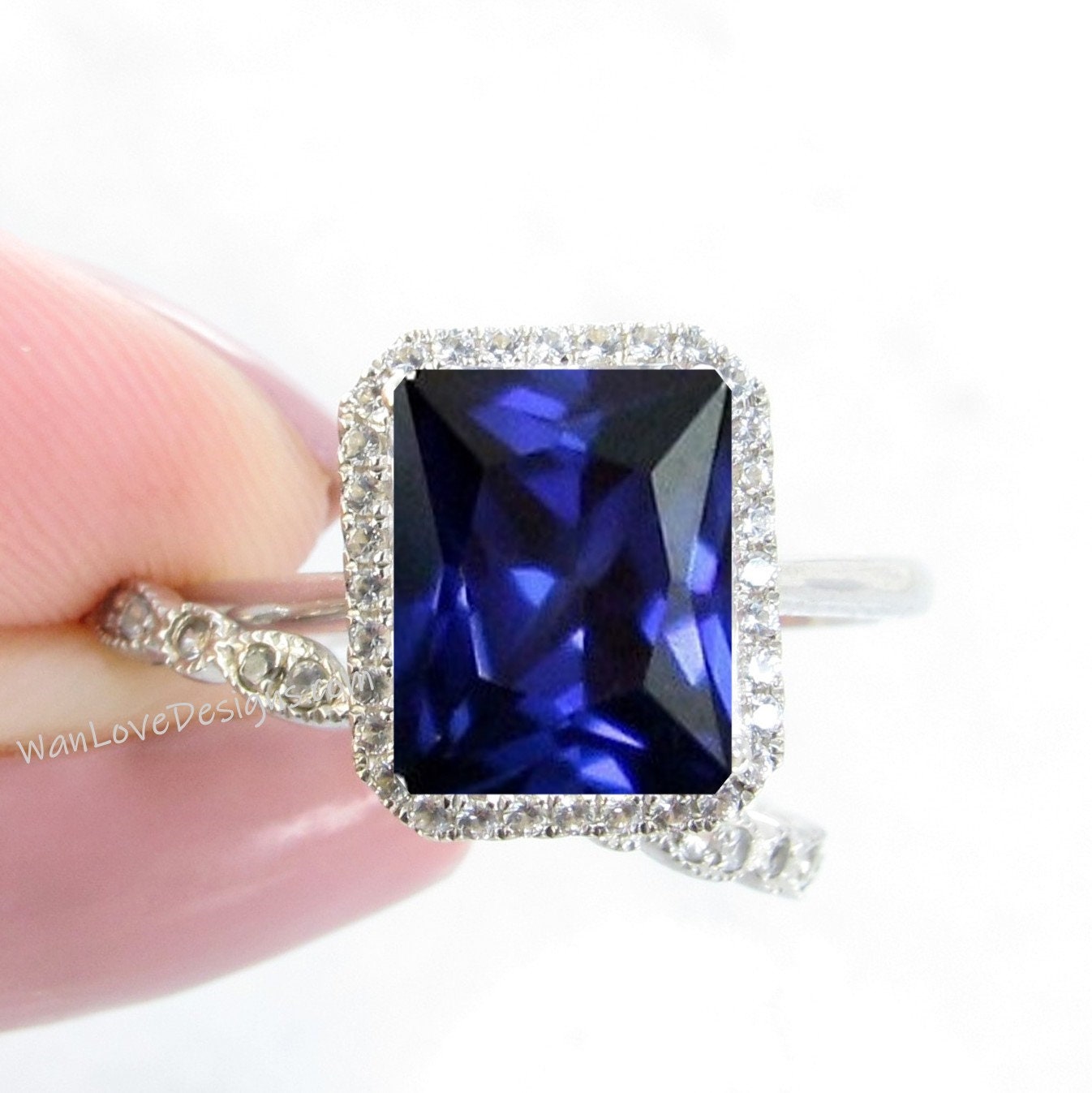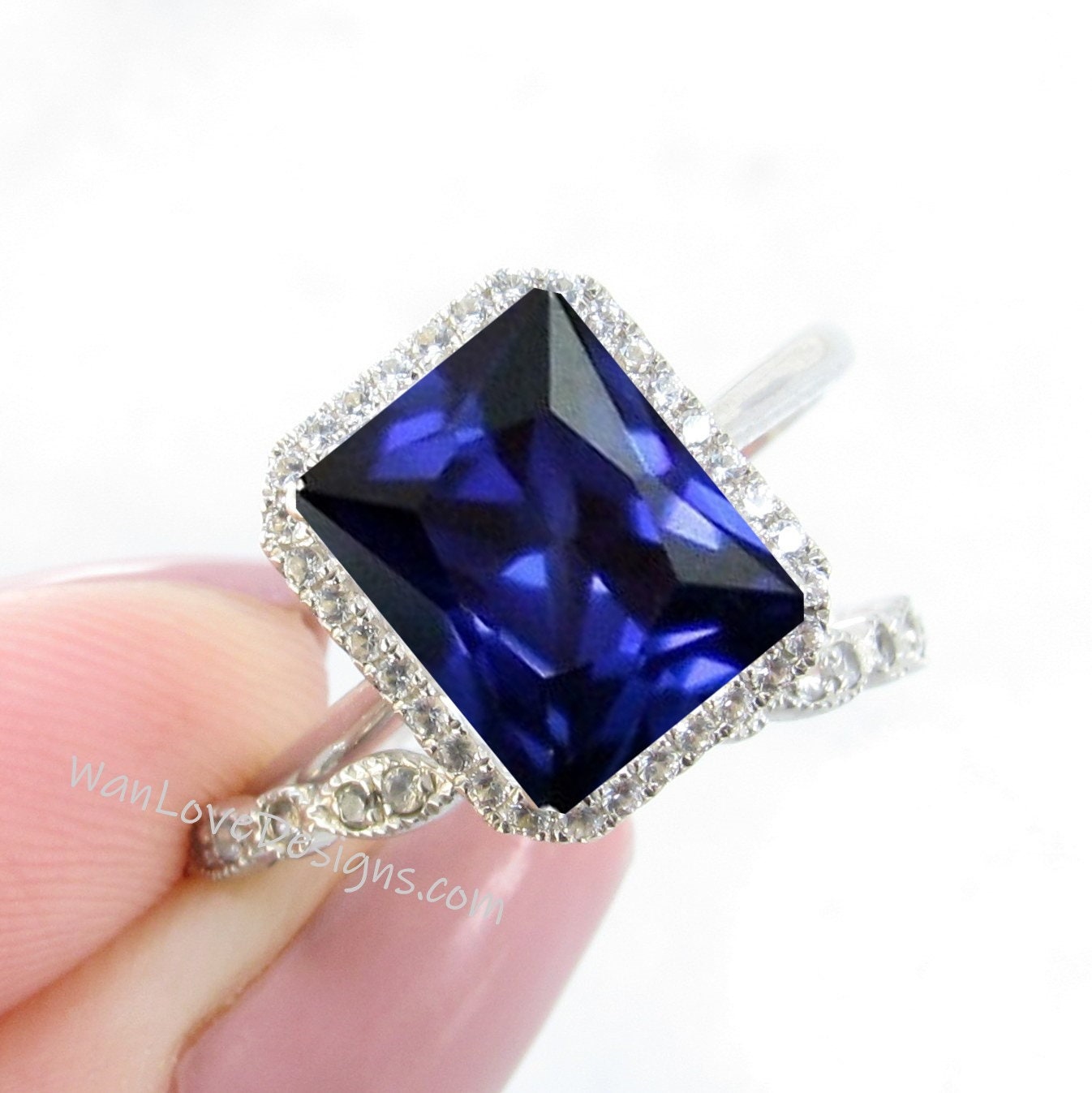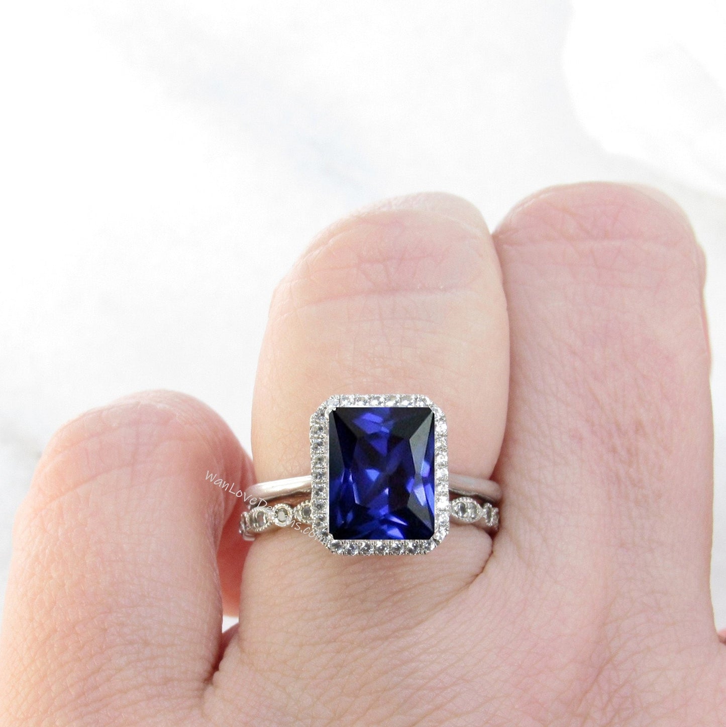 Blue Sapphire & Diamond Emerald Halo Engagement Ring set, Milgrain Leaf Full Eternity Wedding Band, Custom,14kt 18kt Gold