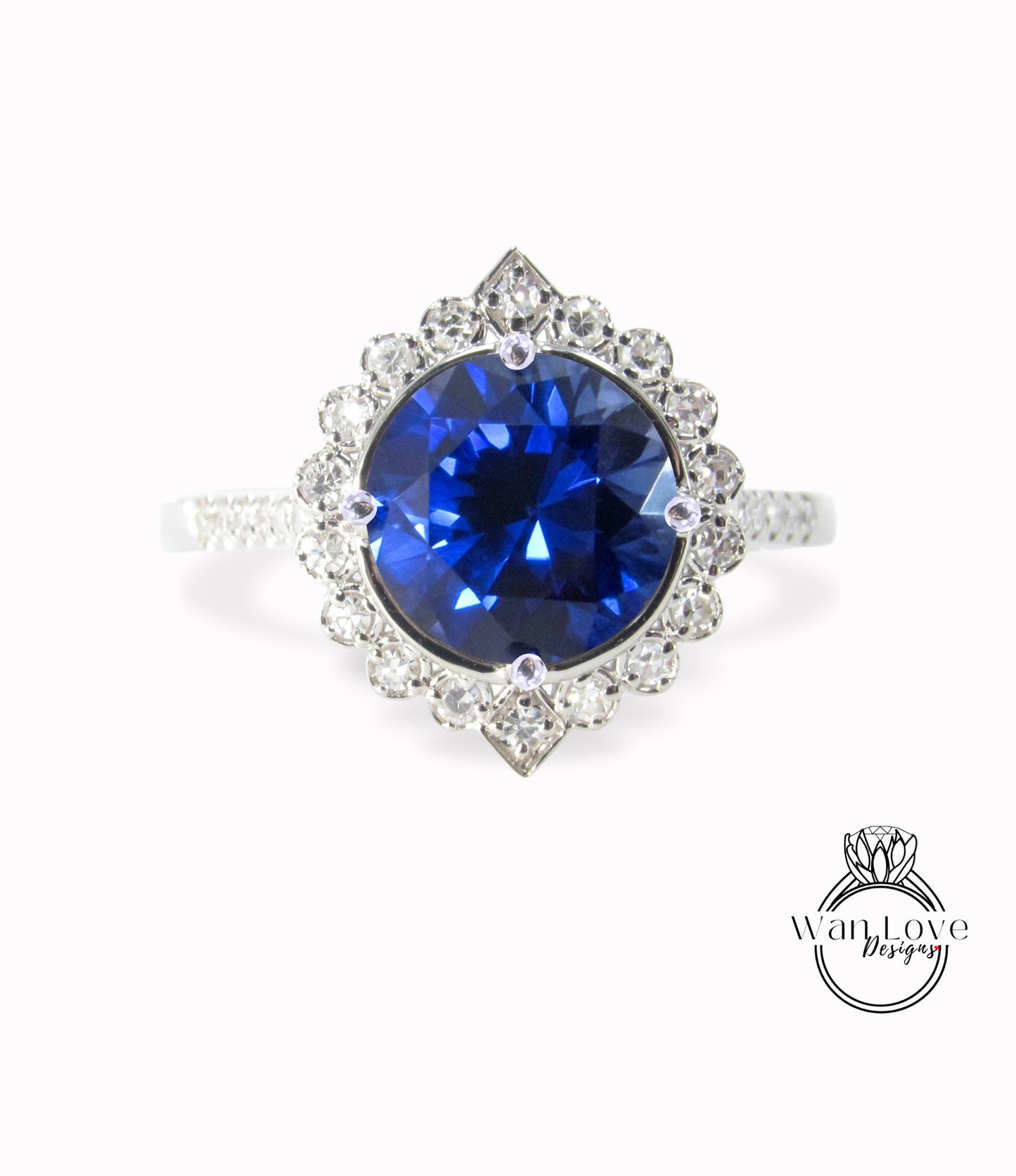 Blue Sapphire & Diamonds Geometric Halo Engagement Ring Round, Custom,14k 18k White Yellow Rose Gold-Platinum-Wedding,Anniversary Gift.