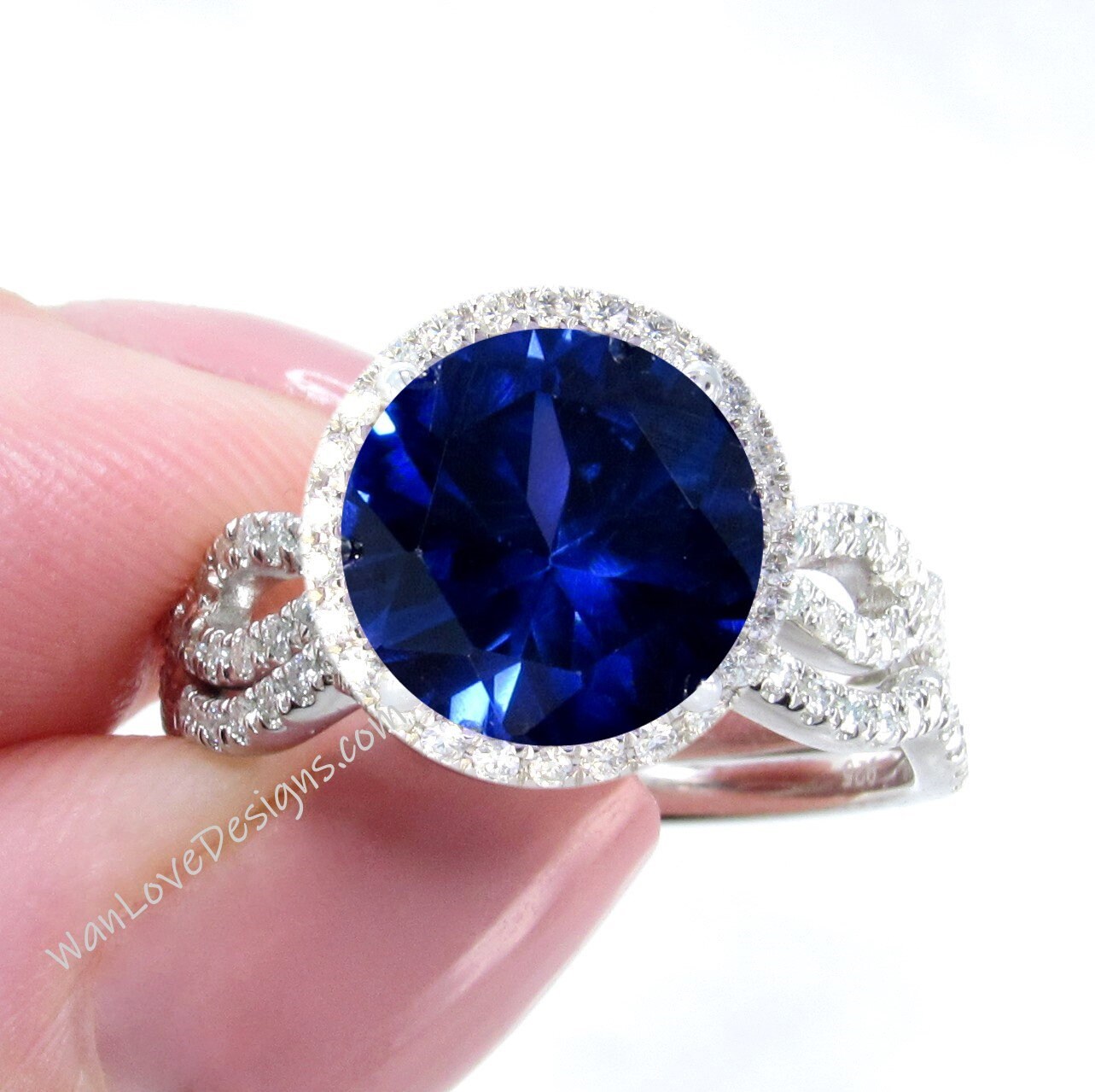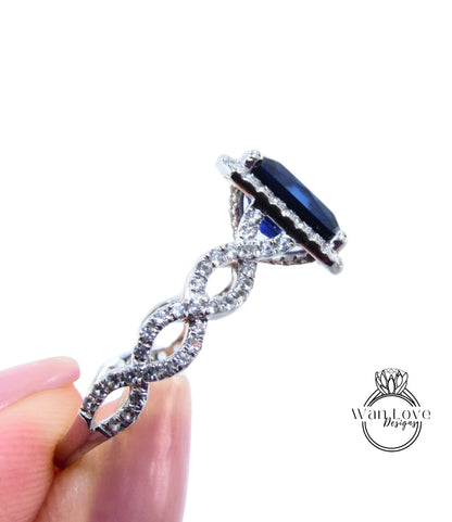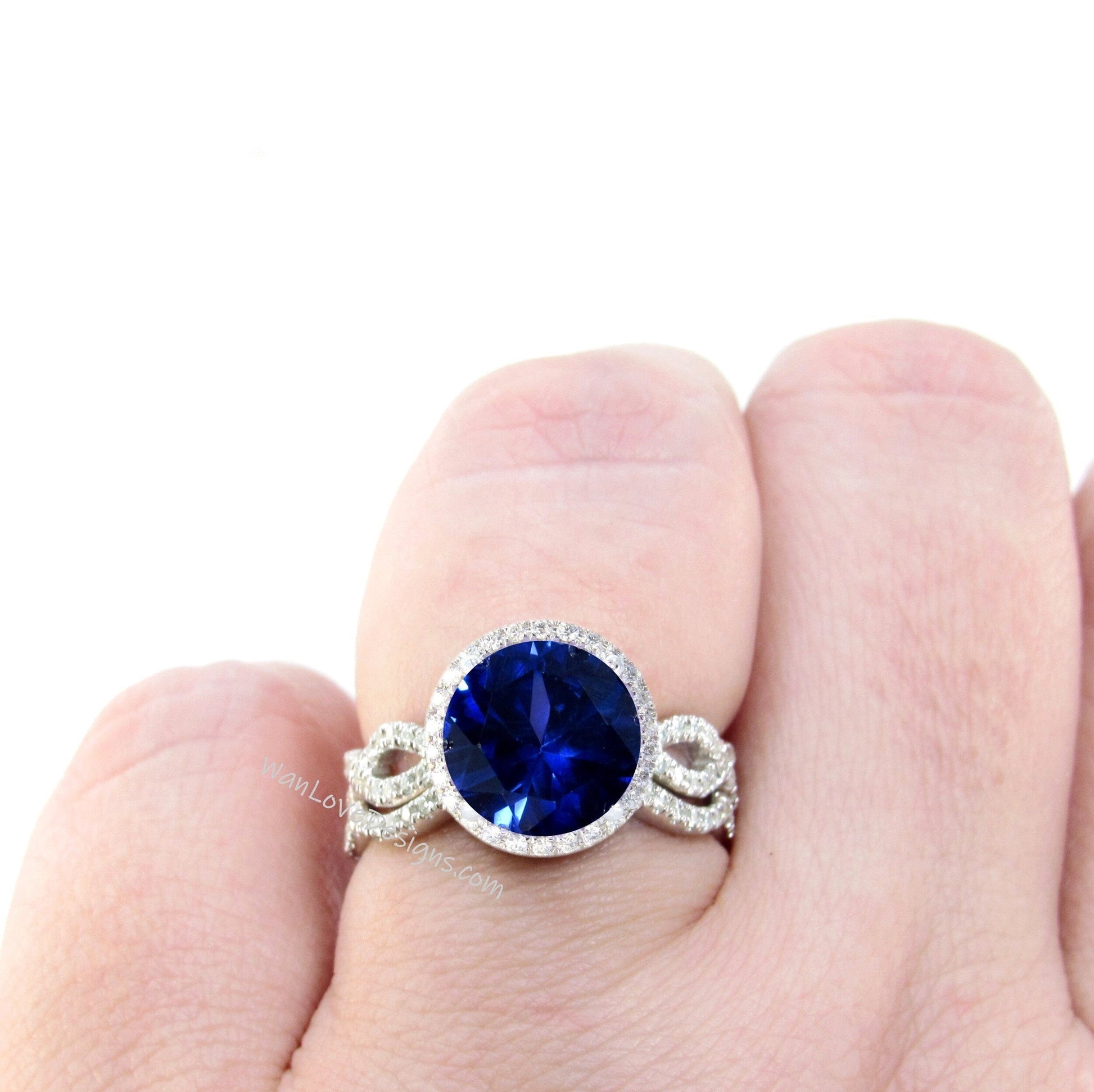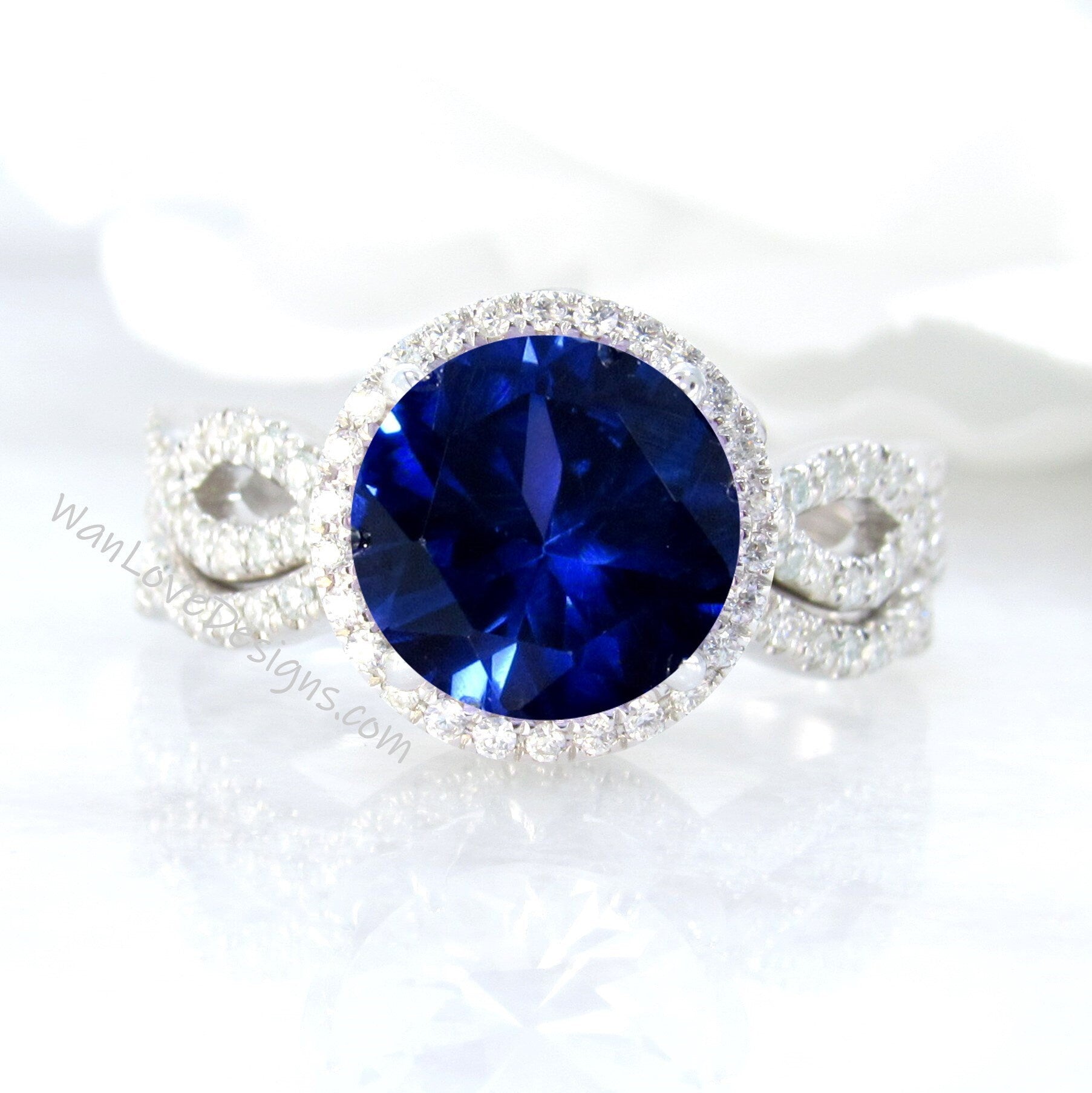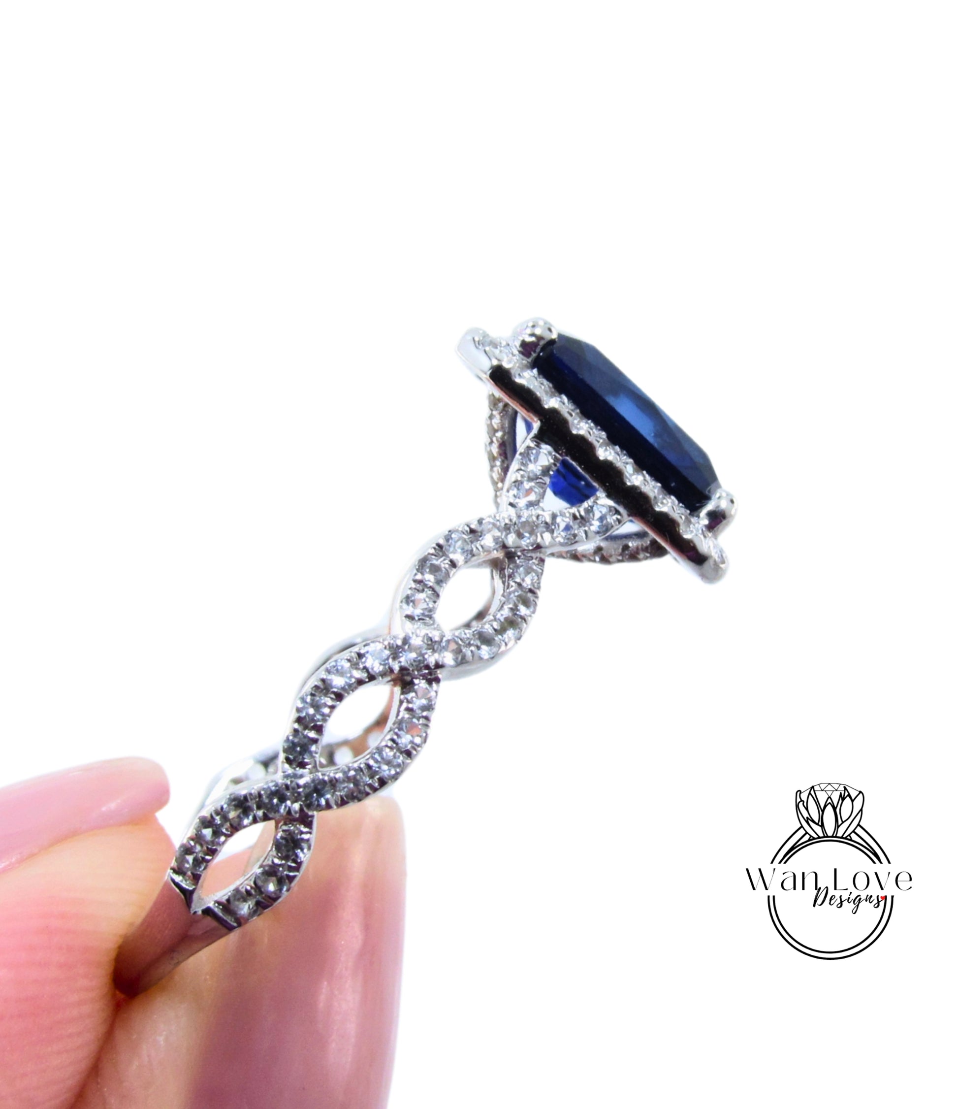 Blue Sapphire & Diamond Infinity Split Shank Round Halo Engagement Ring, Nesting Wedding Band Custom 14k 18k White Yellow Rose Gold Platinum.