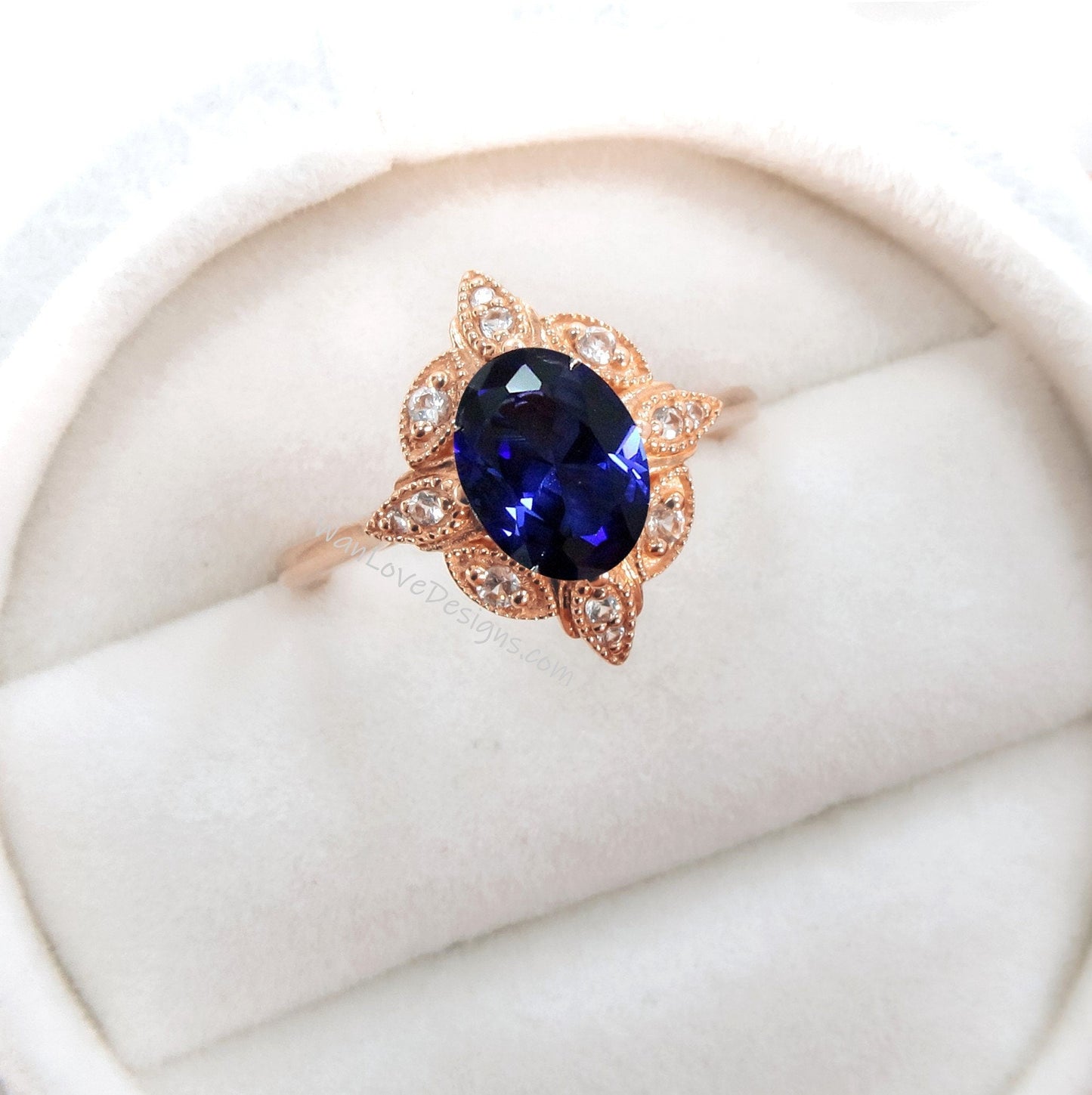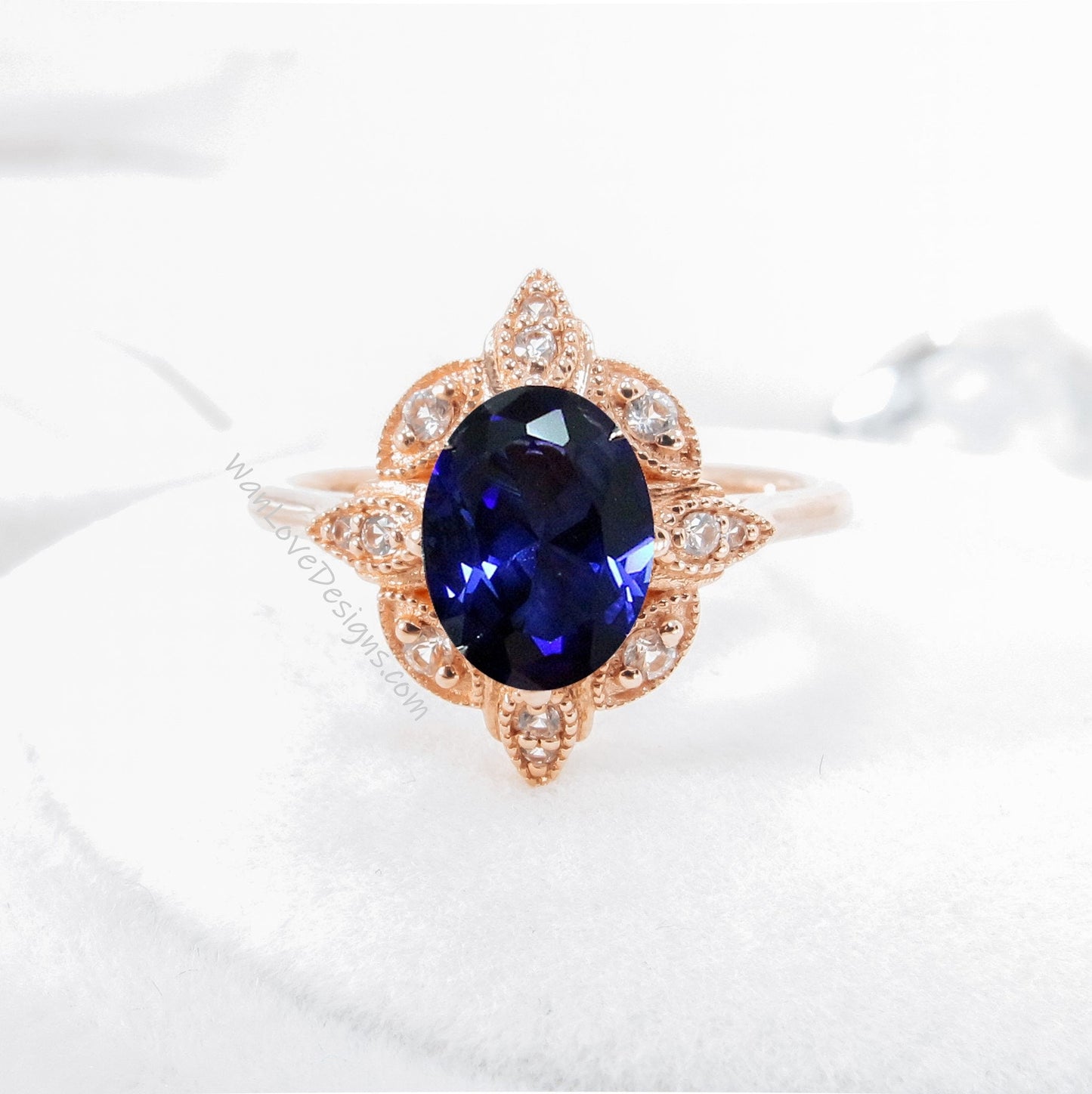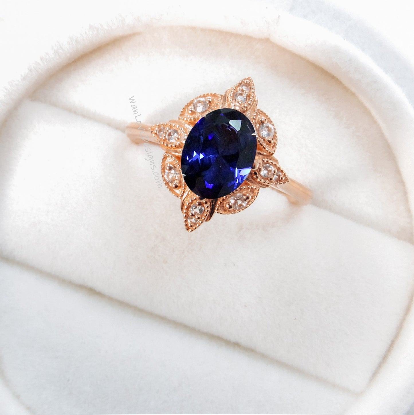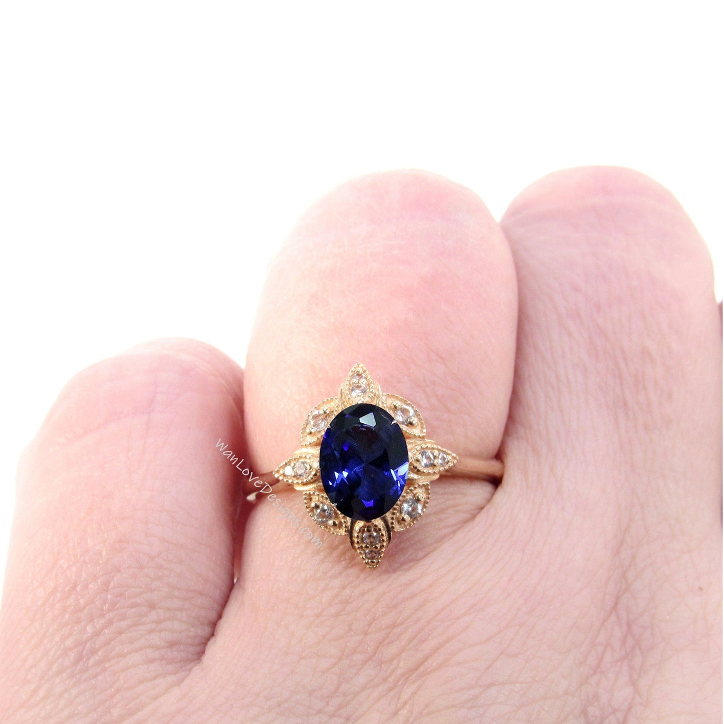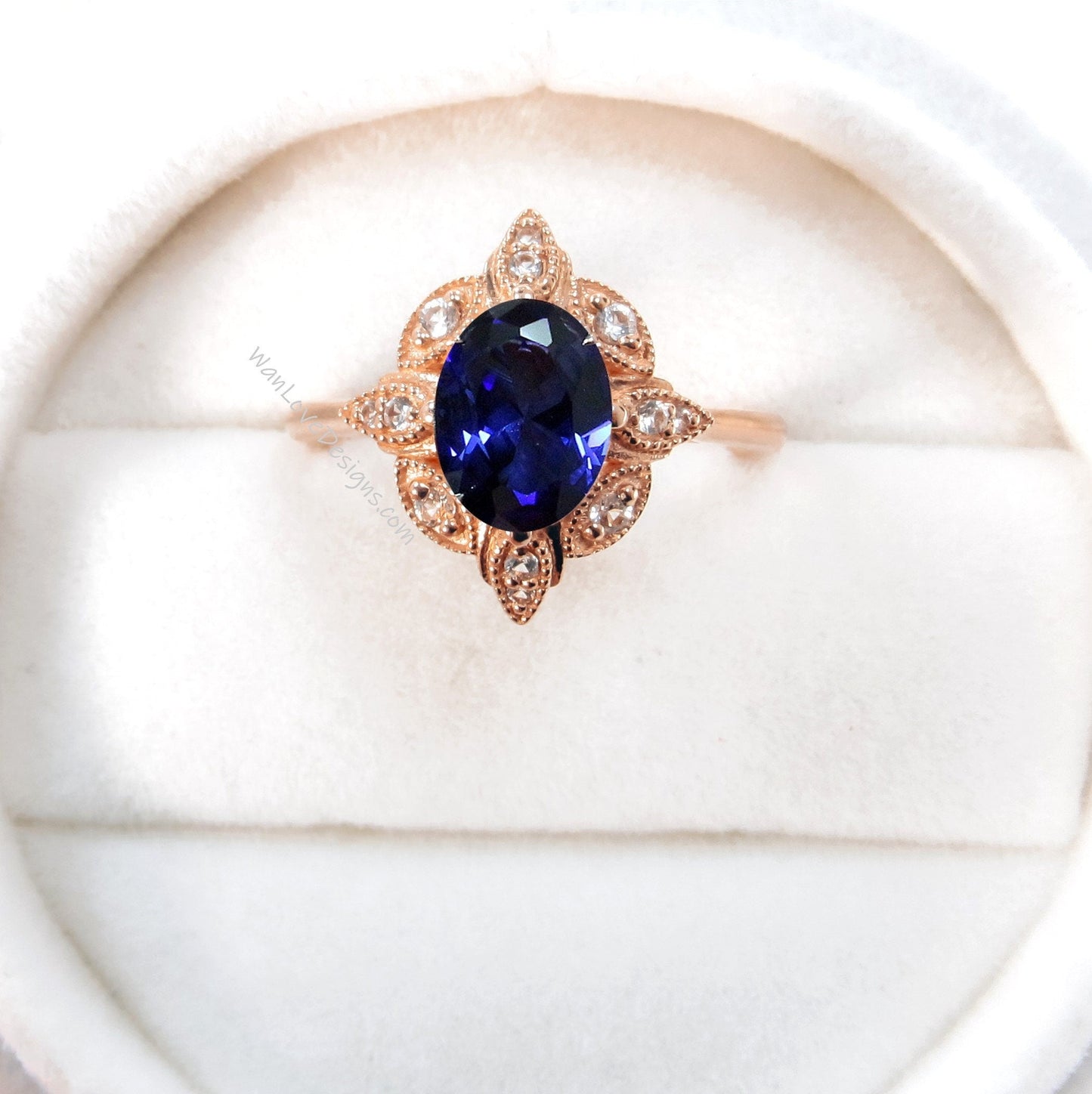 Blue Sapphire & Diamond Oval Milgrain Halo Engagement Ring, plain shank, 14k White Yellow Rose Gold,Platinum,Custom,Wedding, WanLoveDesigns
