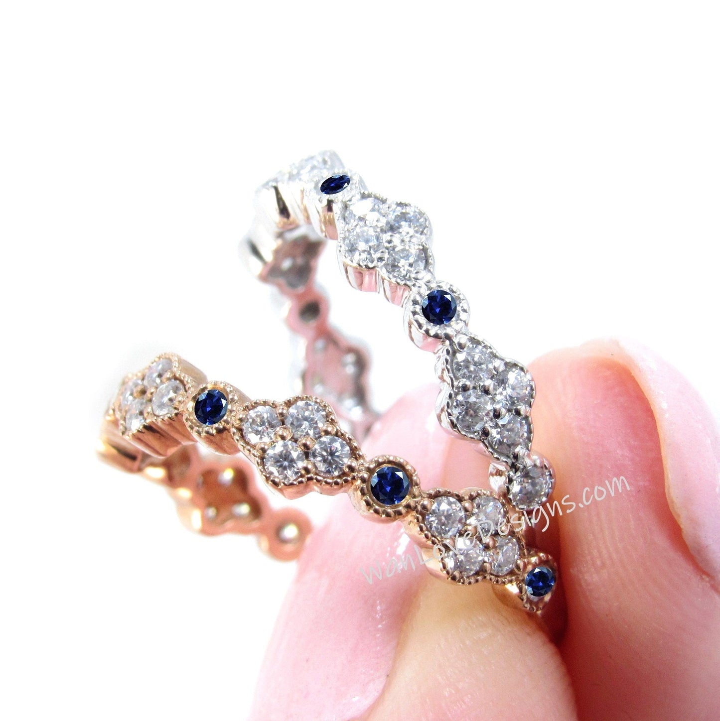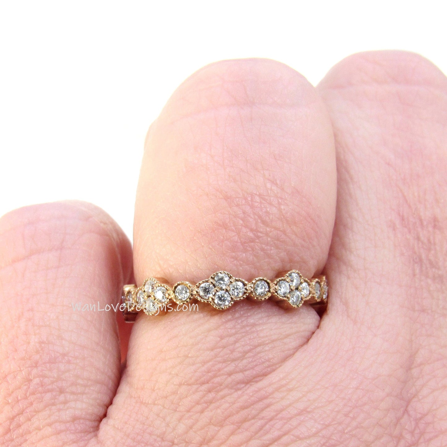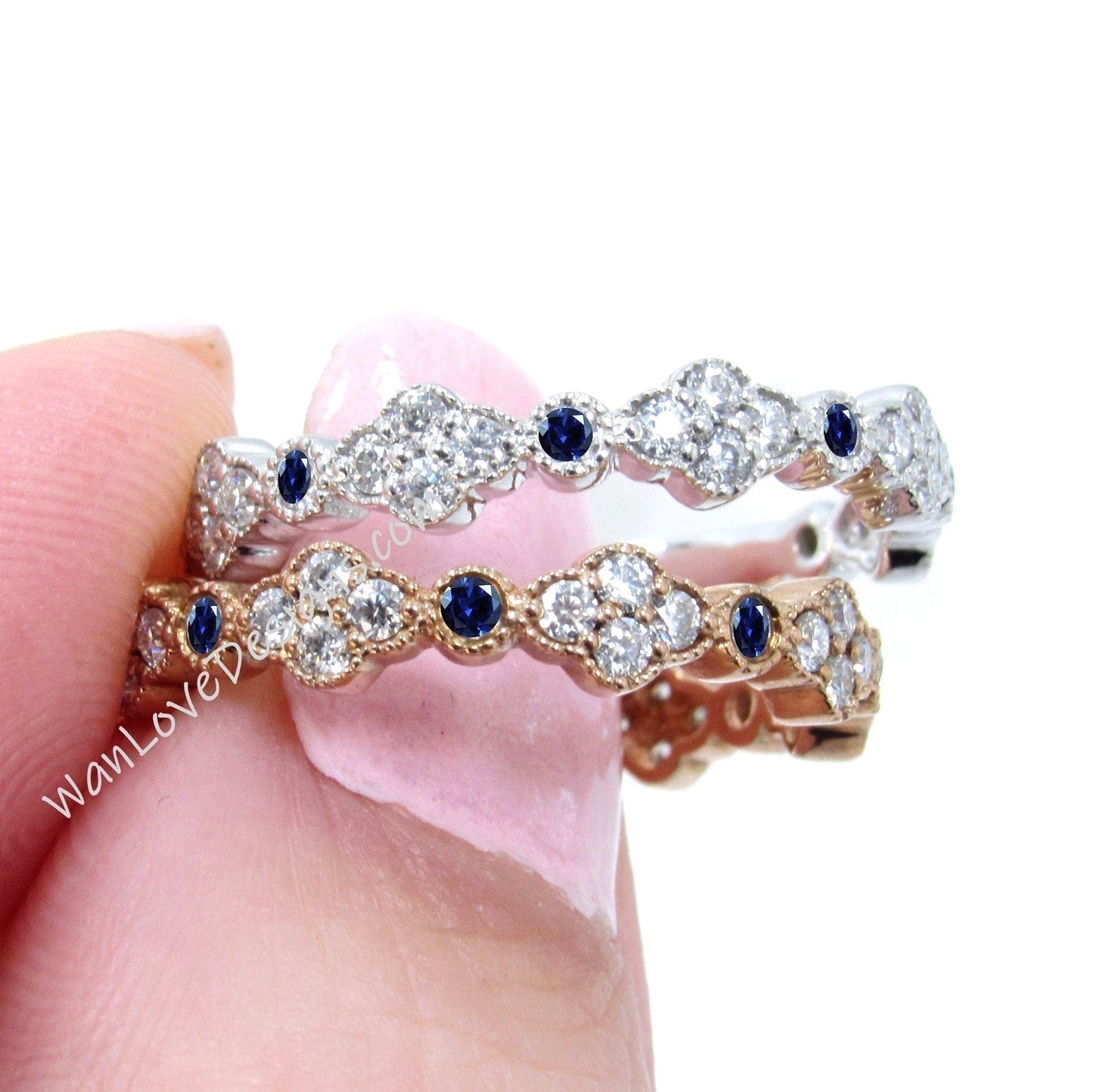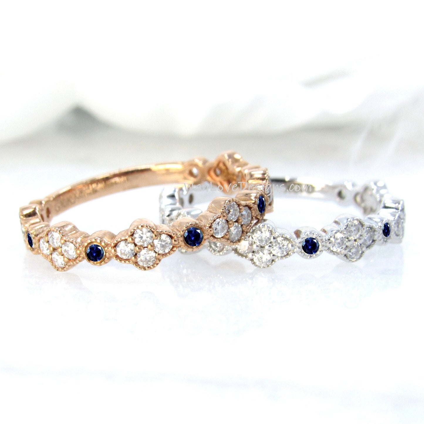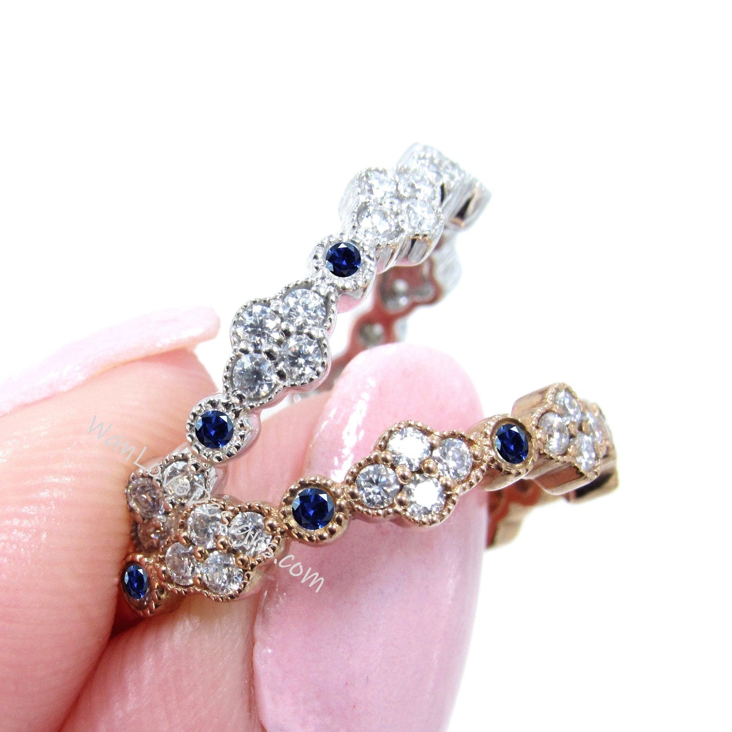 Blue Sapphire Diamond Round Clover Wedding Ring, Quatrefoil 14K Rose Gold Band, Moissanite Wedding Jewelry, Bridal Matching Band,Unique Ring