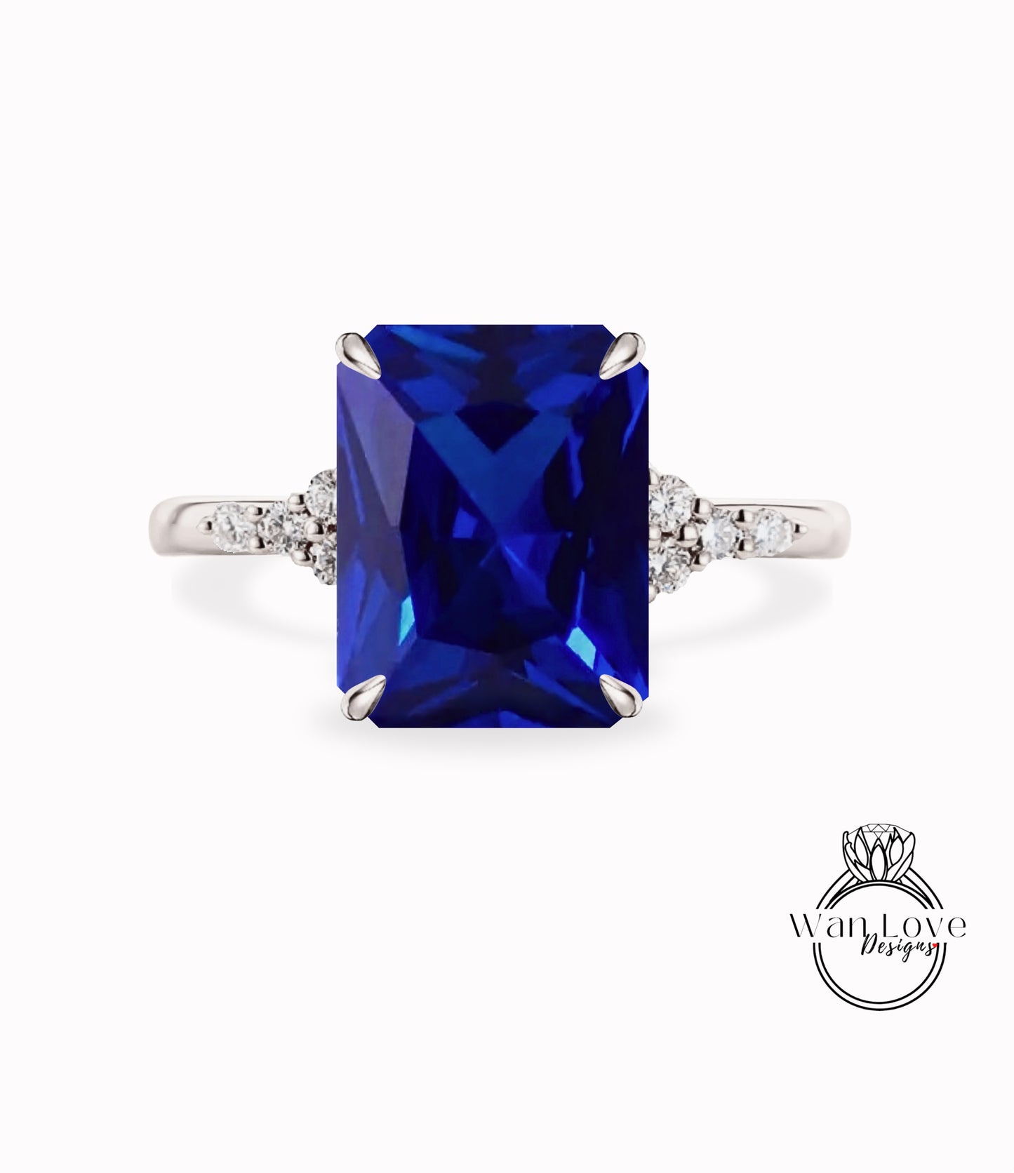 Blue Blue Sapphire engagement ring vintage Emerald cut Moissanite diamond Unique Cluster rose gold engagement ring Bridal promise gift