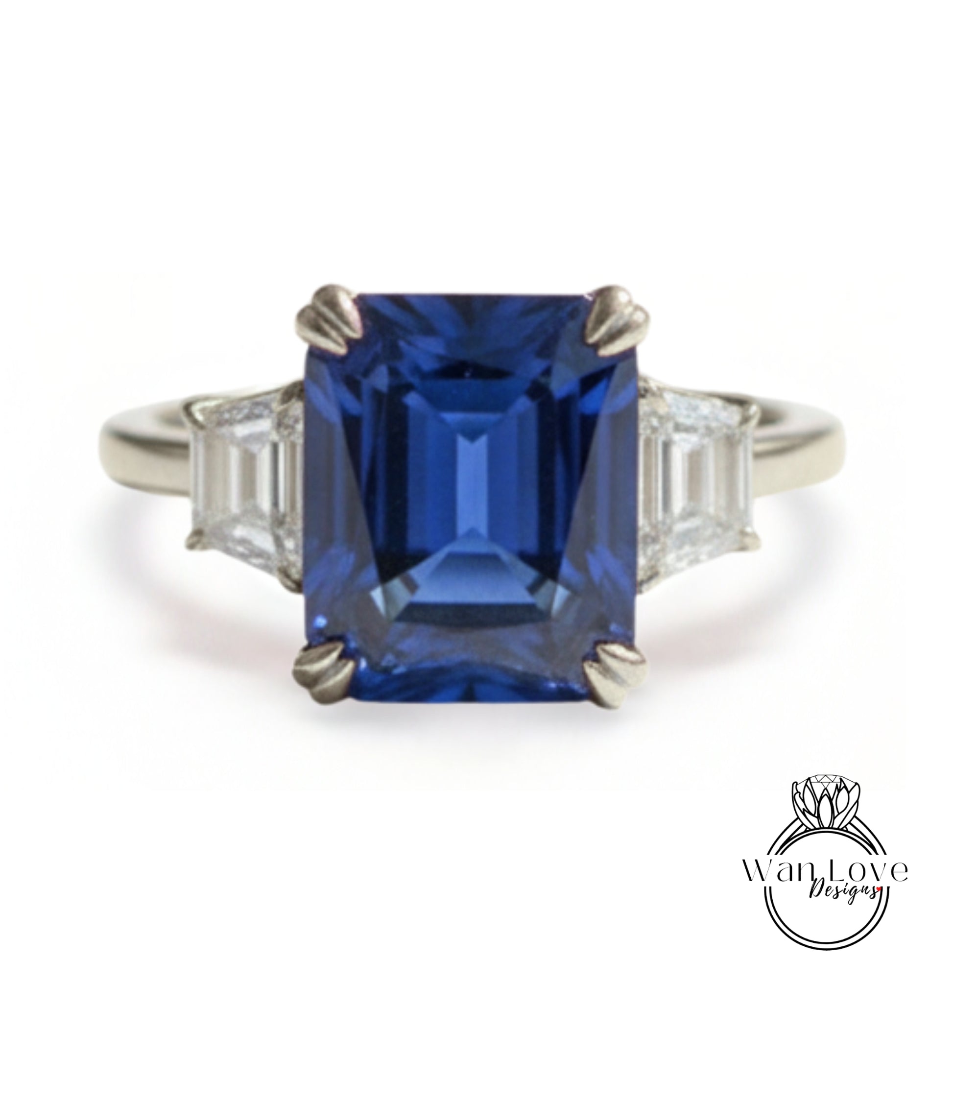 Blue Sapphire Moissanite Engagement Ring Emerald cut 14K/18K rose gold ring vintage trapezoid art deco ring wedding Bridal Anniversary gift