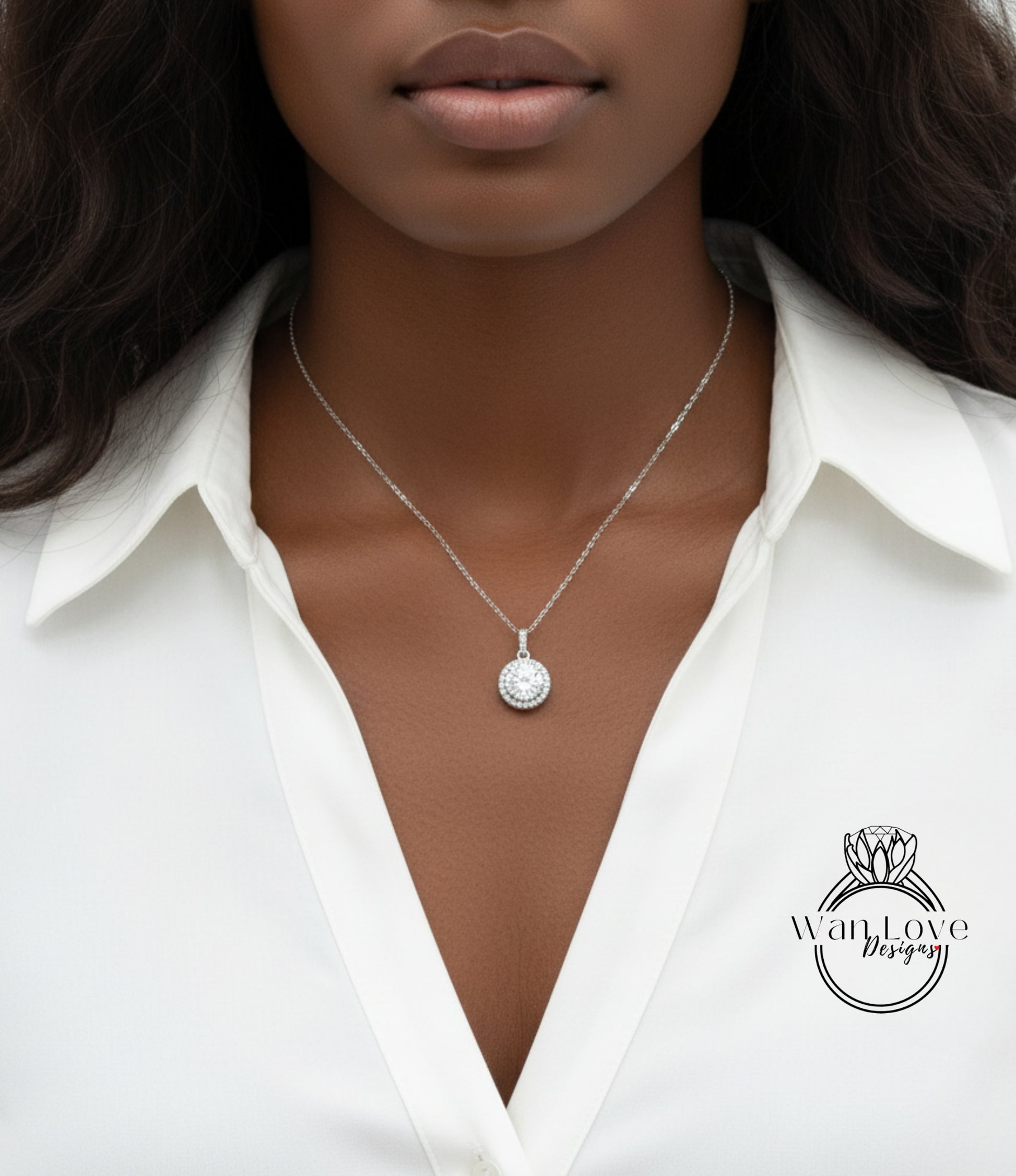 Champagne Moissanite Halo Necklace, Round cut Halo Necklace, White Gold Moissanite Halo Charm, Birthday Gift, Gift For Her, Ready-To-Ship.
