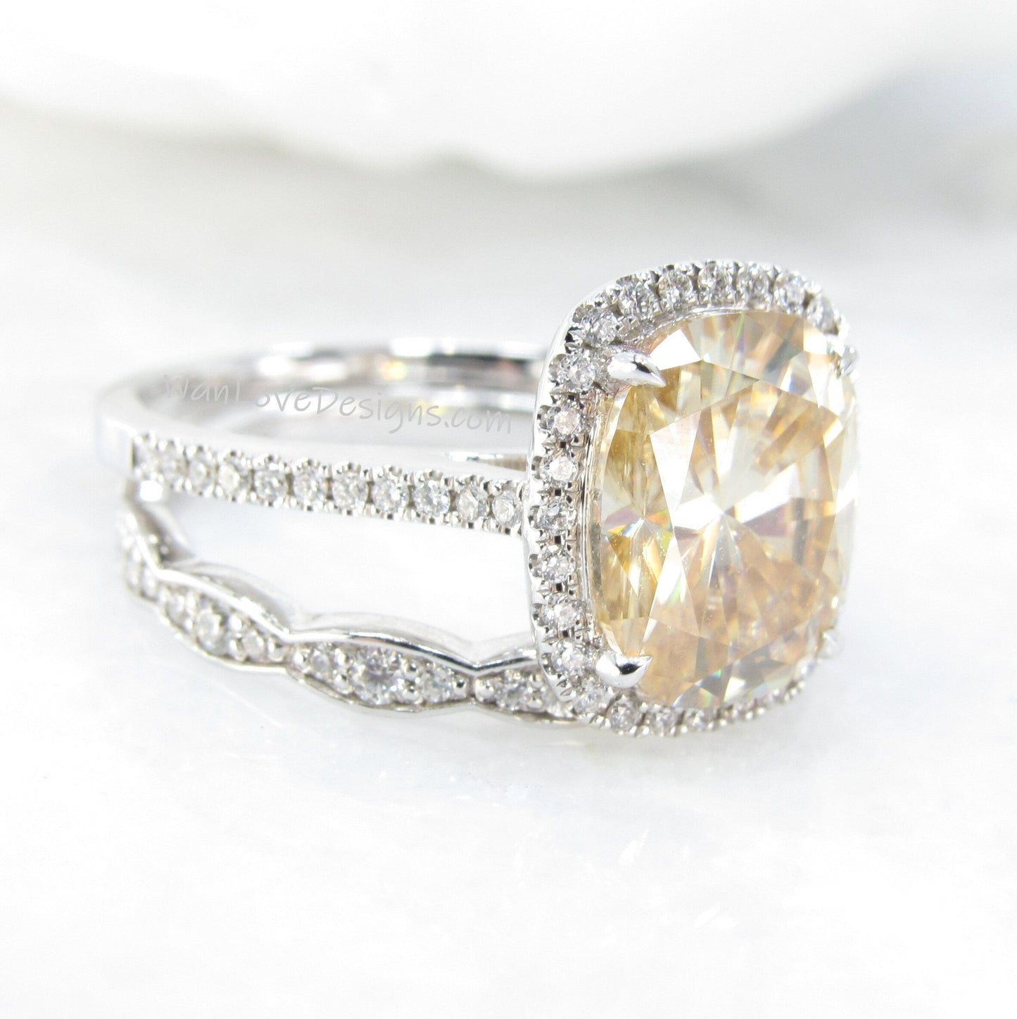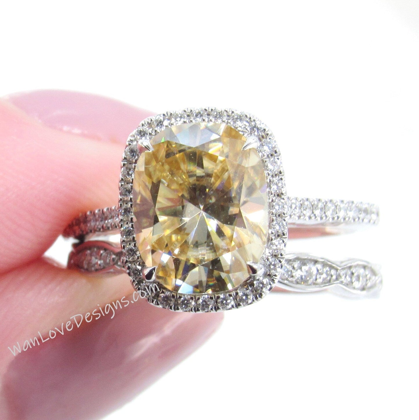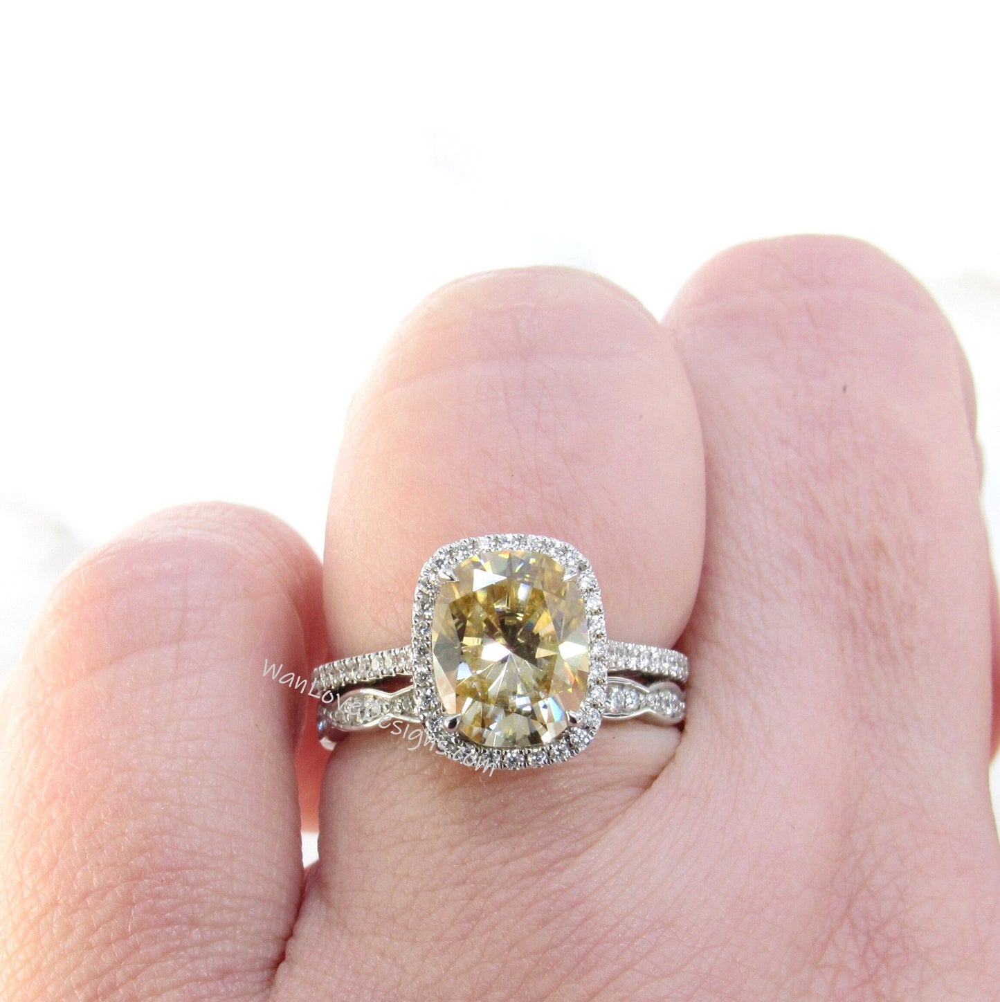 Champagne Yellow Moissanite Diamond Elongated Cushion Halo Engagement Ring Set Scalloped Wedding Band Long-4ct-10x8mm-Custom-Ready to Ship.