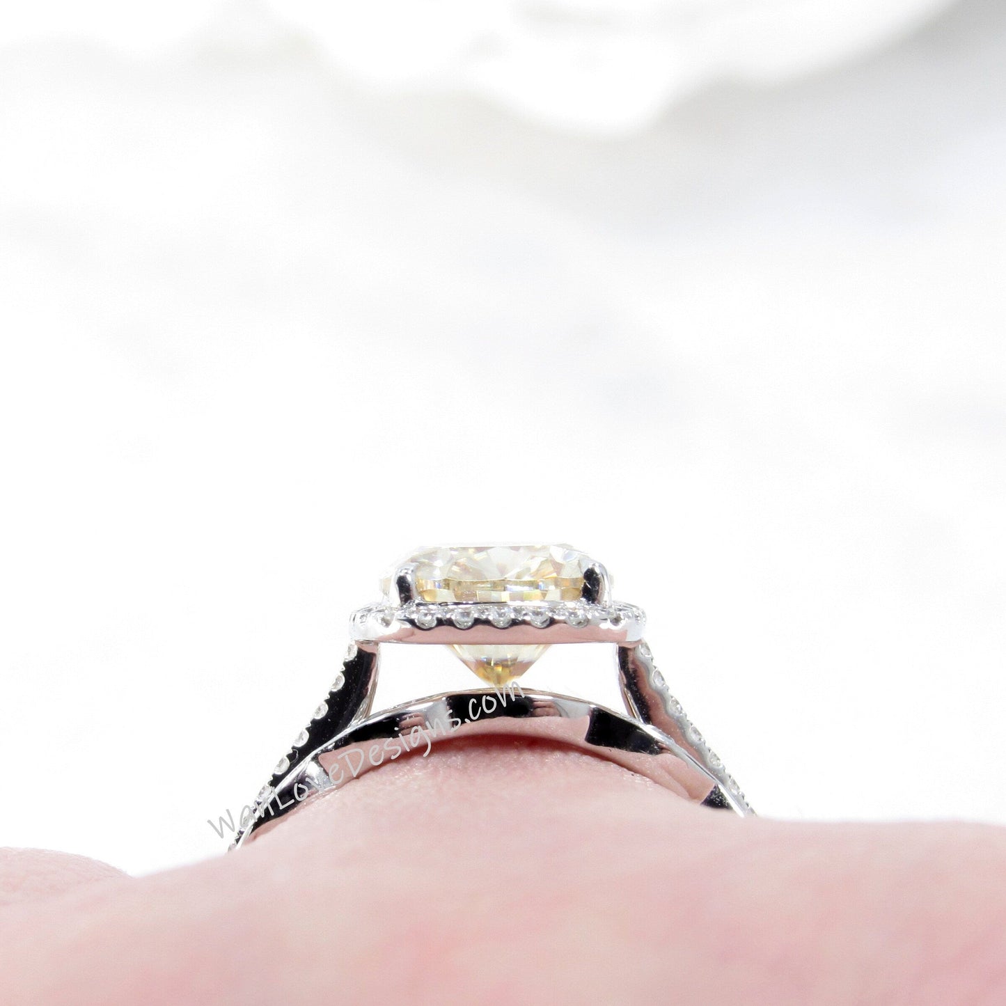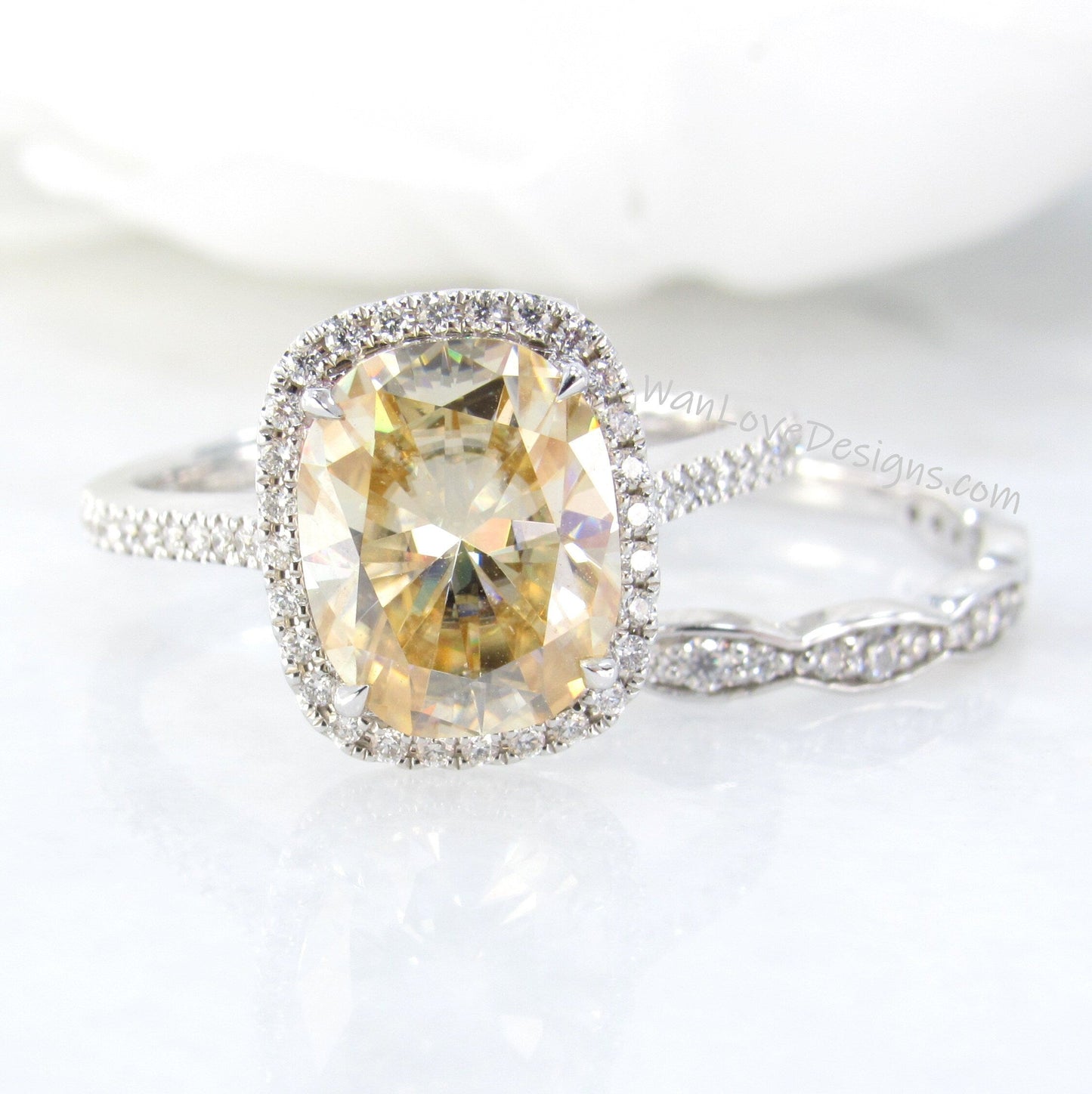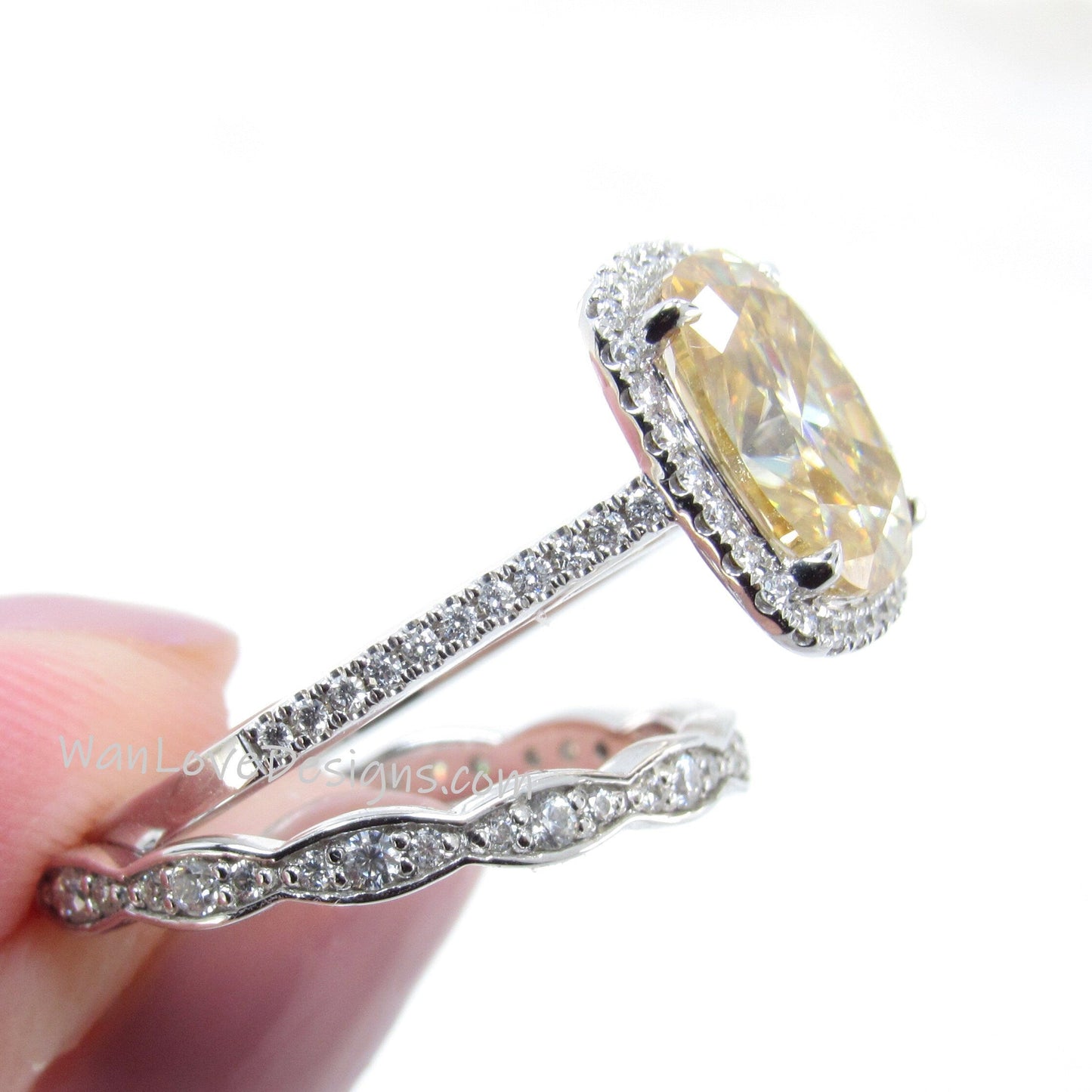 Champagne Yellow Moissanite Diamond Elongated Cushion Halo Engagement Ring Set Scalloped Wedding Band Long-4ct-10x8mm-Custom-Ready to Ship.