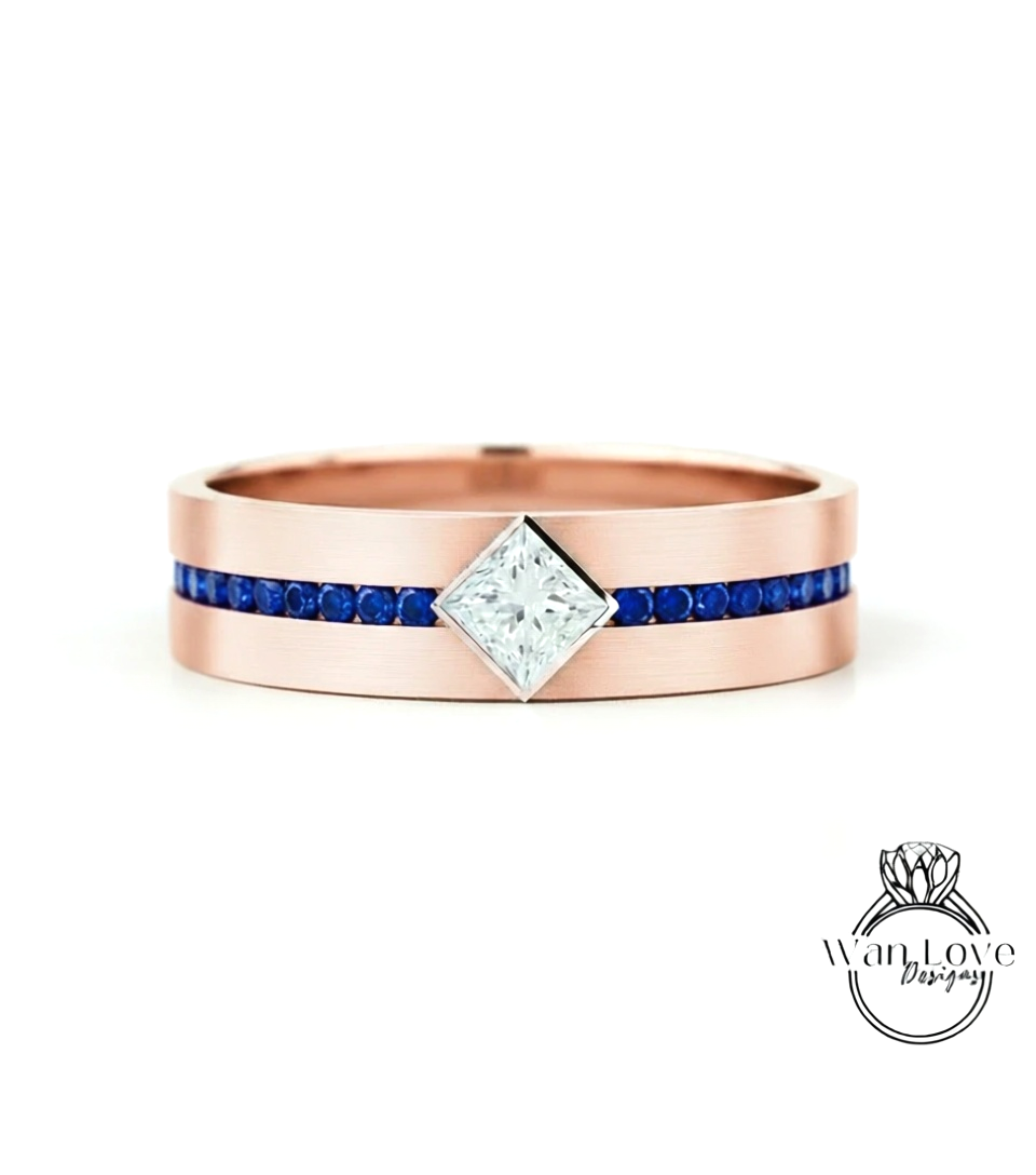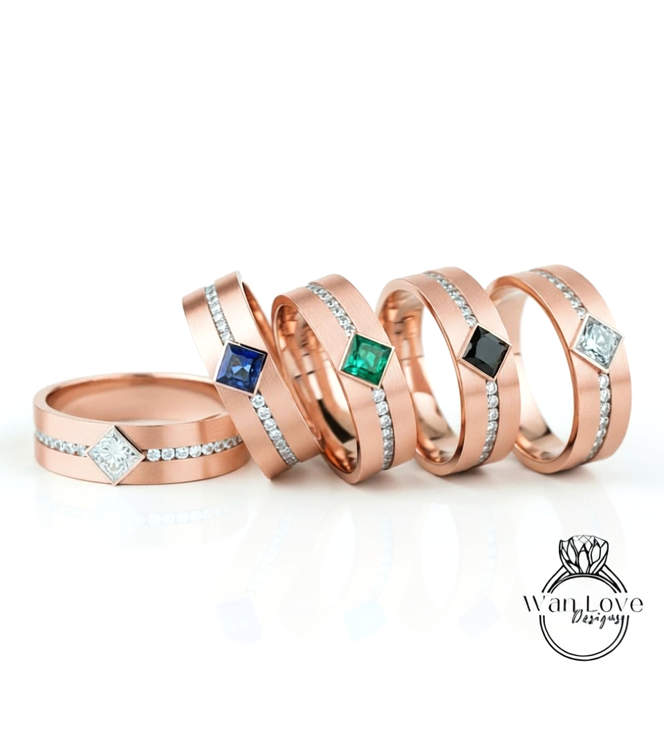 Diamond Mens Wedding Band, Princess Cut kite Set Diamonds Mens Wedding Band, Solid Gold 10k/14k/18k Wedding Ring, Mens Birthstone Ring