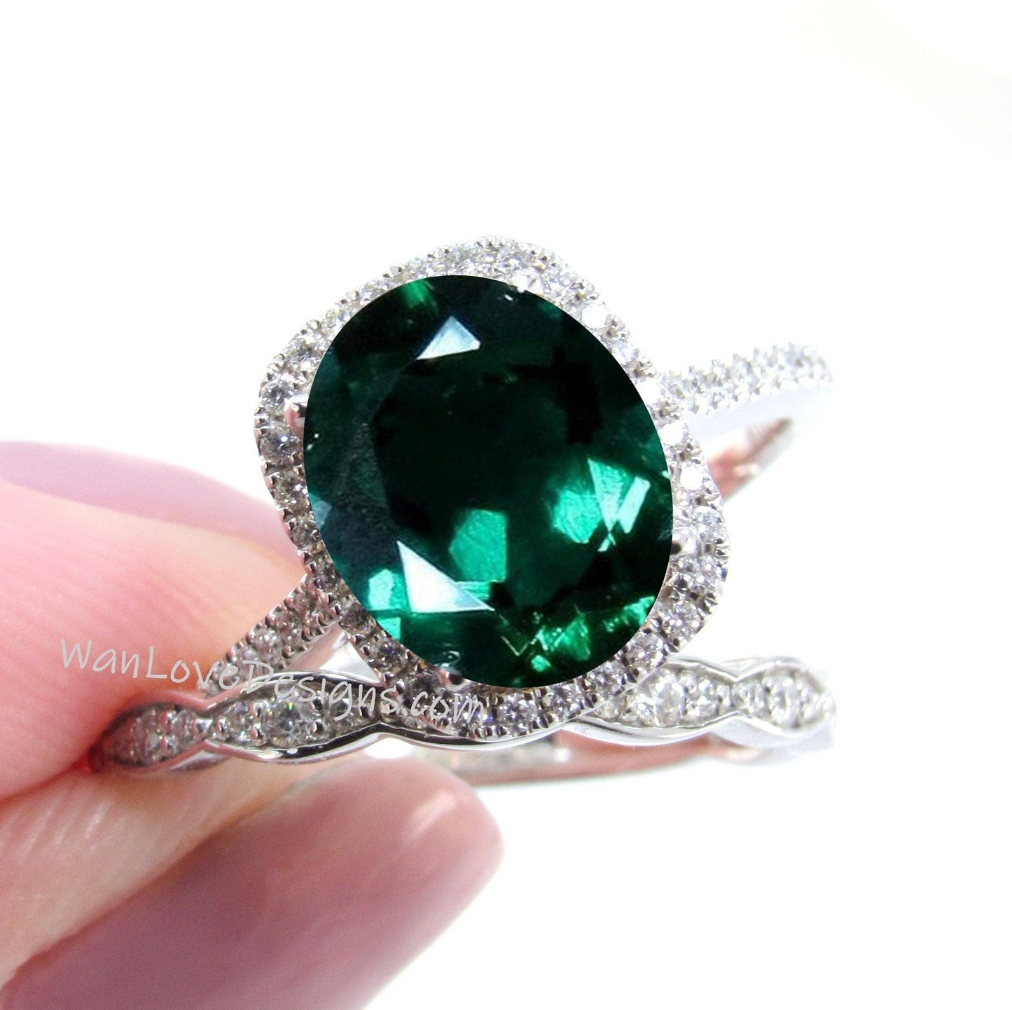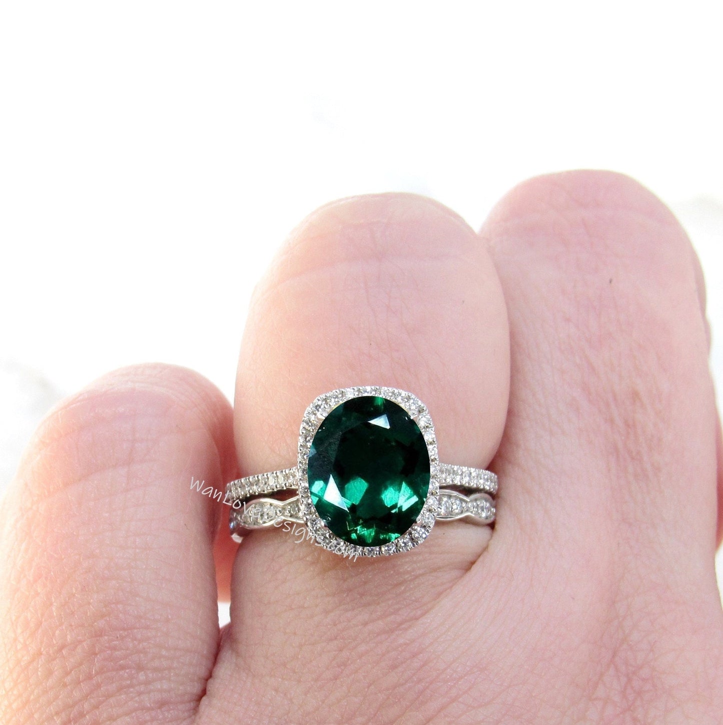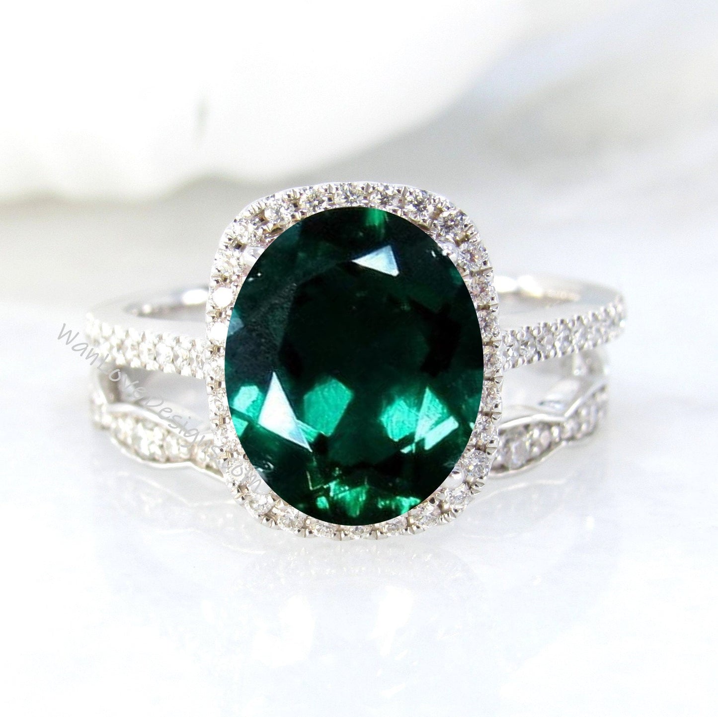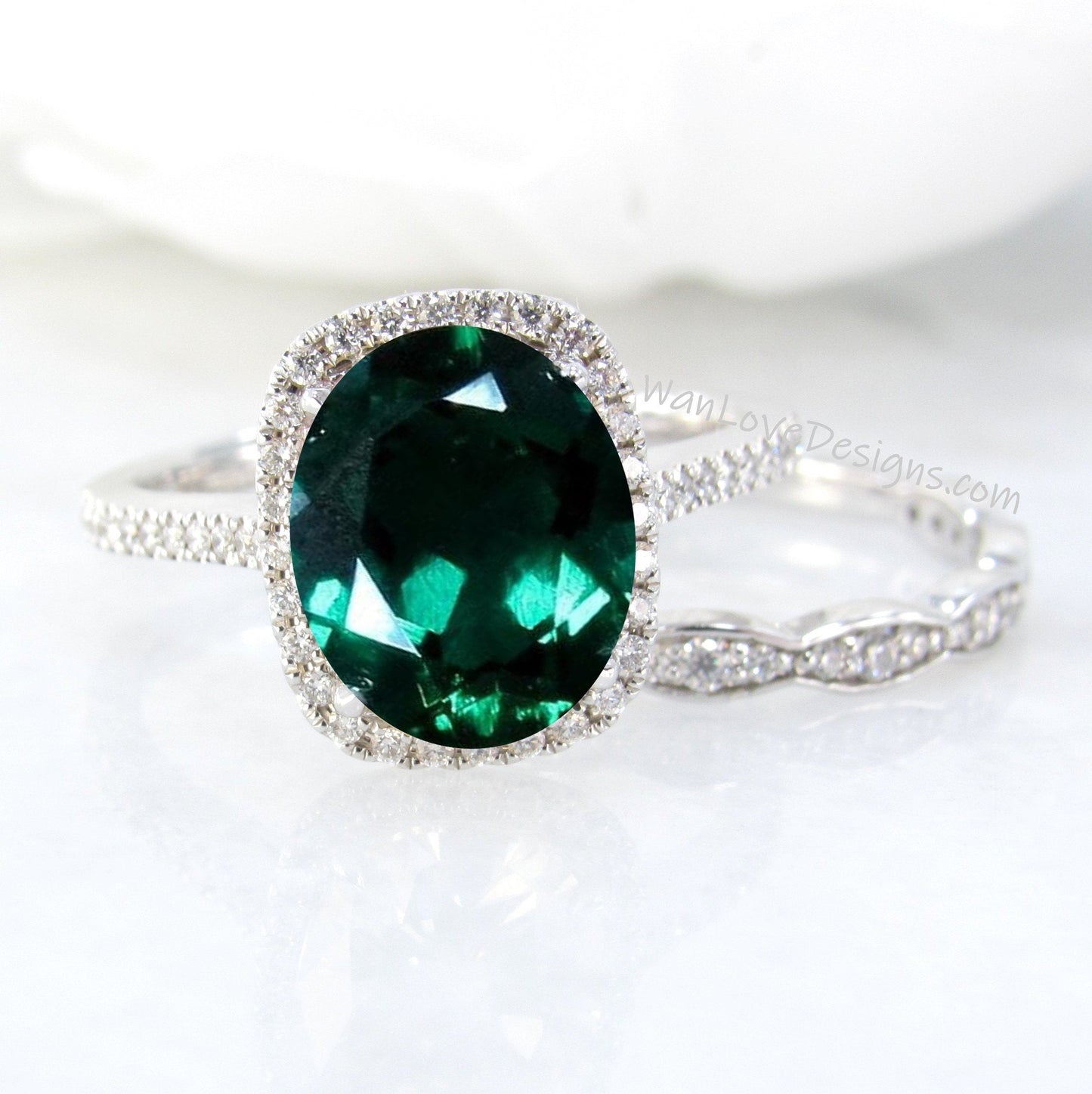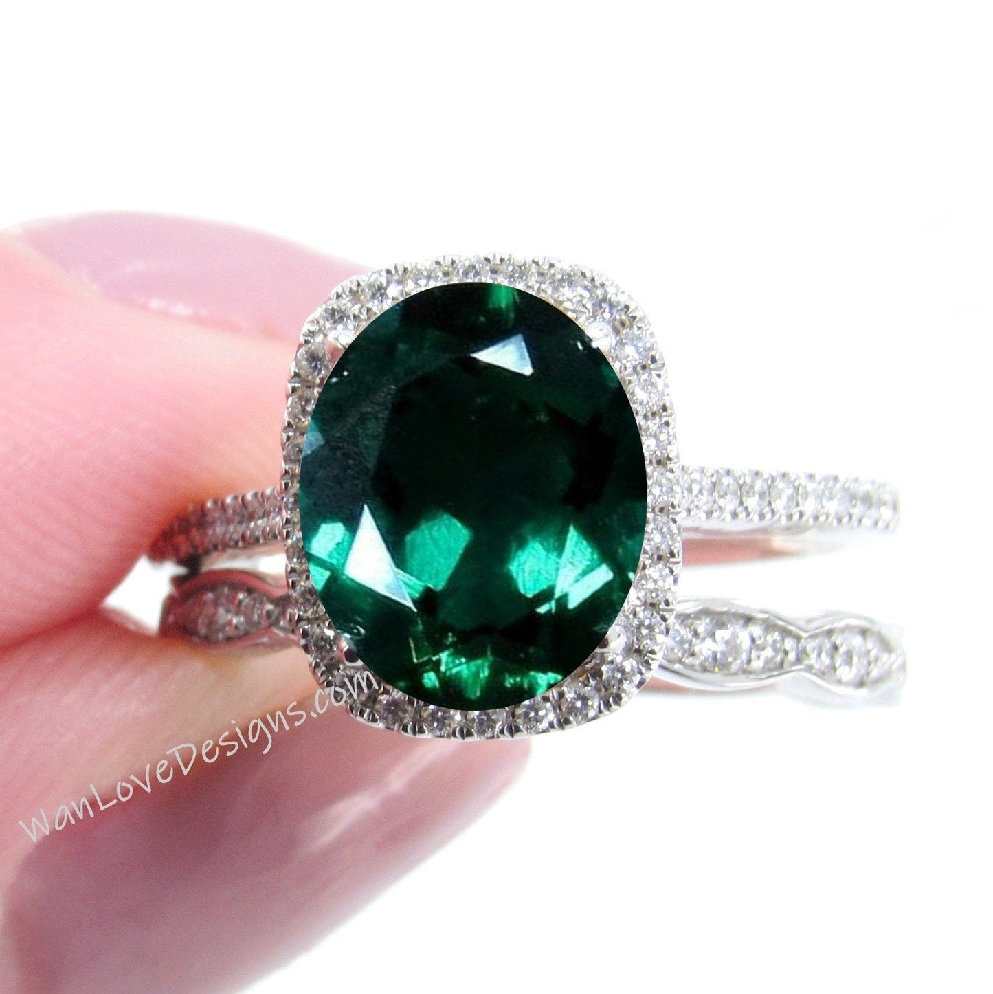 Elongated Cushion Halo Emerald Diamond Engagement Ring&Scalloped Wedding Band Set Custom, Oval 14k 18k White Yellow Rose Gold