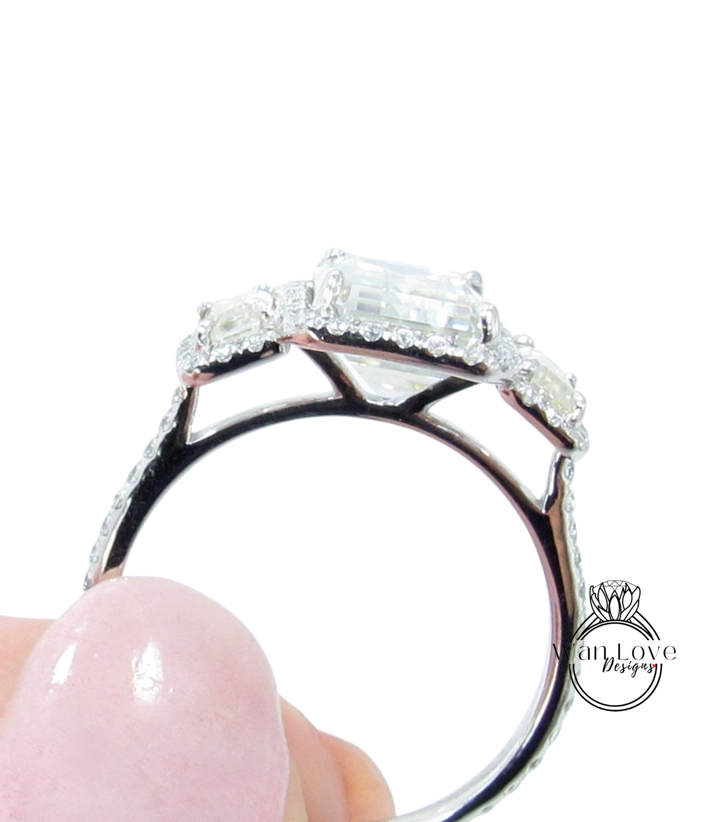 Emerald cut Grey Moissanite & Diamond halo engagement ring cushion cut half moon rose gold art deco diamond three stone triple halo ring wedding Bridal ring Anniversary gift