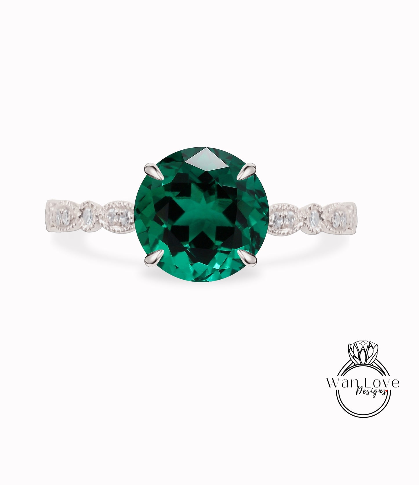 Emerald Round & Diamond Art Deco Vintage Pave WITH or WITHOUT Milgrain Engagement Wedding Rings, 14kt 18kt Solid Rose White Yellow Gold