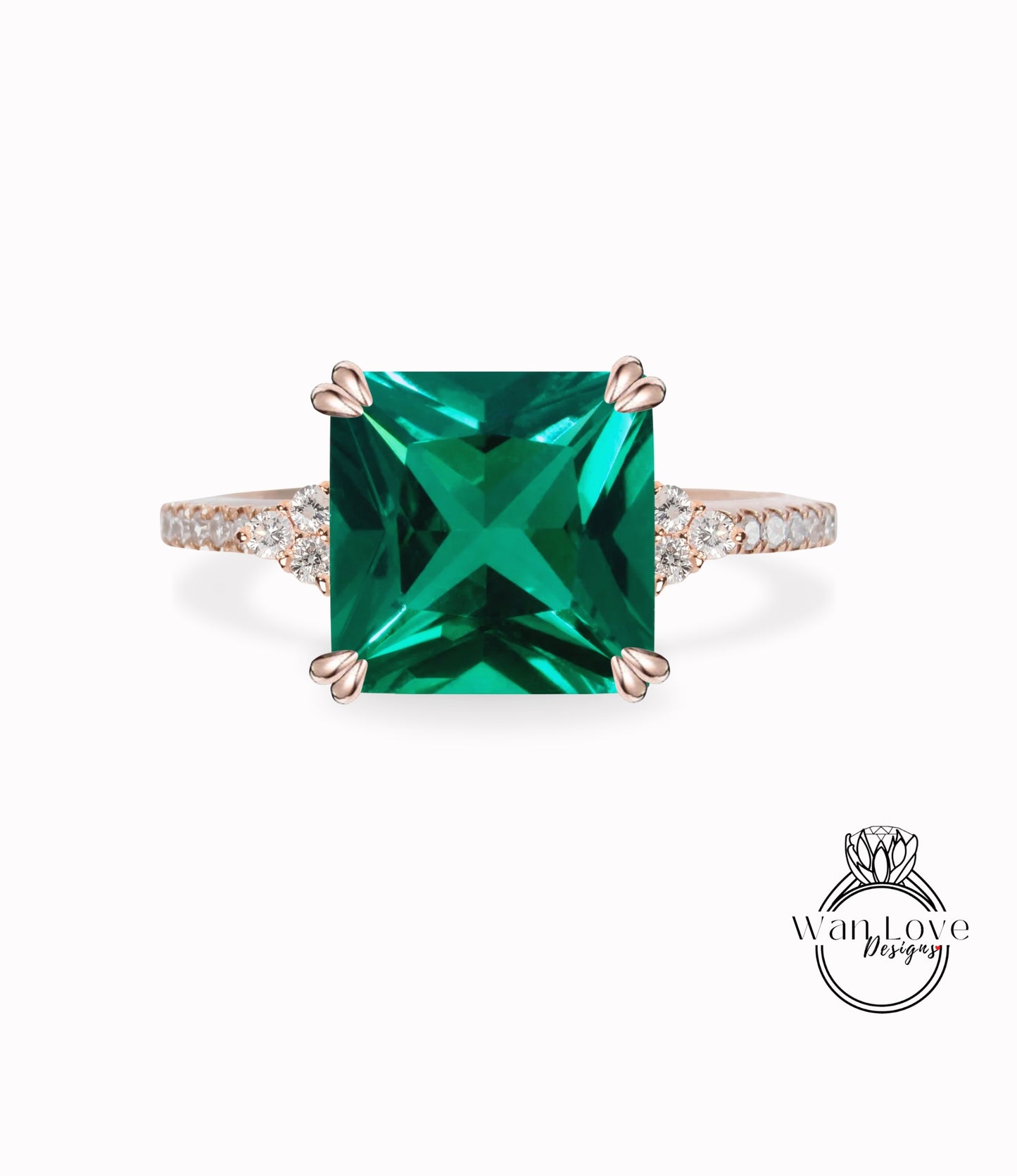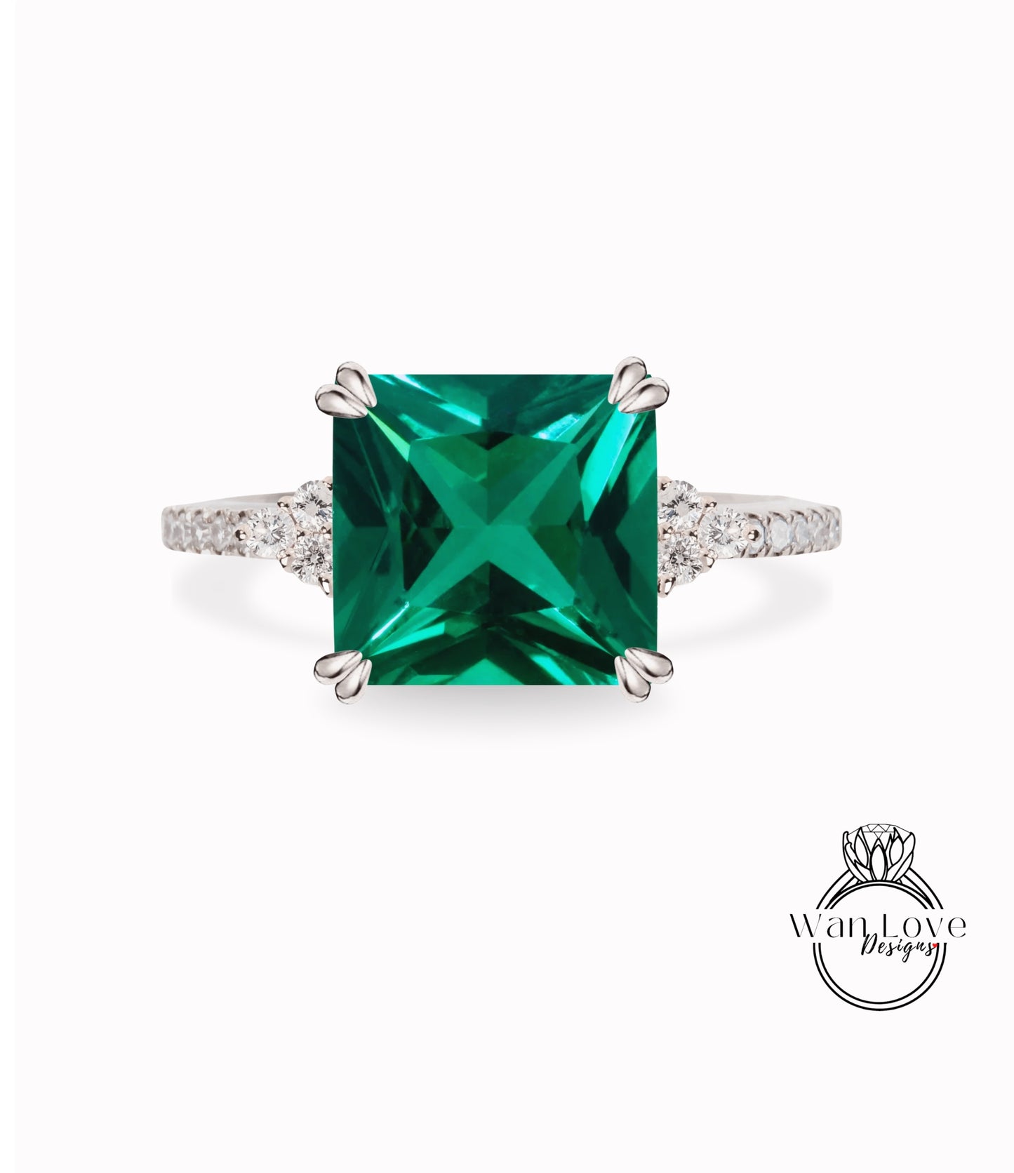 Emerald & Diamond Asscher Trio Pave Engagement Ring, 3 gemstone, Custom, 14kt 18kt Gold, Platinum, Wedding, Anniversary, WanLoveDesigns.