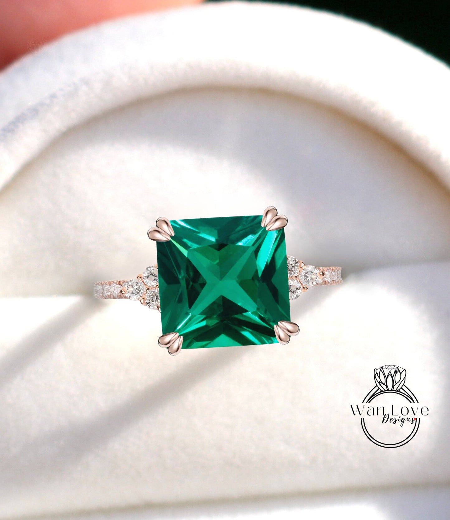 Emerald & Diamond Asscher Trio Pave Engagement Ring, 3 gemstone, Custom, 14kt 18kt Gold, Platinum, Wedding, Anniversary, WanLoveDesigns