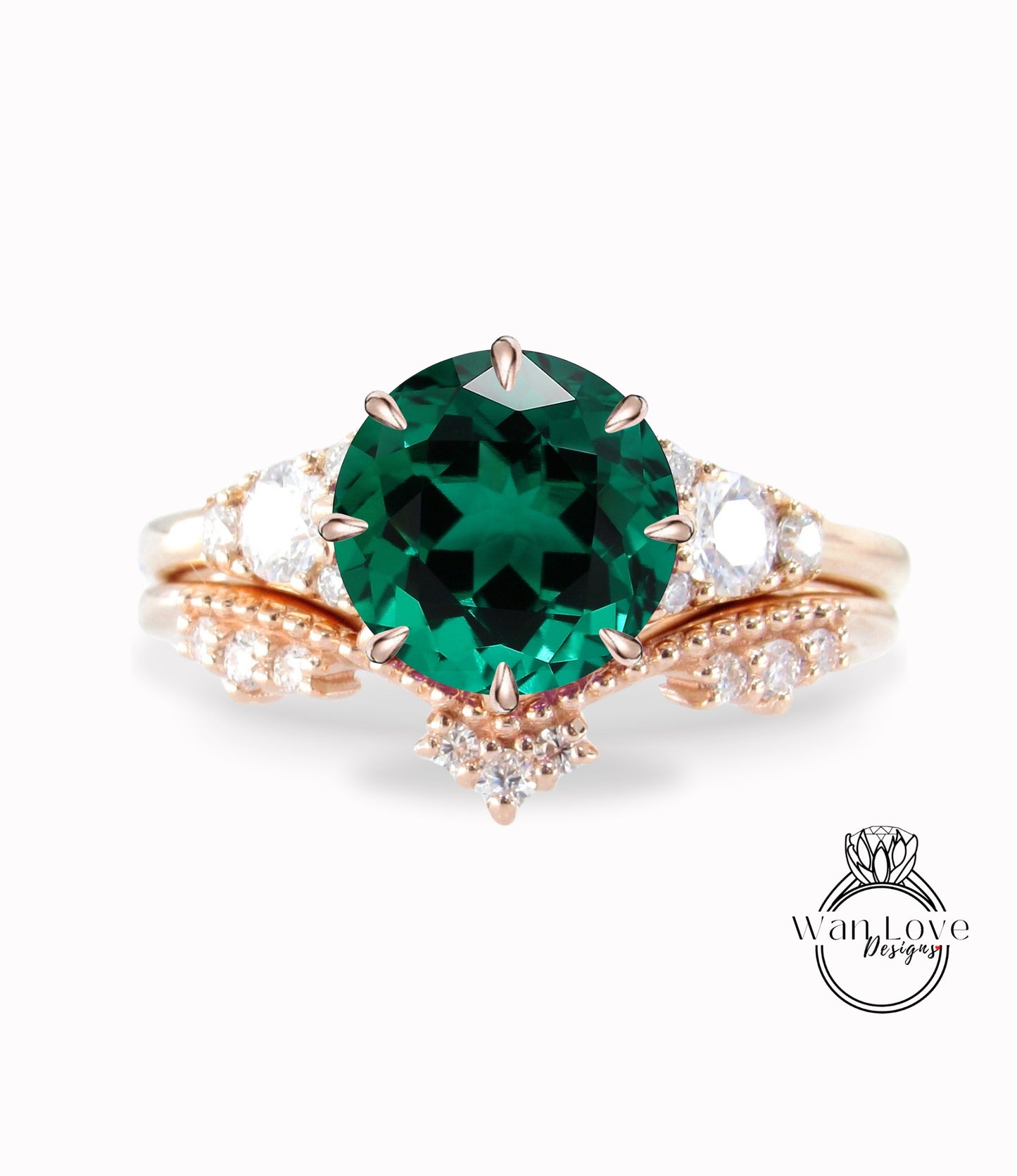 Unique Rose gold Emerald engagement ring set Round Cluster Royal ring Round women Curved crown Diamond wedding Band Ring Bridal gift
