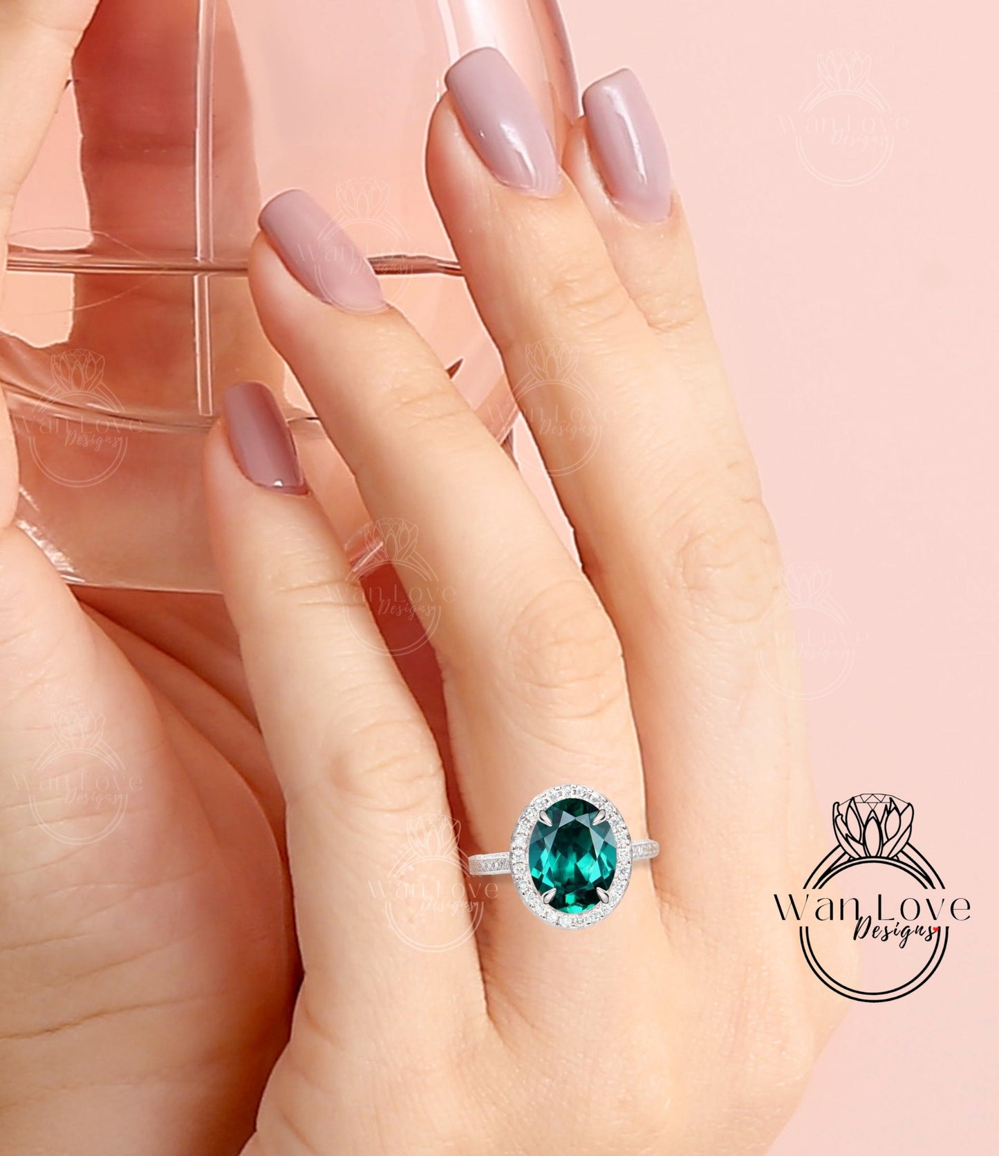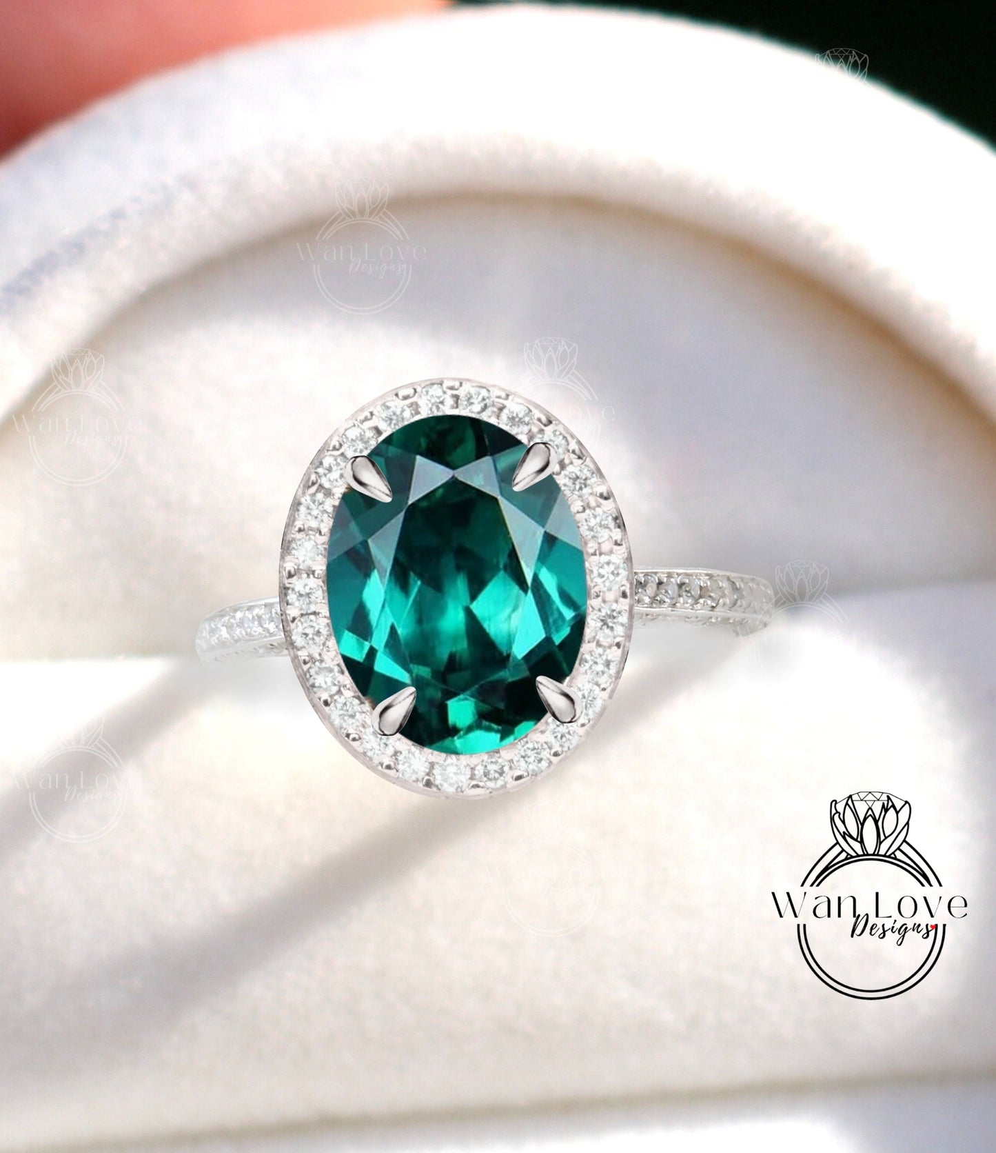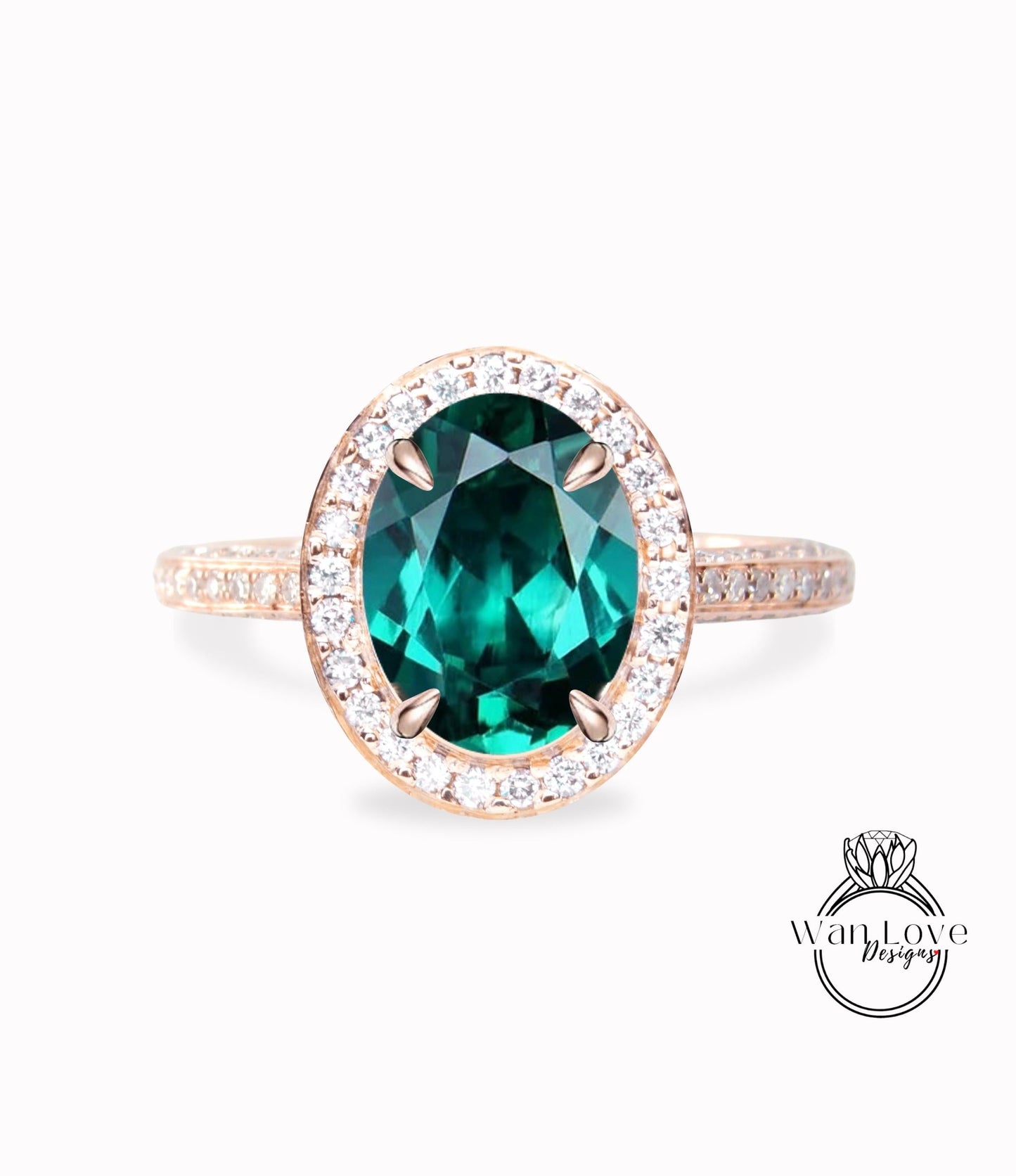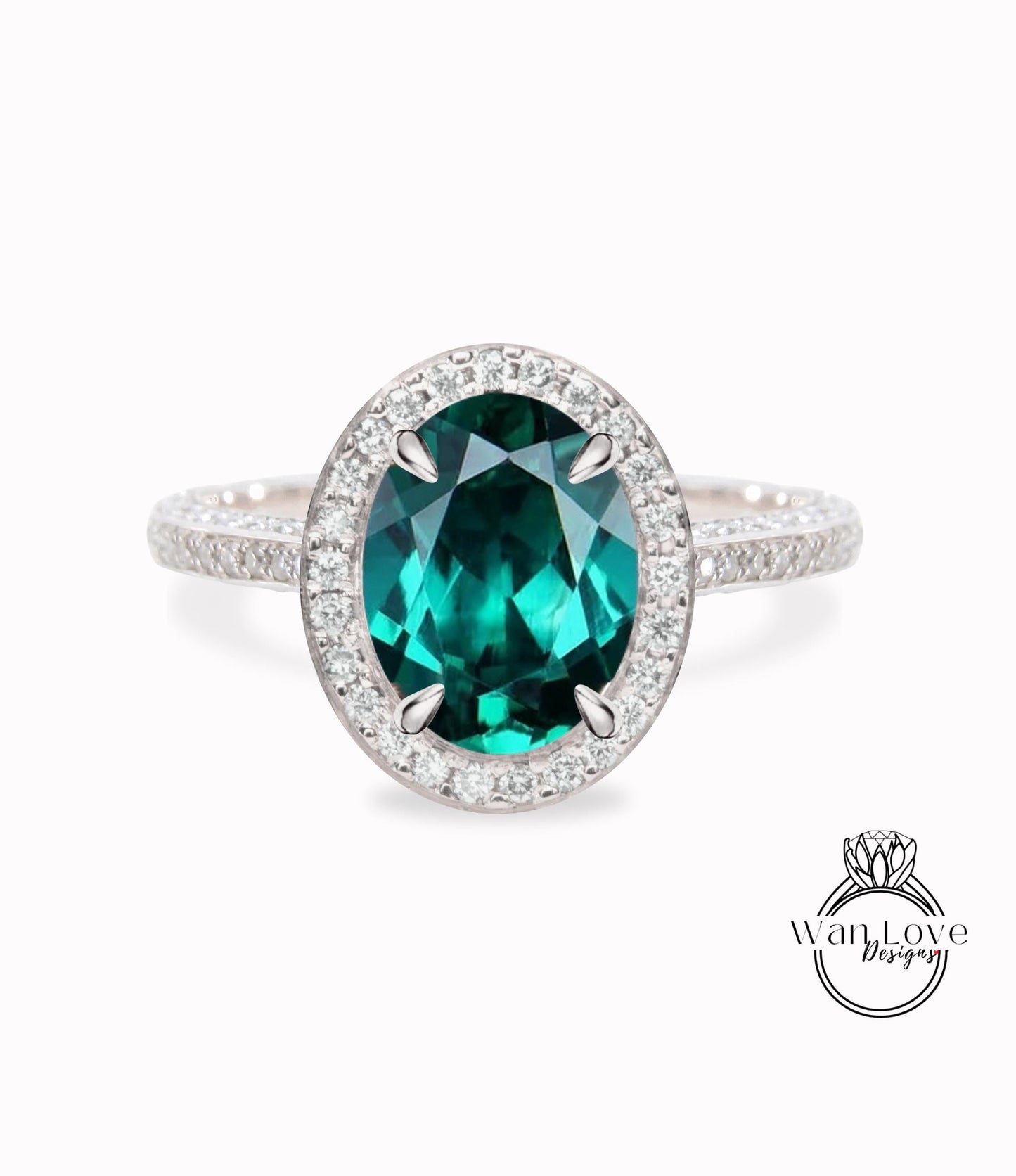 Emerald & Diamond Oval Halo 3 sided Engagement Ring, 14k 18k White Yellow Rose Gold, Platinum, Wedding, Anniversary Gift