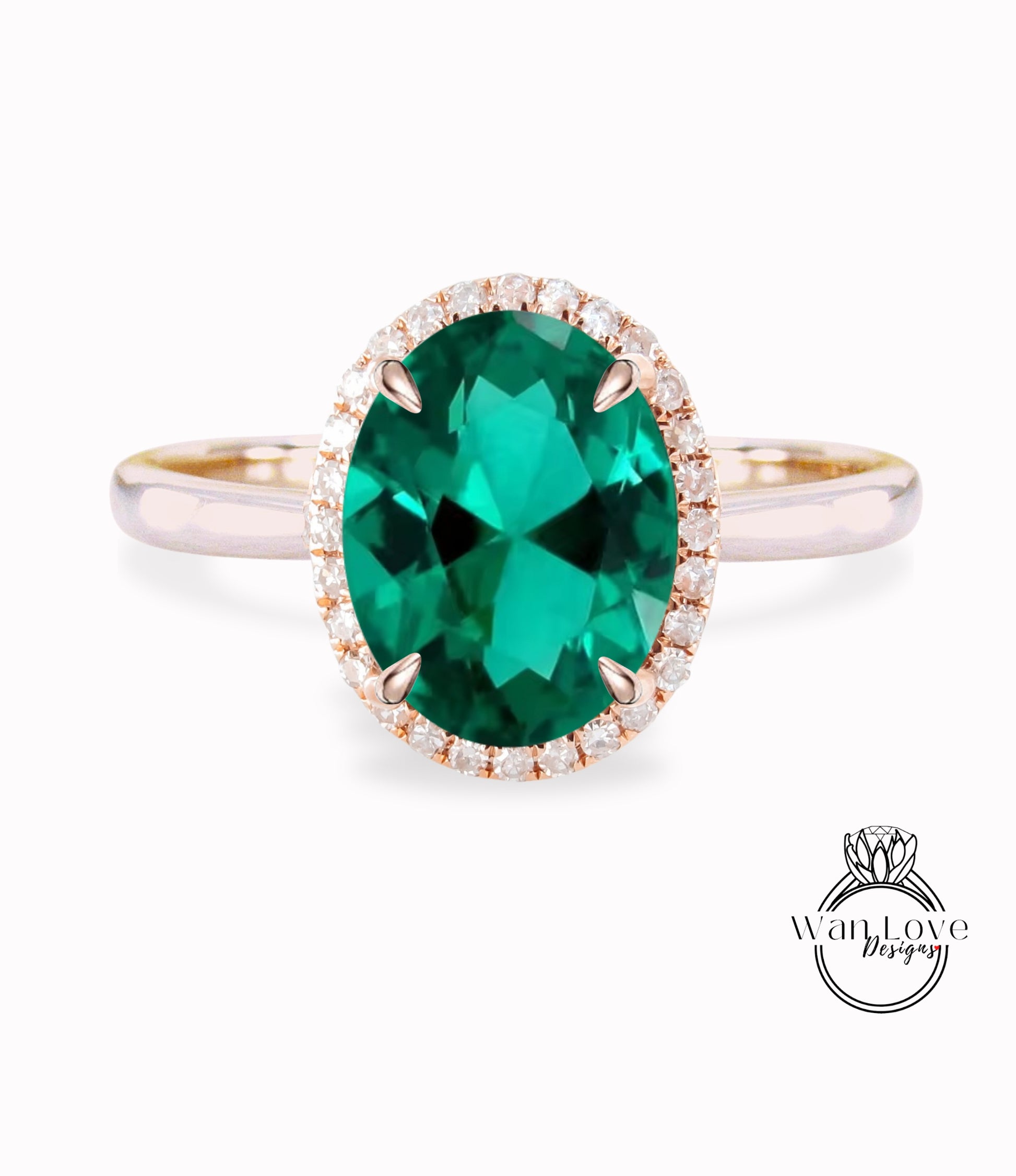 Emerald & Diamond Oval Halo tapered plain thin dainty band engagement ring rose gold art deco anniversary gift