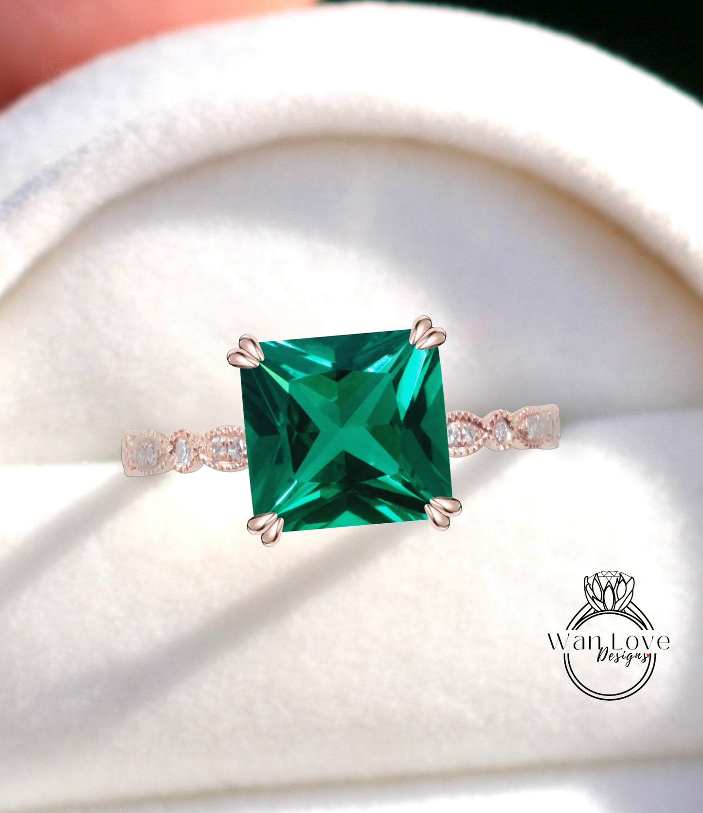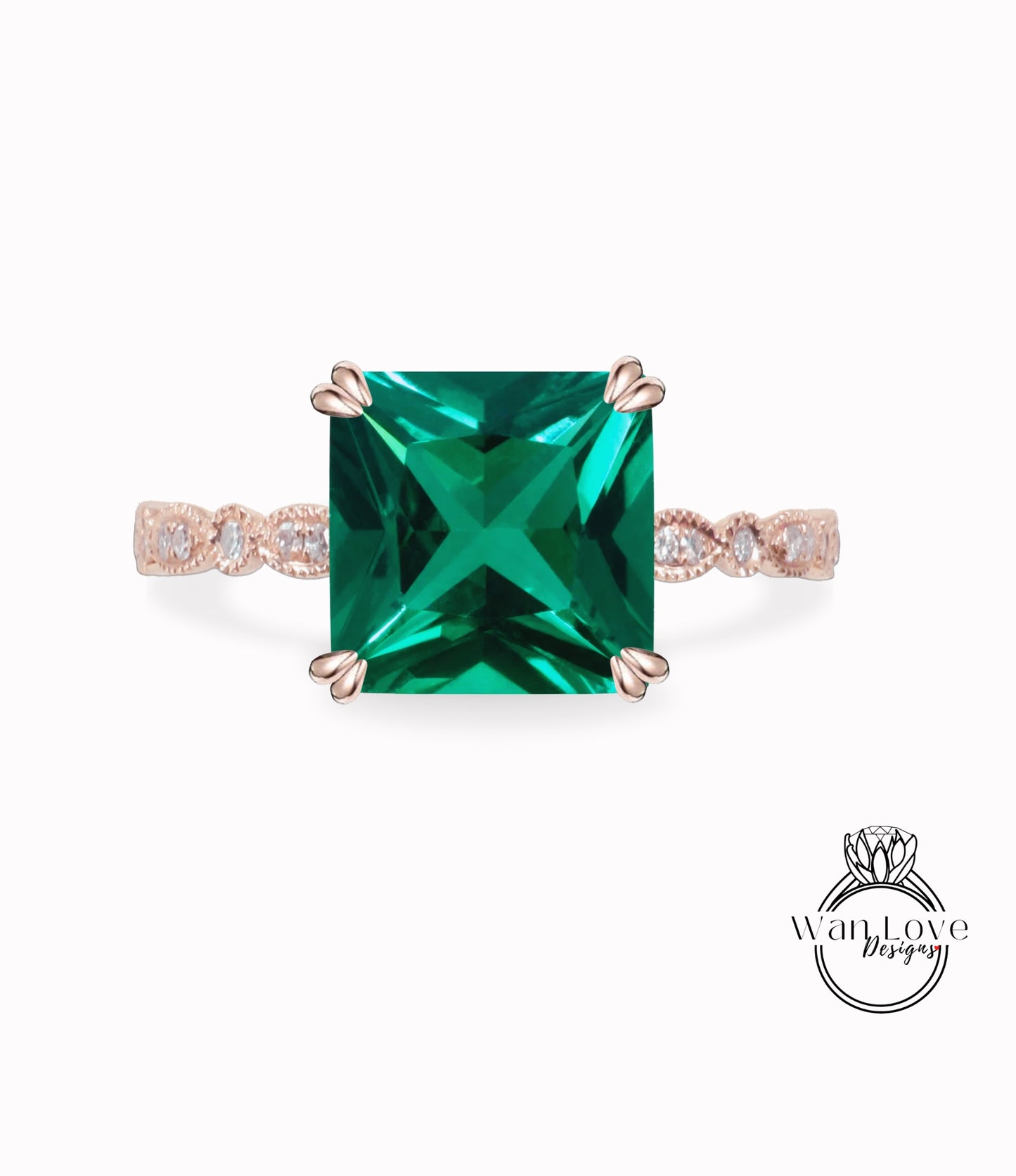 Emerald & Diamond Scalloped Princess Engagement Ring-Square-Cathedral Custom-14k 18k Gold-Platinum, Bridal Wedding ring-Anniversary gift