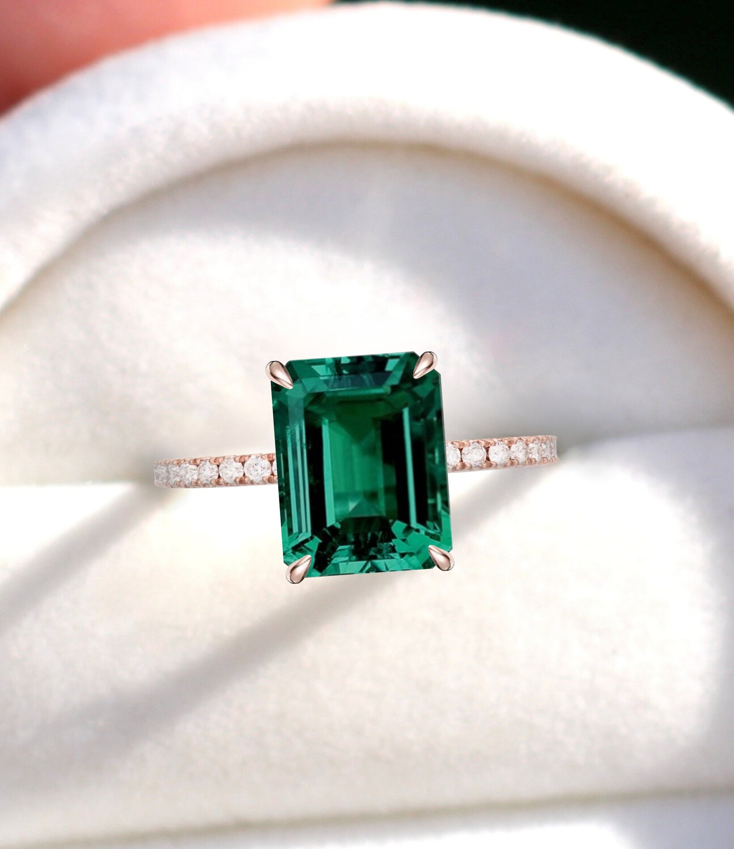 Emerald & Diamond Side Halo half halfway eternity Engagement Ring, Emerald cut Pave Rim wedding bridal ring 14kt 18kt Solid Gold Anniversary Gift
