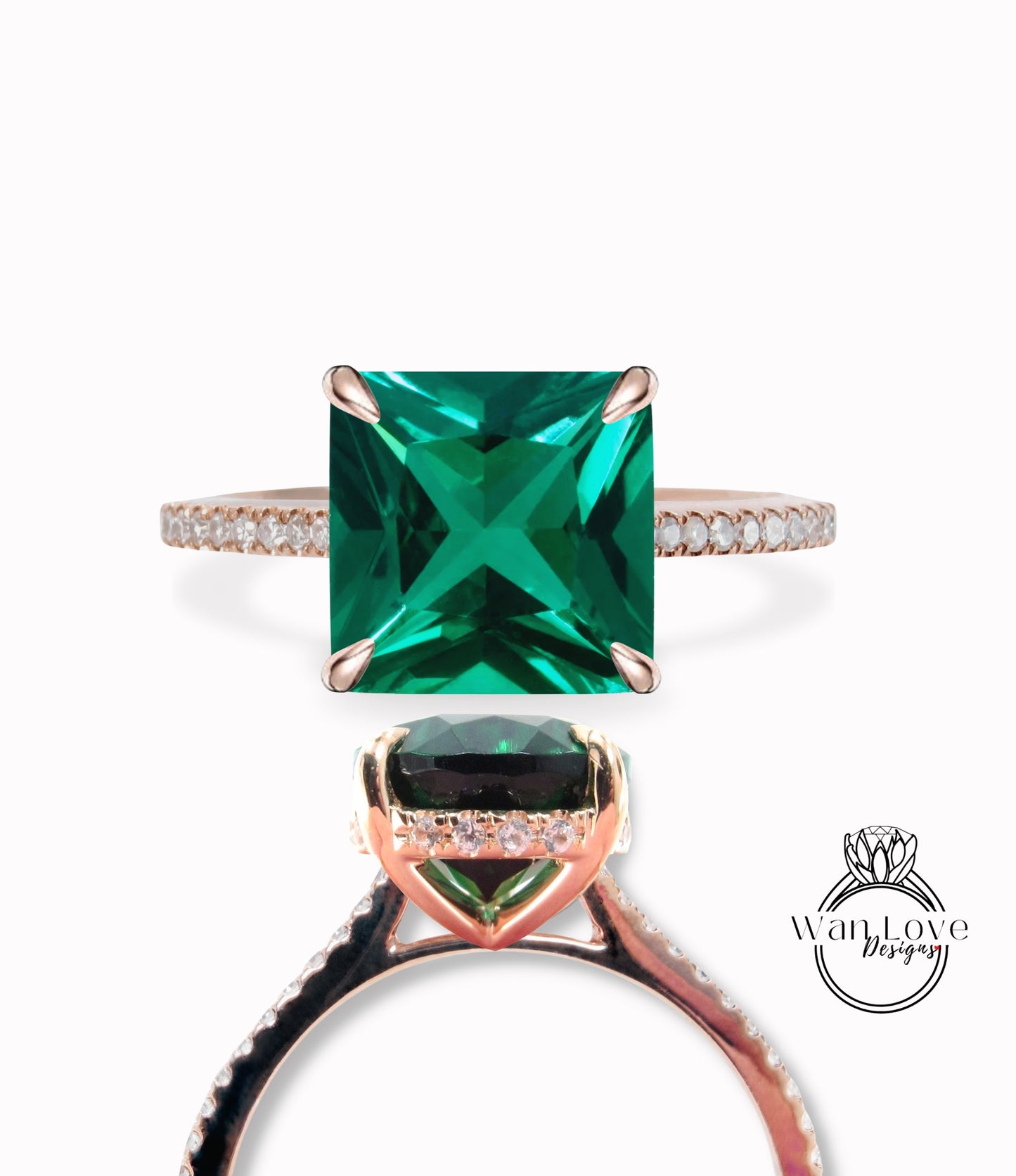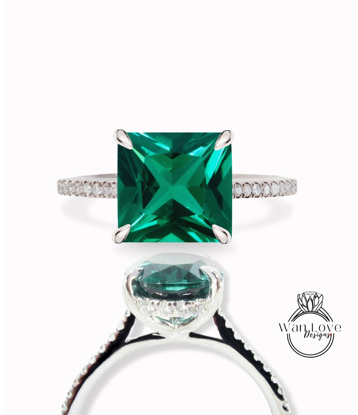 Emerald & Diamond Side Halo Princess Engagement Ring, 3/4 Almost Eternity, Custom, Square, 14kt 18kt Gold, Platinum, Anniversary Gift