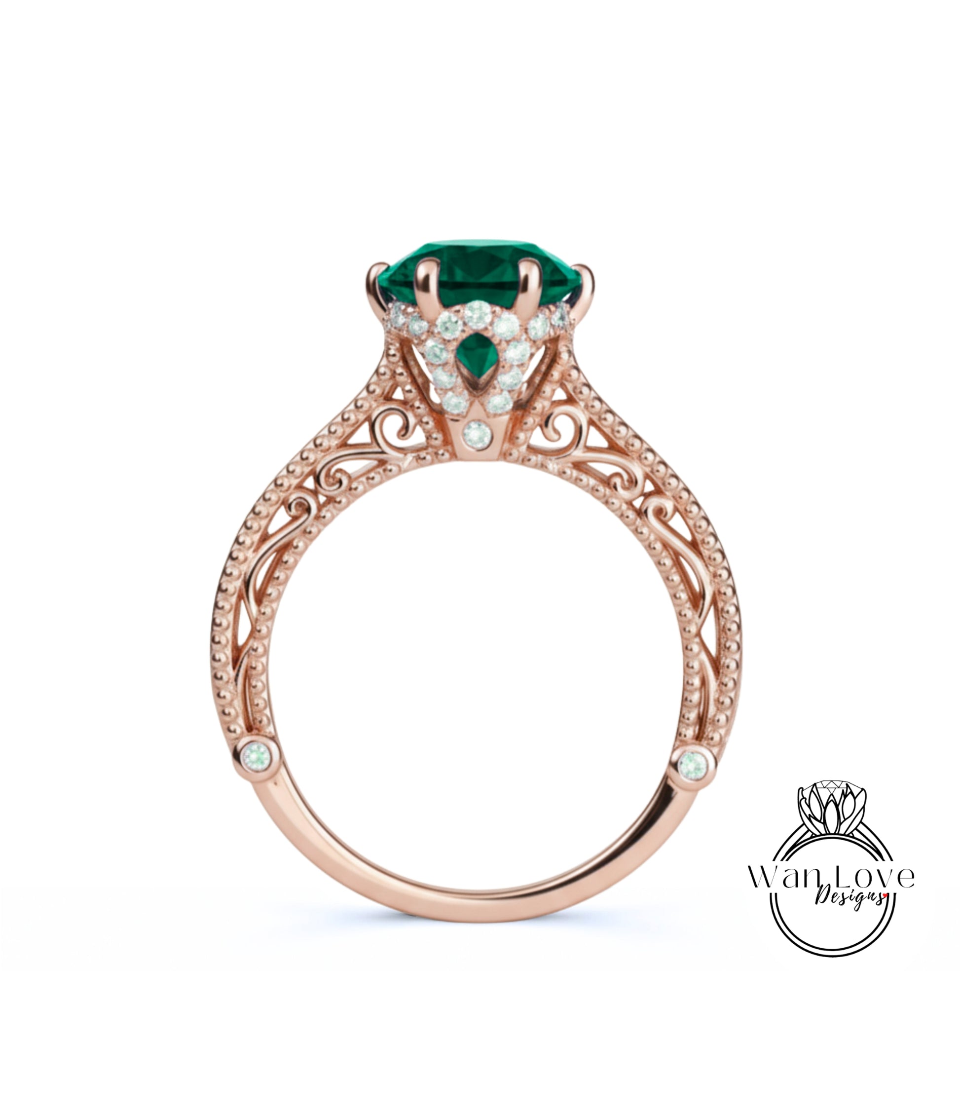 Emerald & Diamonds Round Beaded Milgrain Engagement Ring unique vintage filigree Rose Gold Anniversary Gift antique wedding bridal ring