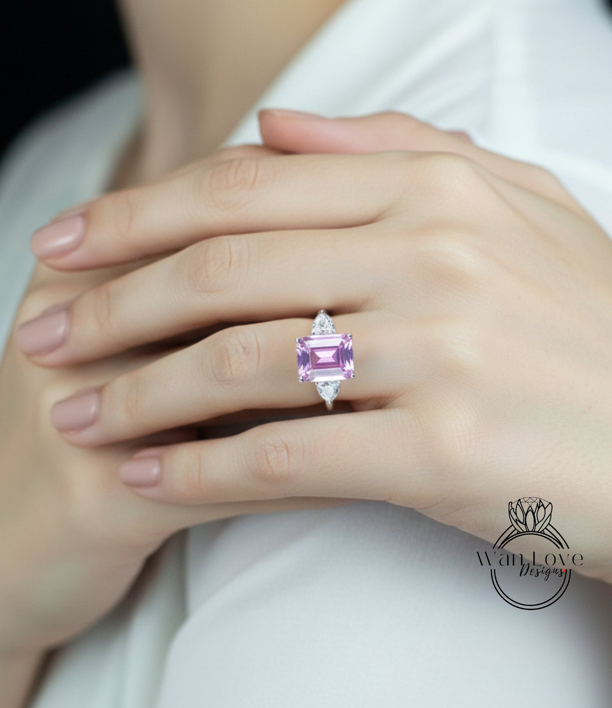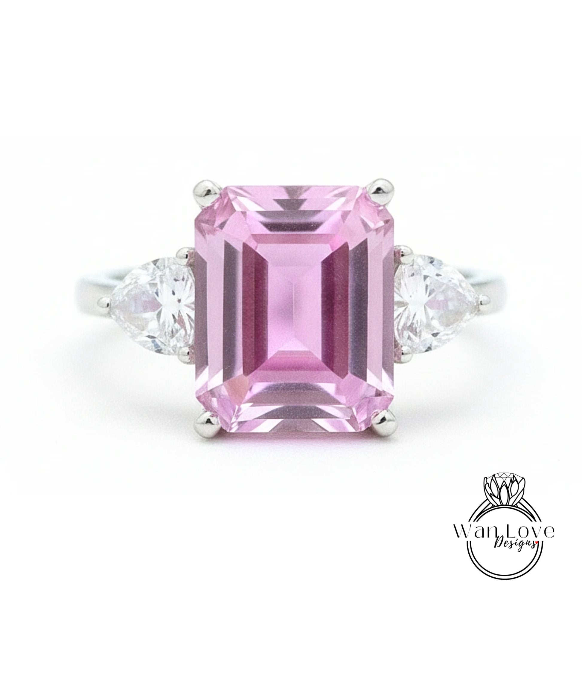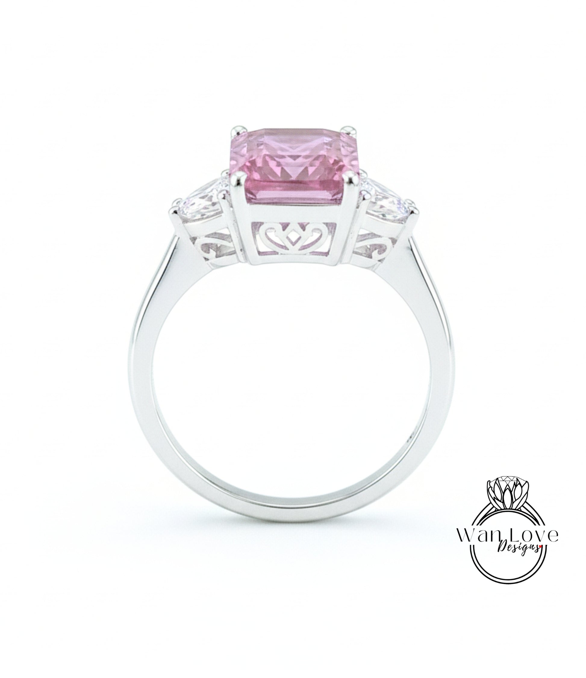 Emerald Trillion Pink White Sapphire Engagement Ring Vintage Filigree Gallery ring 8ct 3 gem stone ring Anniversary Gift Promise ring-Ready