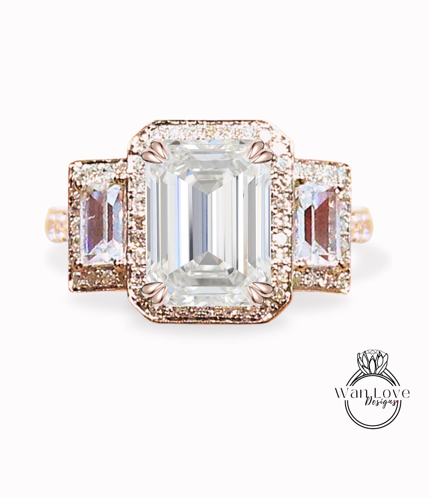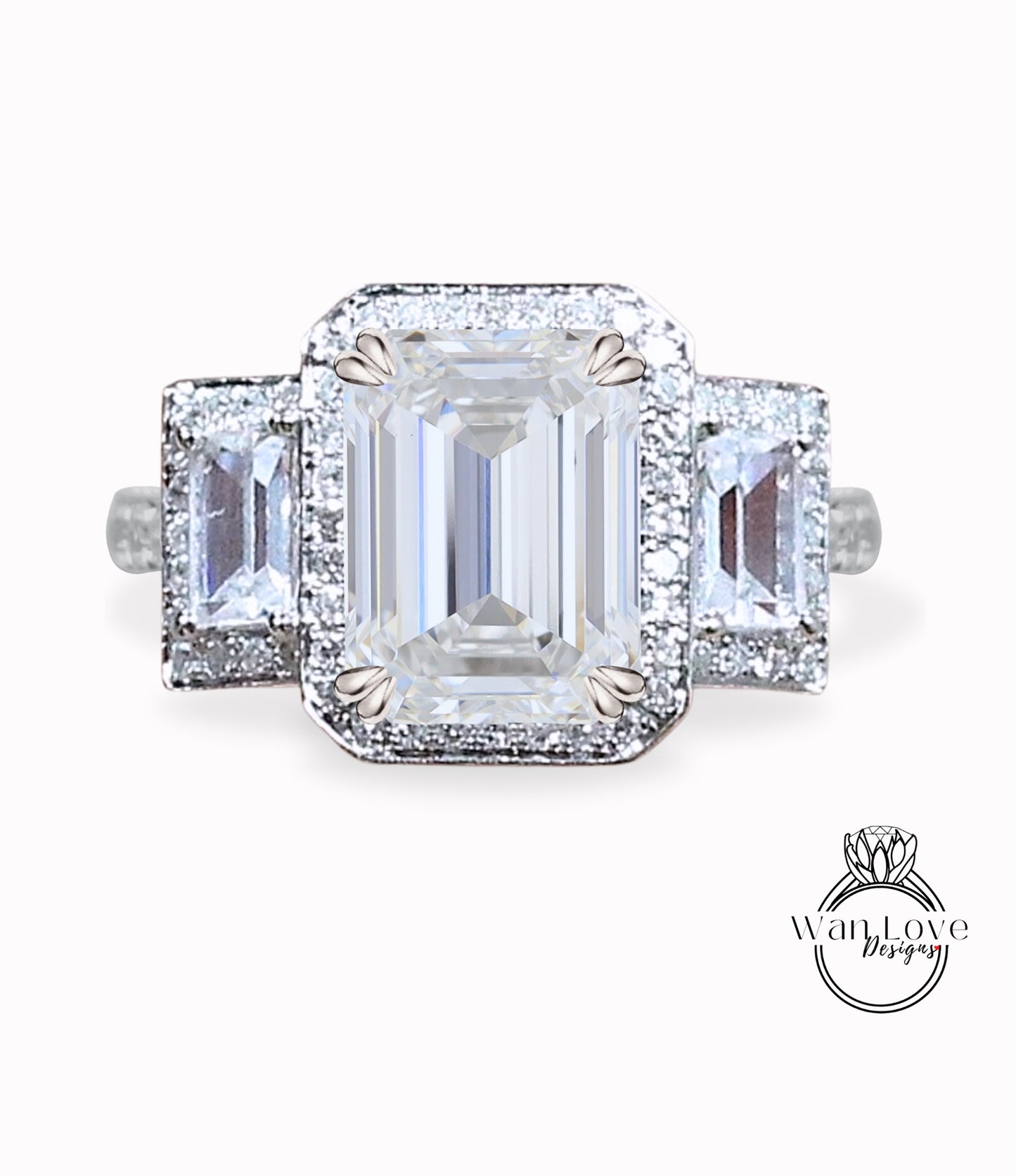 Emerald and Baguette Certified lab grown diamond Three Stone Engagement Ring, Art deco baguette ring Radiant Cut Engagement Ring,Bridal Gift