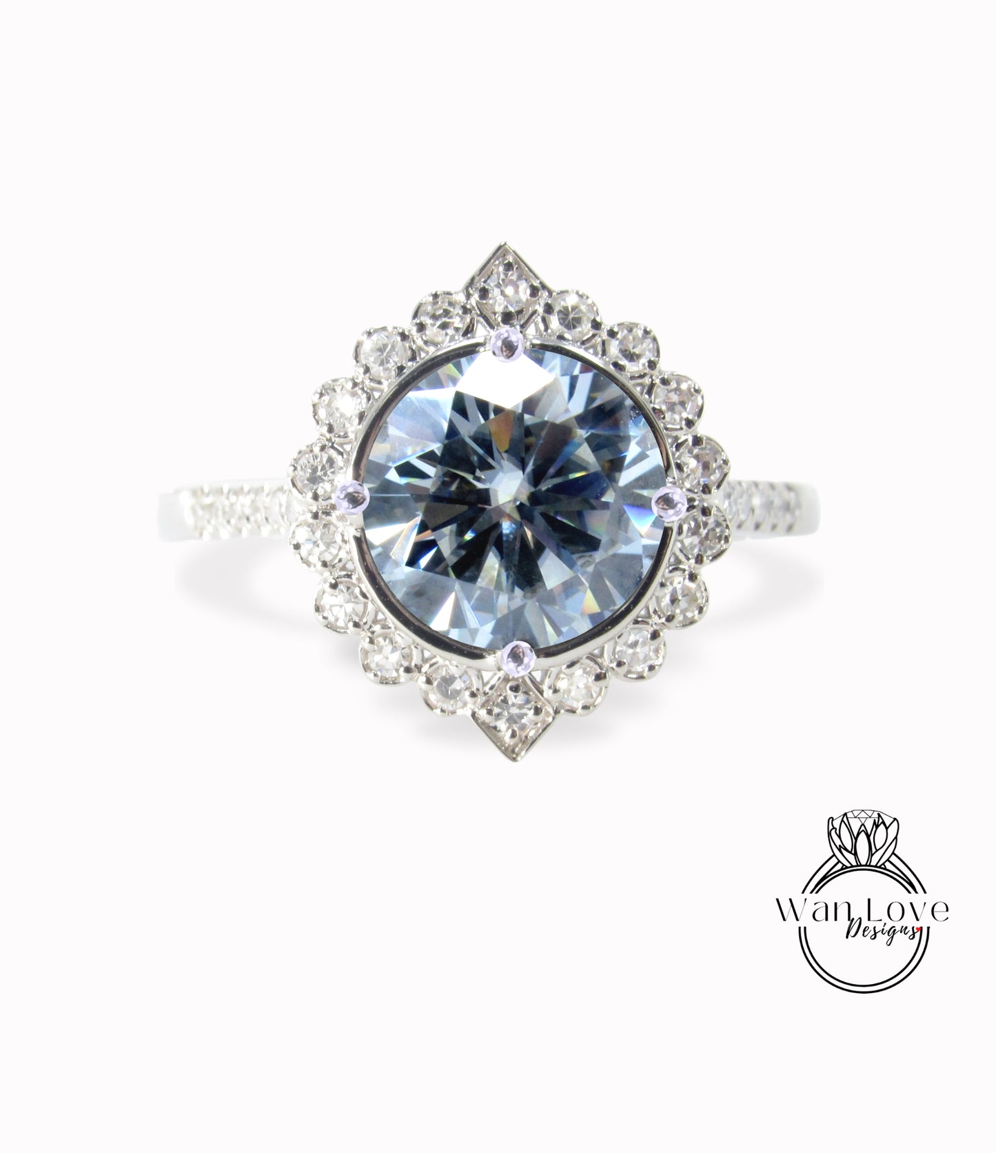 Geometric Halo Grey Moissanite Diamonds Engagement Ring Round Engagement Ring Vintage Milgrain ring antique halo moissanite bridal ring gift