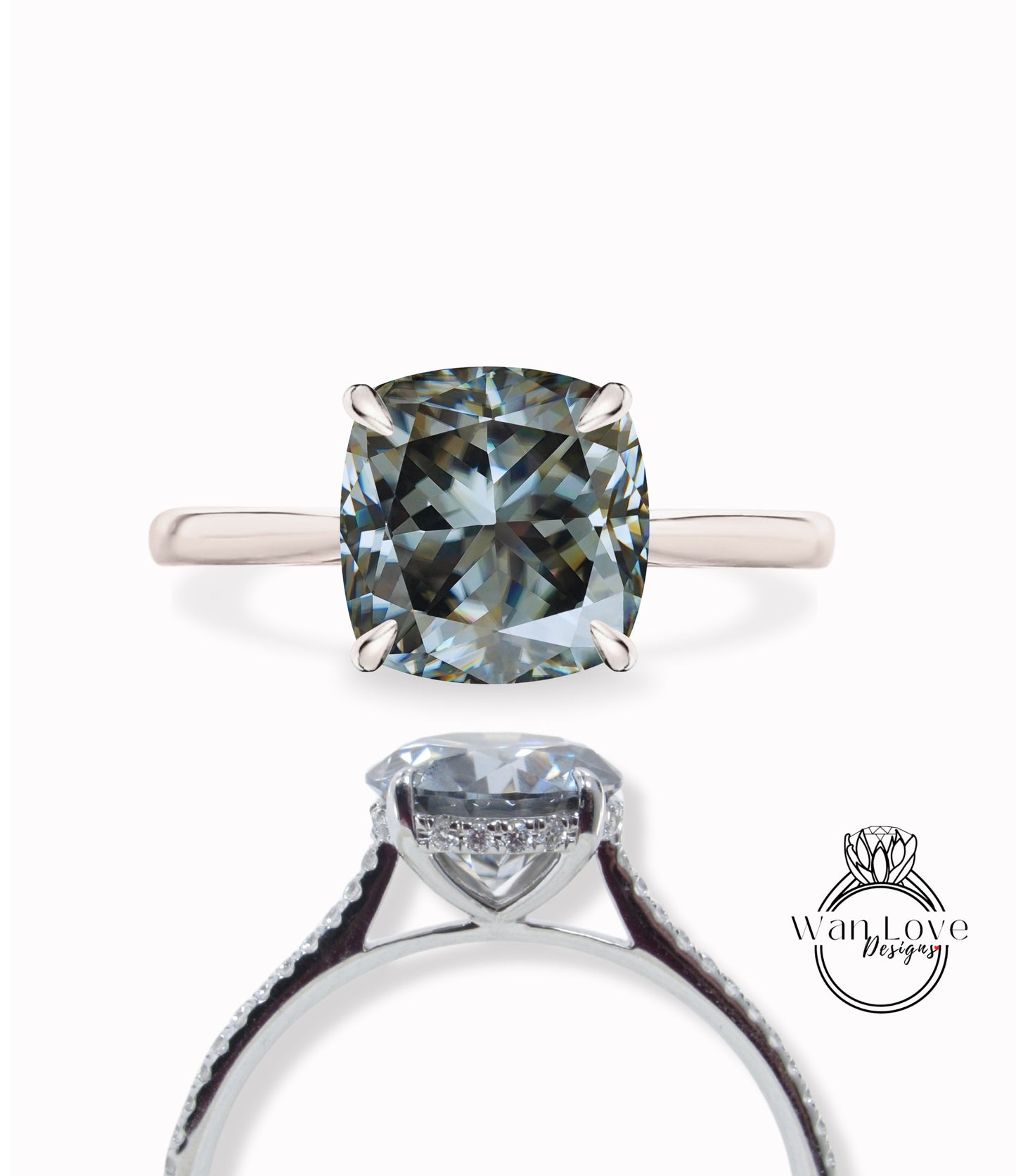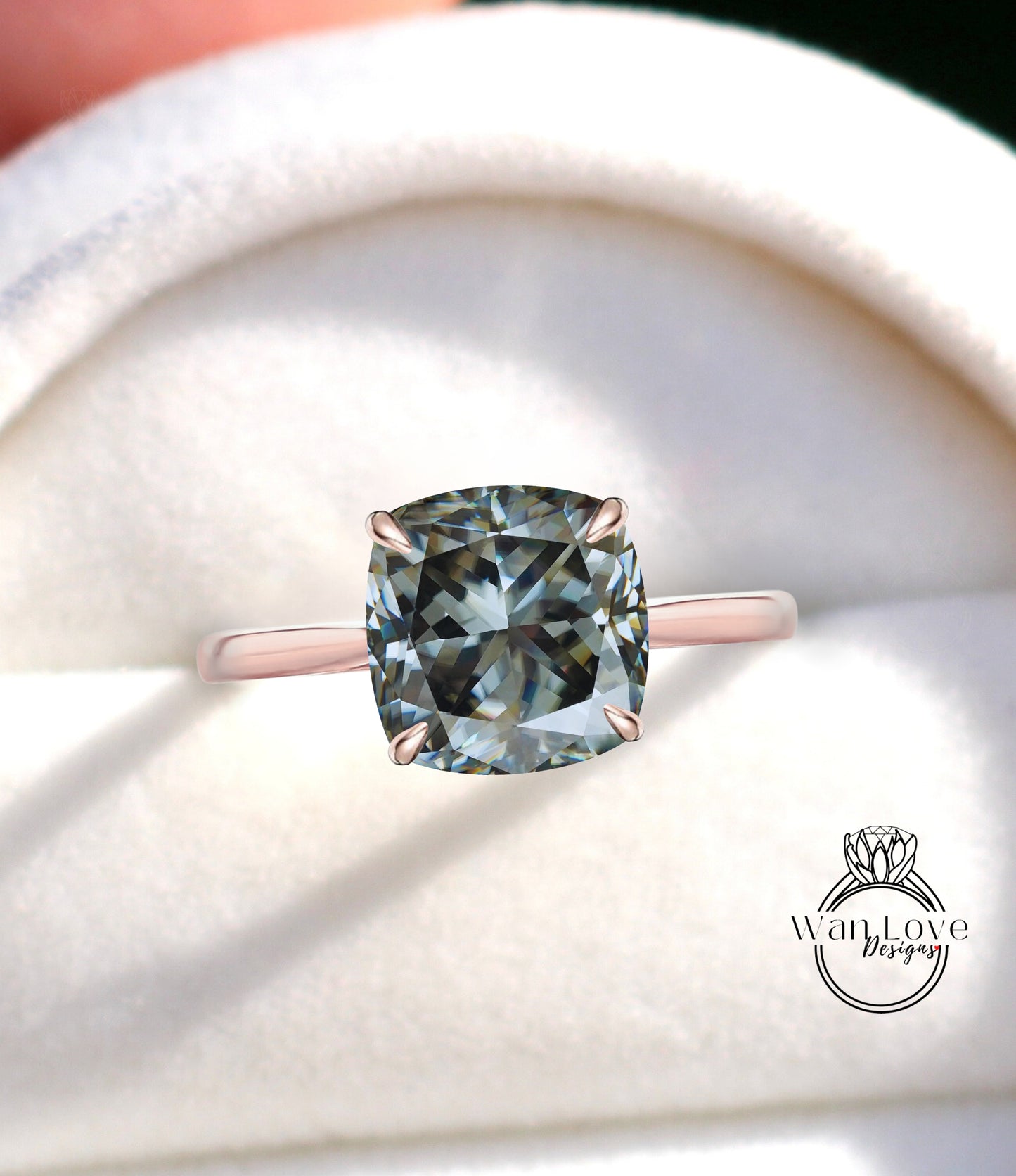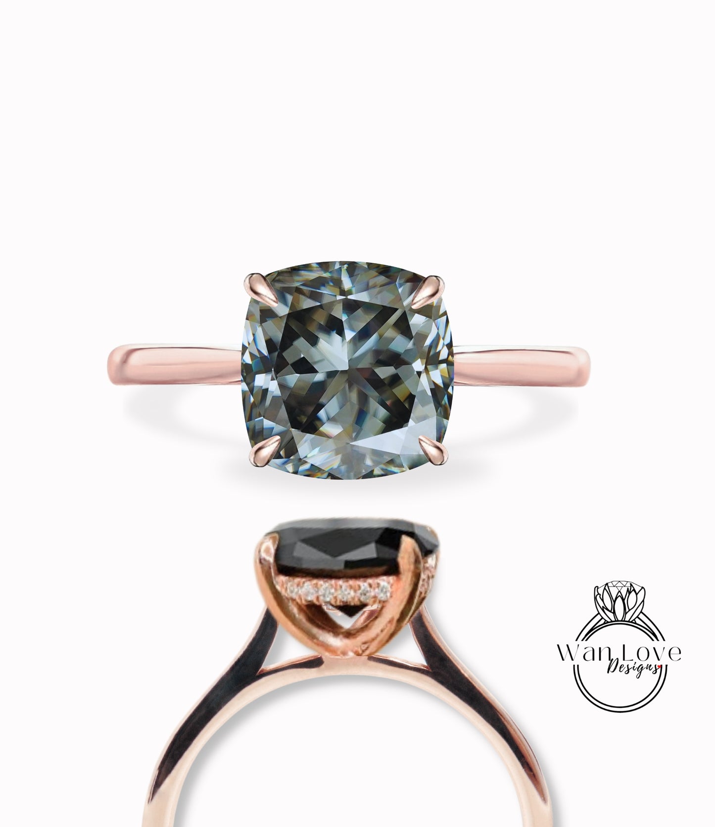 Gray Moissanite & Diamond Cushion Side Halo plain tapered band Engagement Ring, Cushion hidden Halo Diamond Moissanite Ring, Grey Engagement Diamond Ring, Anniversary Gift