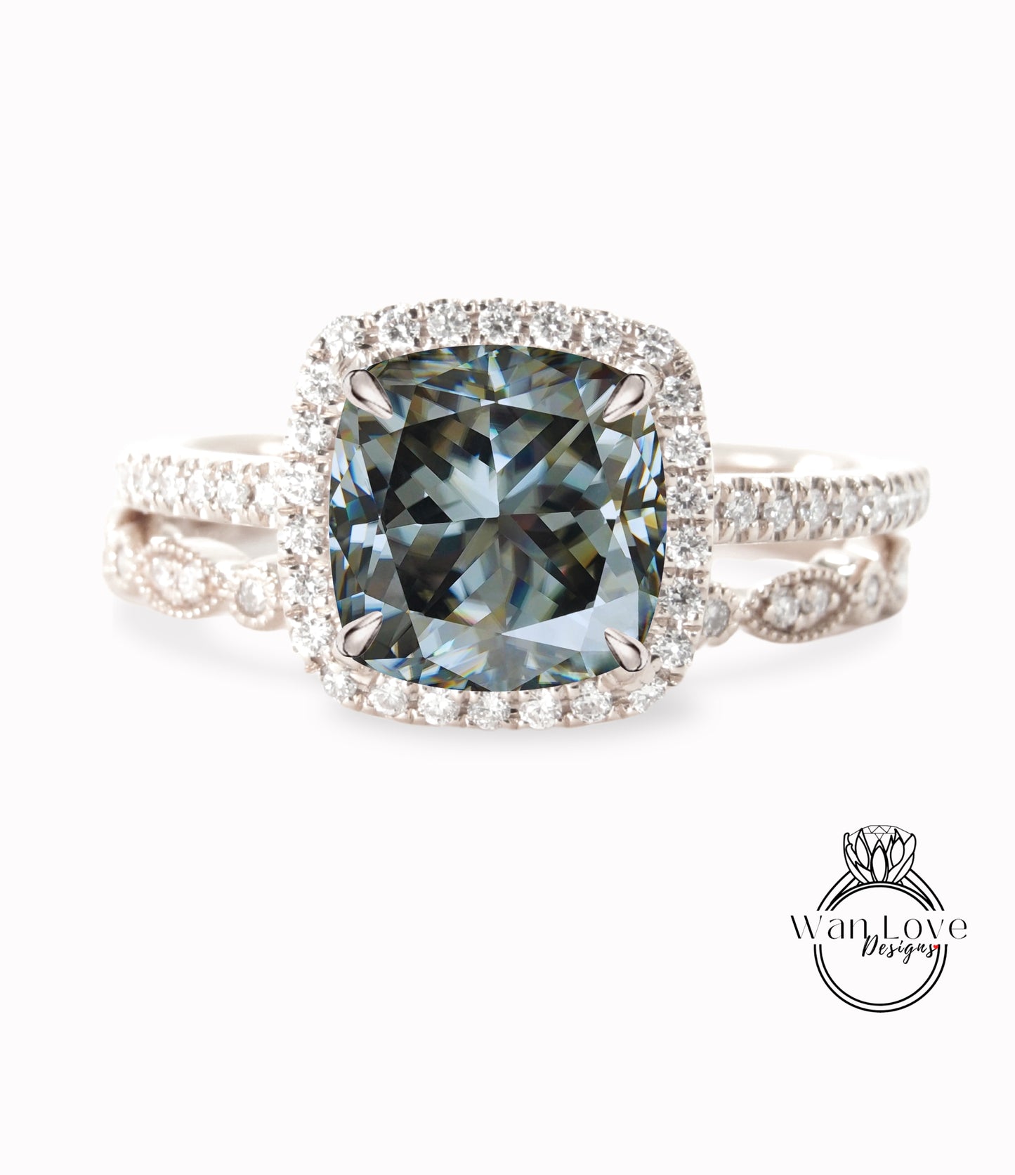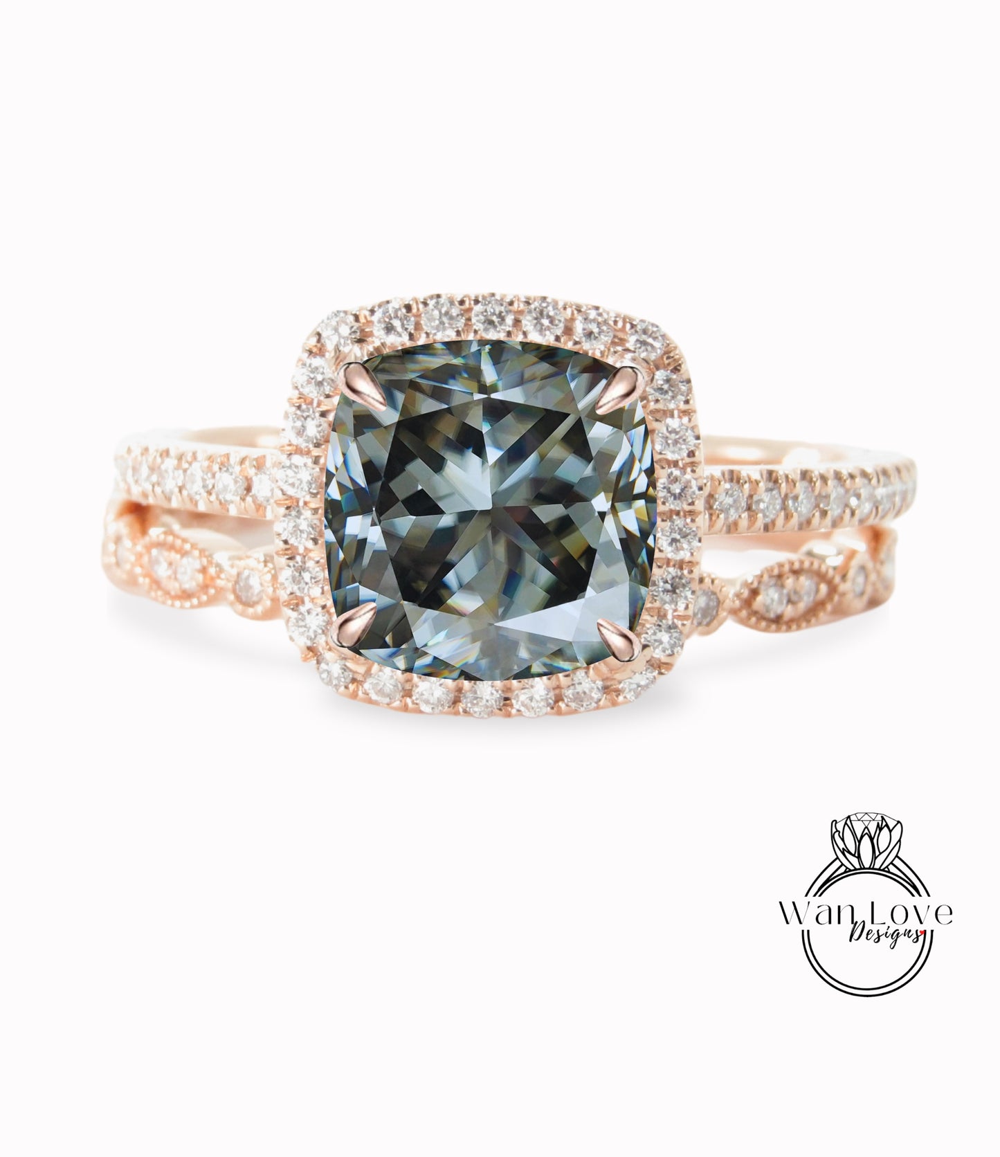Gray Moissanite & Diamond Halo Engagement Ring Set, Full Eternity Leaf Wedding Band, 14k 18k White Yellow Rose Gold-Platinum-Custom