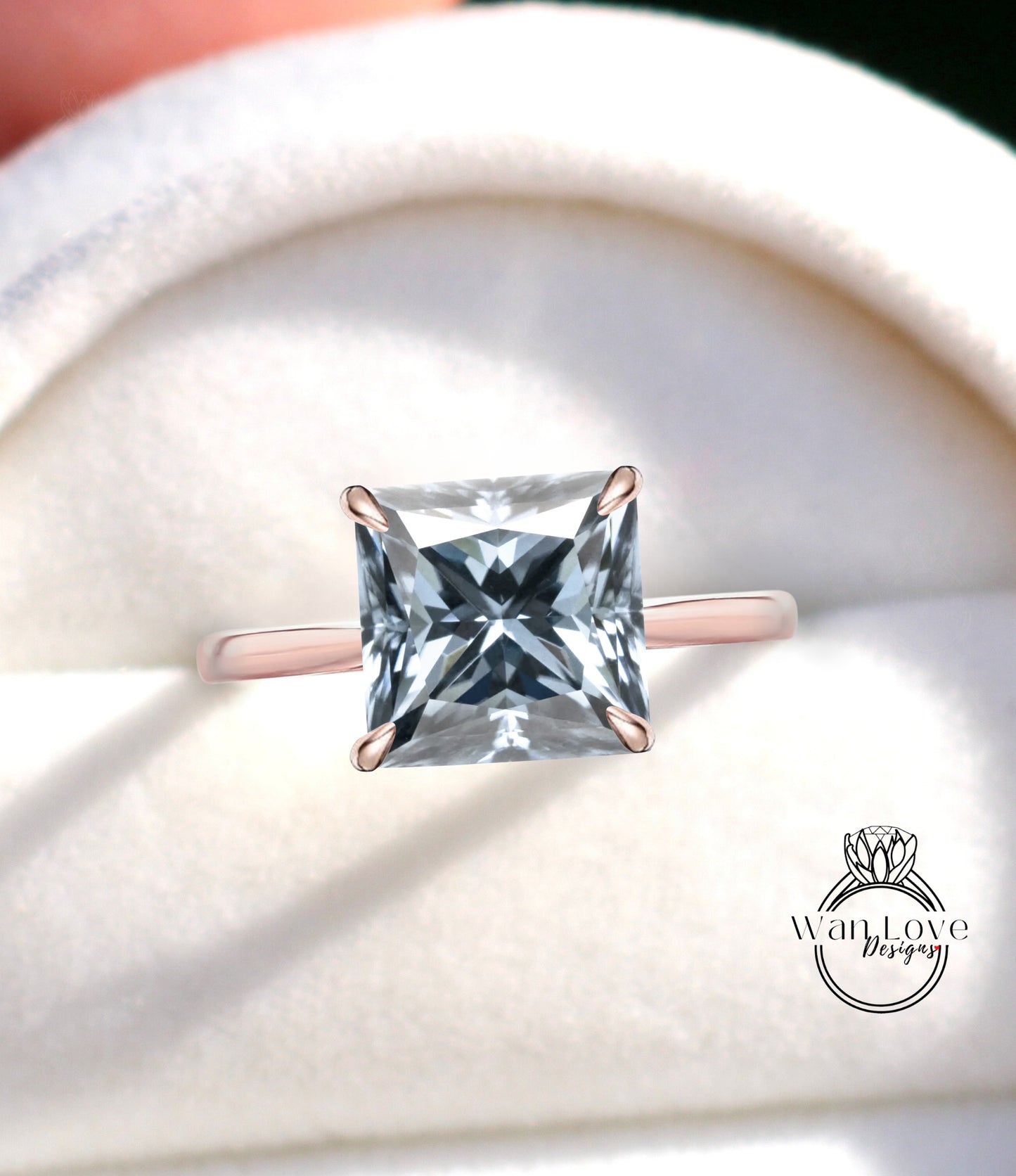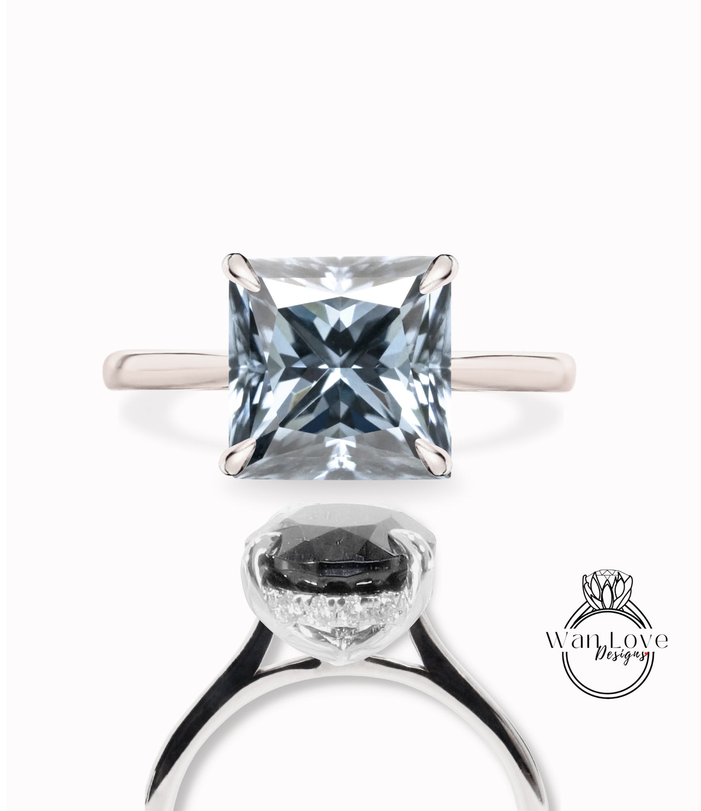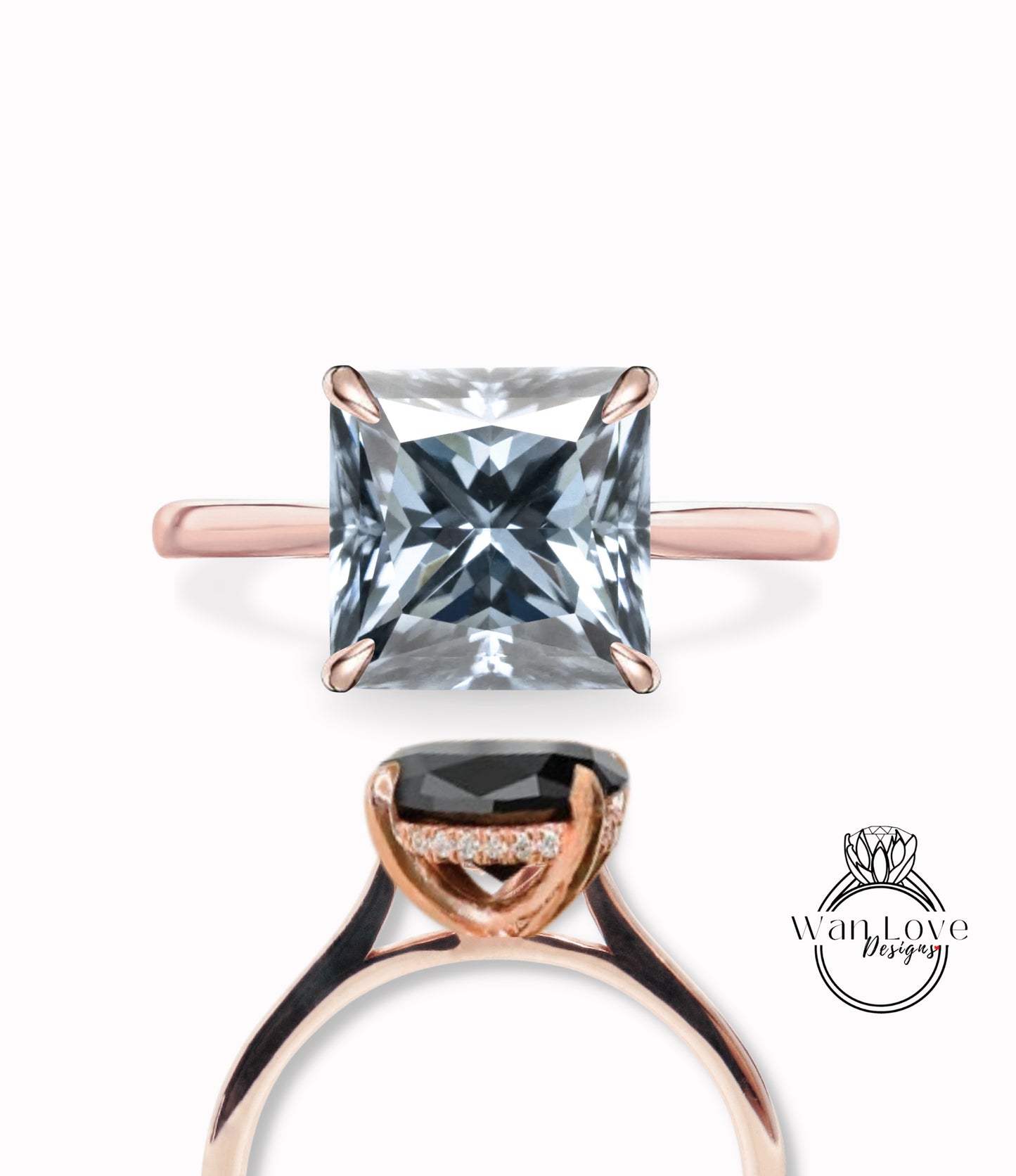 Gray Moissanite & Diamond Princess side halo plain band Engagement Ring, Cathedral Basket 14kt 18kt Gold-Platinum-Custom-Wedding, Anniversary Gift
